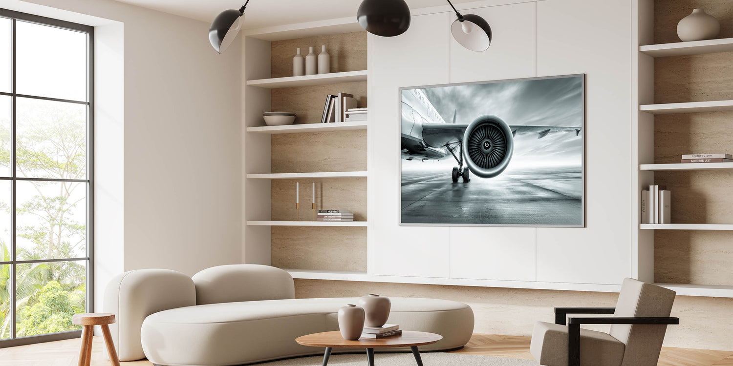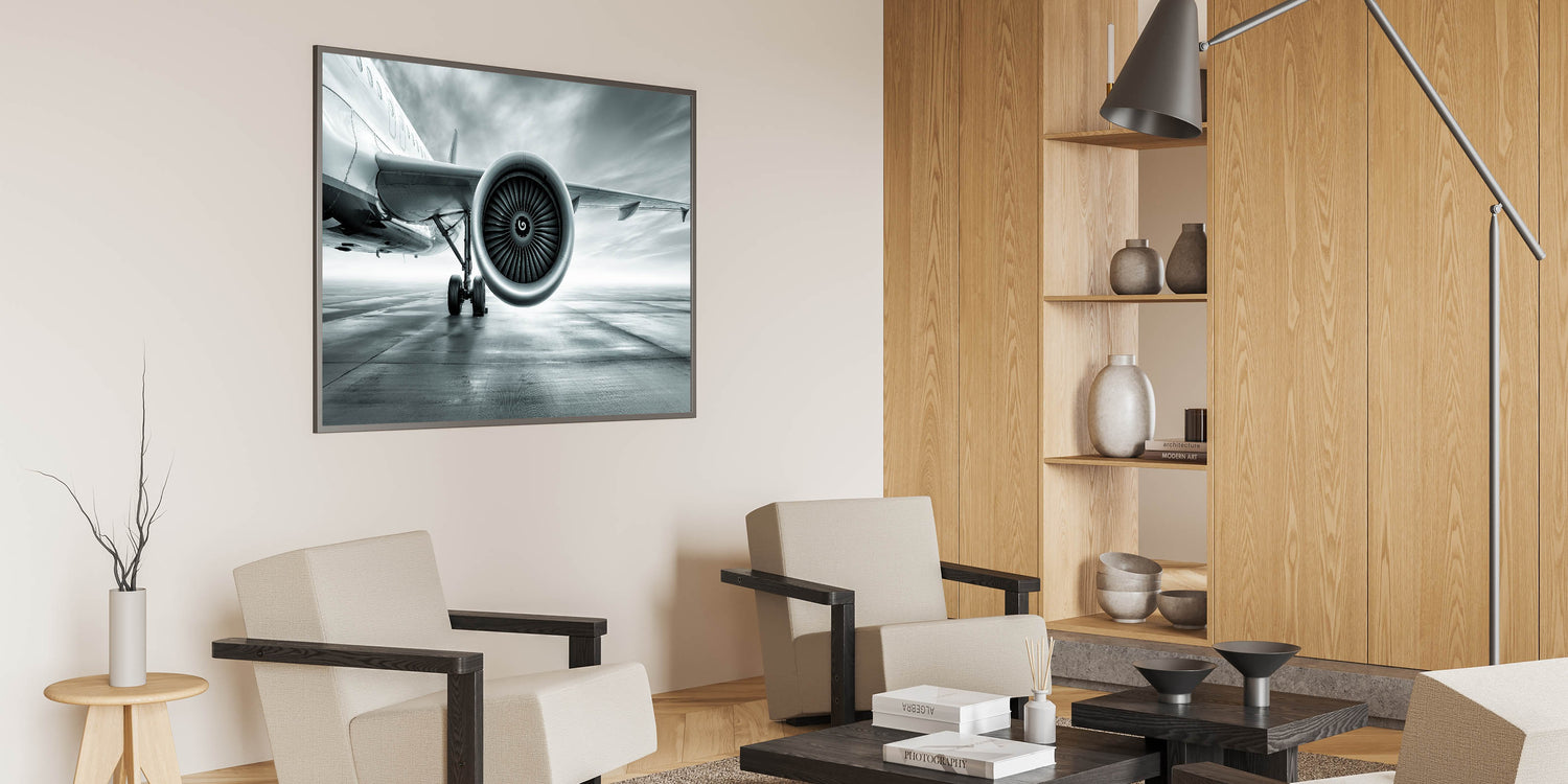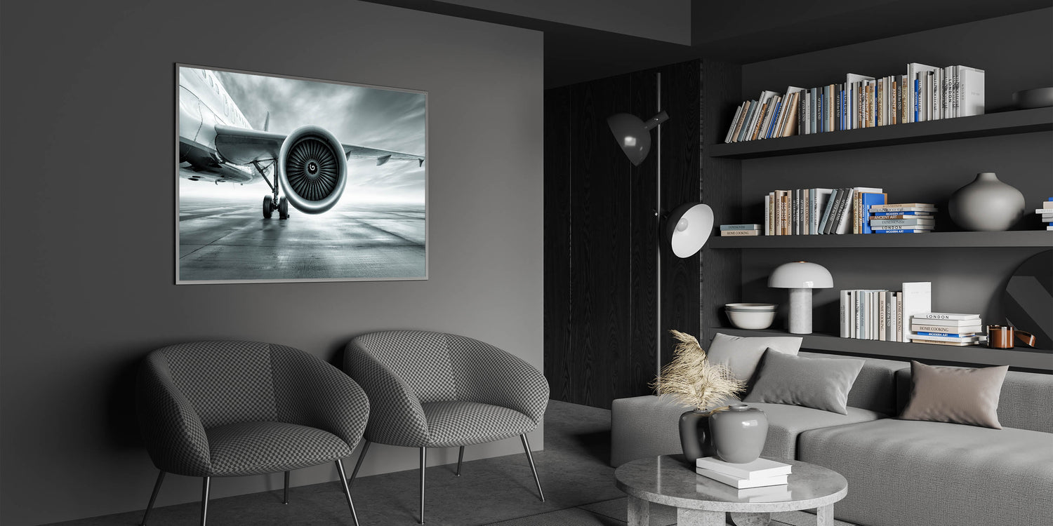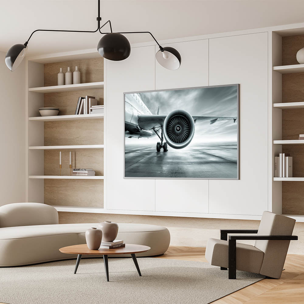 Elevate your space with this sophisticated piece that captures the essence of modern aviation in a stylish monochrome format.