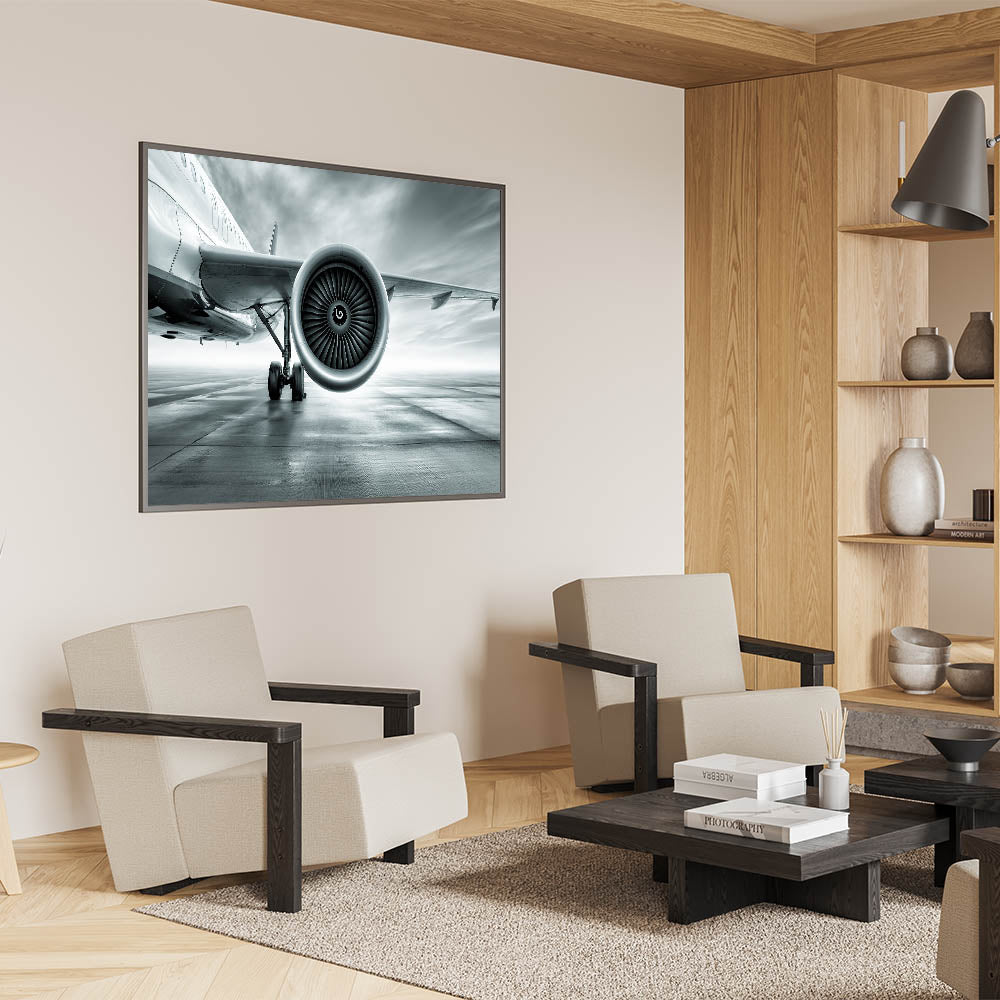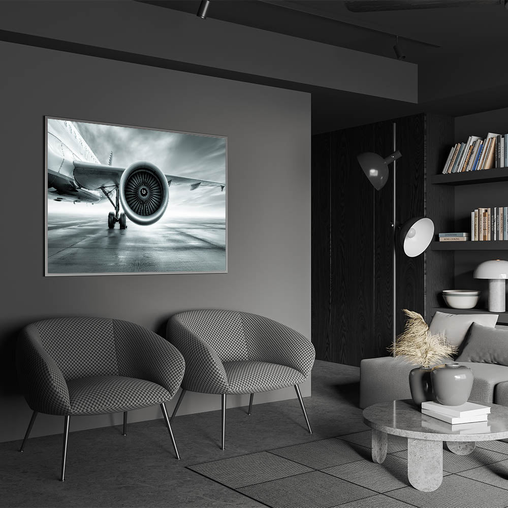 - Sleek Monochrome Design: The detailed depiction of the jet engine in black and white enhances the modern aesthetic, making it a focal point in any room.