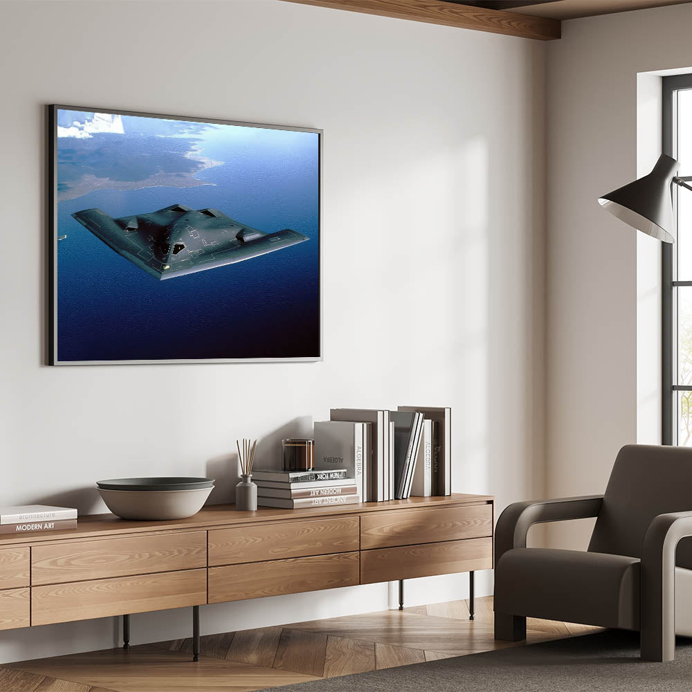 Experience the cutting edge of aviation technology with this striking wall art featuring a stealth bomber gliding silently over a vast ocean. The sleek, angular design of the bomber, coupled with the deep blue expanse below, creates a powerful and visually stunning piece. This artwork is perfect for those who appreciate the blend of modern military engineering and the serene beauty of nature. The contrast between the dark, stealthy aircraft and the bright, expansive ocean captures the duality of power and tranquility in one captivating image.