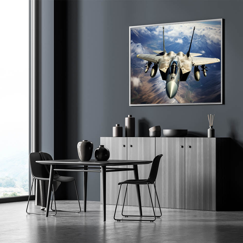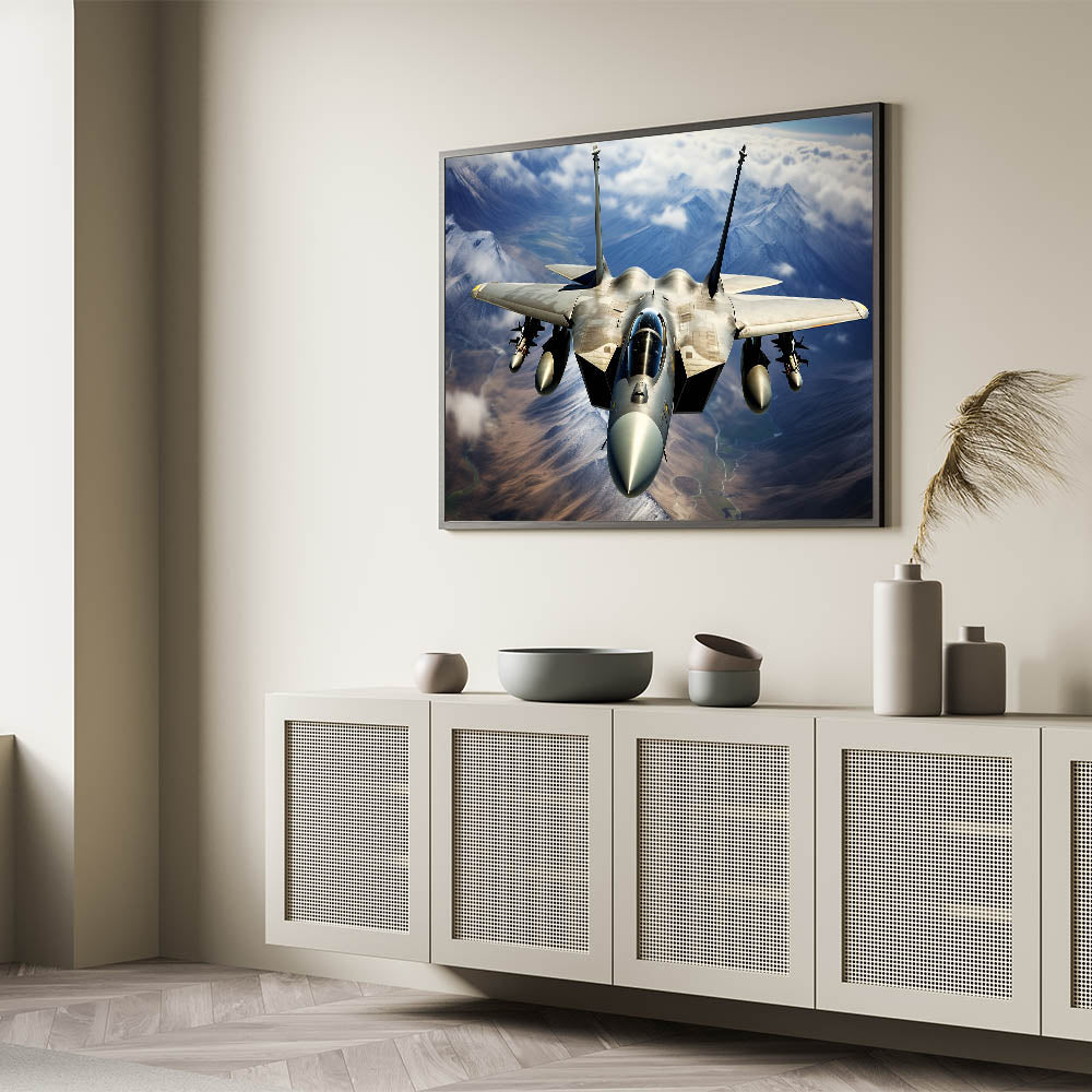 Experience the cutting-edge power of modern aviation with this breathtaking artwork featuring a stealth fighter jet in flight. The sleek, advanced design of the jet, captured from a dynamic angle, showcases the epitome of military technology. This piece is perfect for anyone who is passionate about aviation, technology, or the art of flight, adding a bold statement to any space.