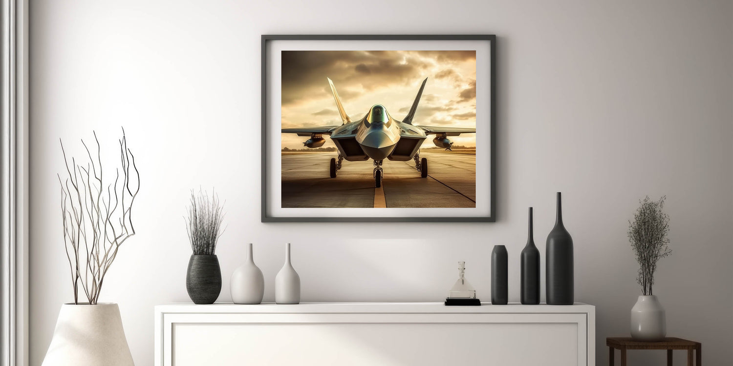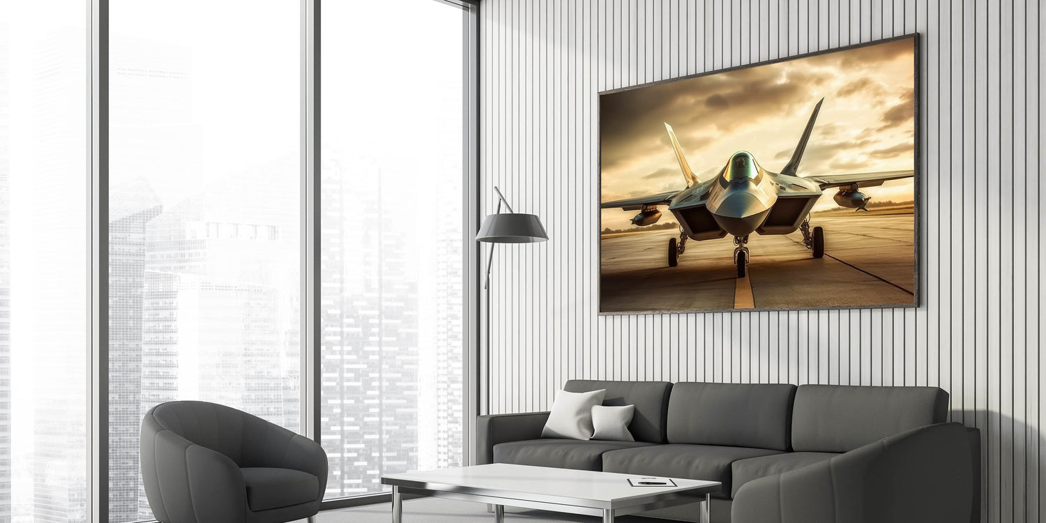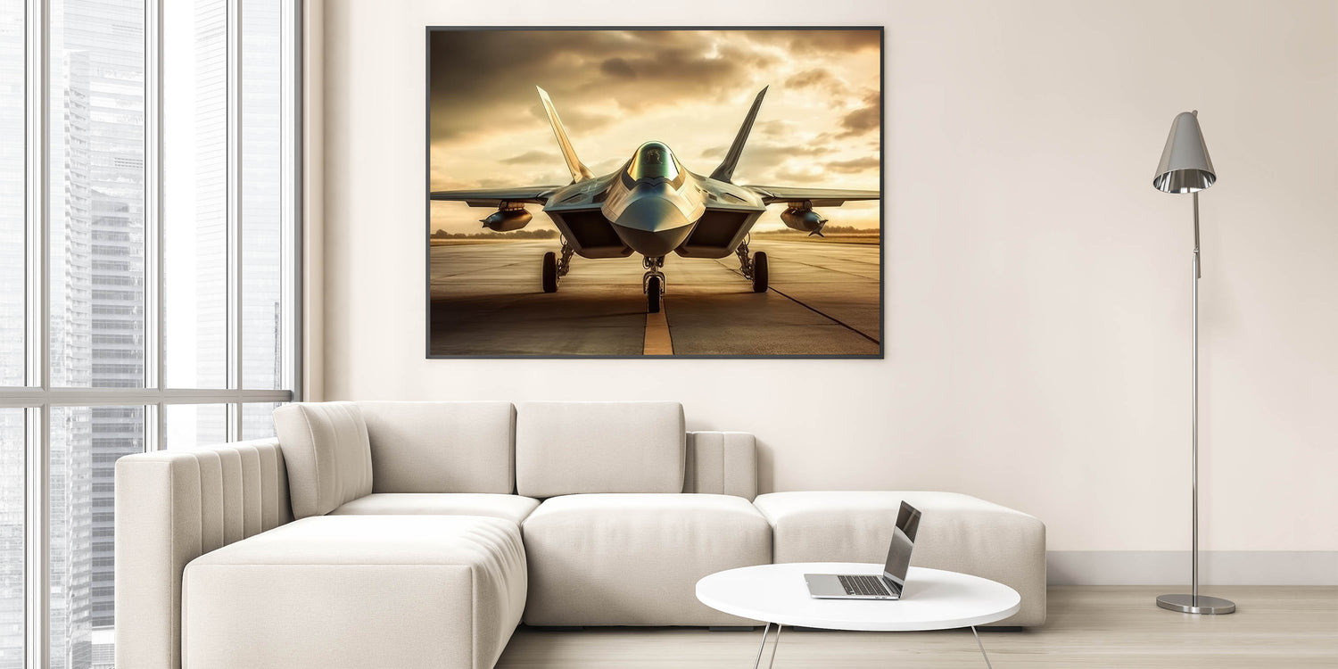 - High-definition printing that captures the intricate details of the jet and the warm, golden tones of the sunset.