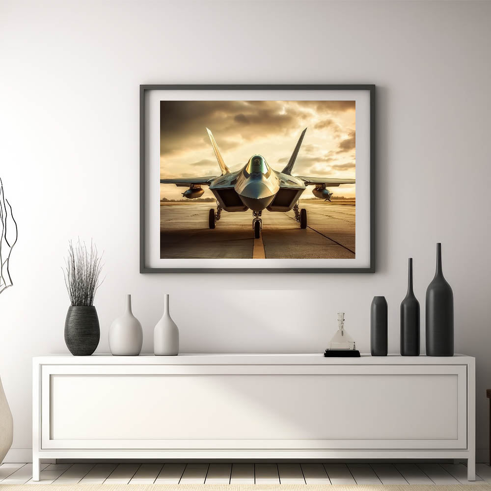 Capture the power and precision of modern military aviation with this bold wall art featuring a stealth jet poised on the runway at sunset. The front-facing view of the aircraft, highlighted by the warm glow of the setting sun, creates a dramatic and imposing image that exudes strength and sophistication. This artwork is perfect for aviation enthusiasts who appreciate the sleek design of stealth technology and the beauty of a well-executed sunset scene. The combination of the powerful jet and the serene backdrop makes this piece a standout addition to any space.
