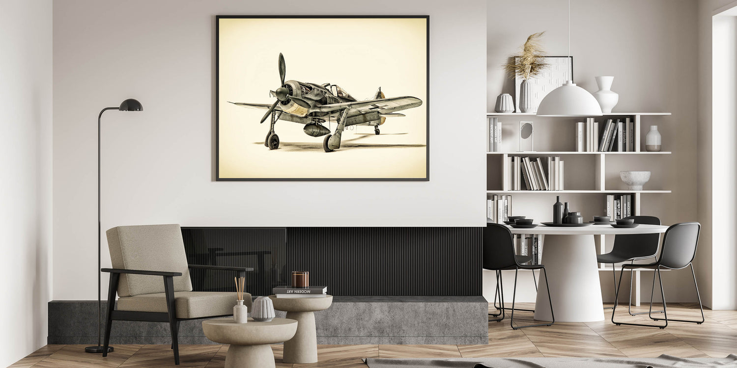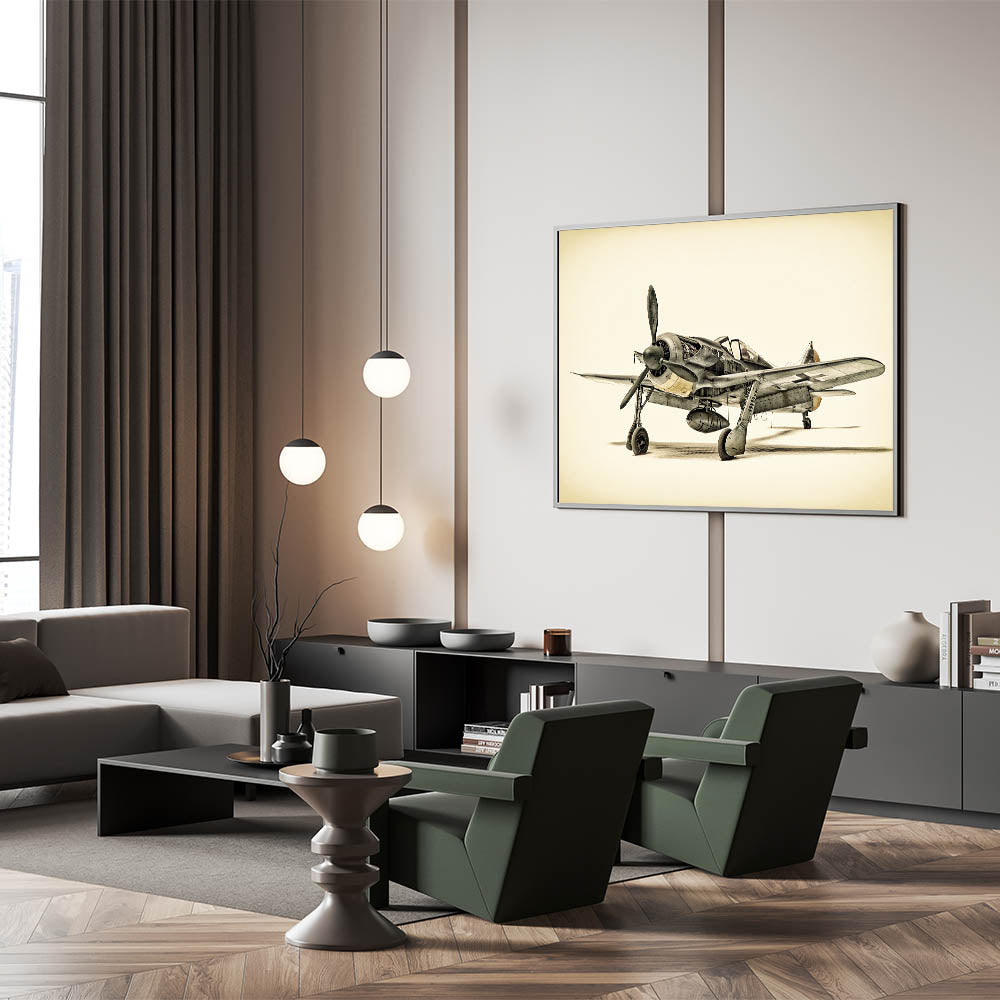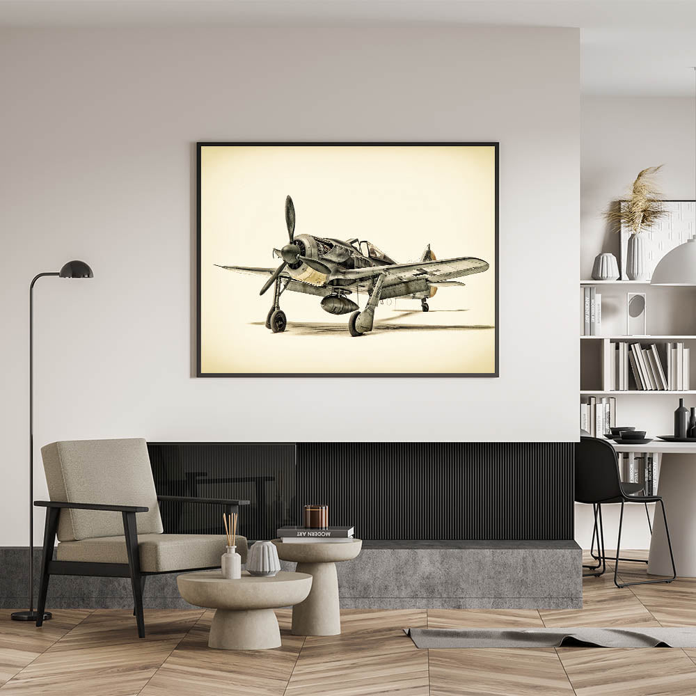 Capture the essence of WWII aviation with this Vintage Aircraft Art, featuring a detailed depiction of a fighter plane set against a sepia-toned background. This artwork perfectly combines historical significance with artistic elegance, making it an ideal piece for history enthusiasts and aviation lovers. The sepia background adds a nostalgic touch, highlighting the rugged design and storied past of the aircraft, while bringing a warm and timeless aesthetic to your space.