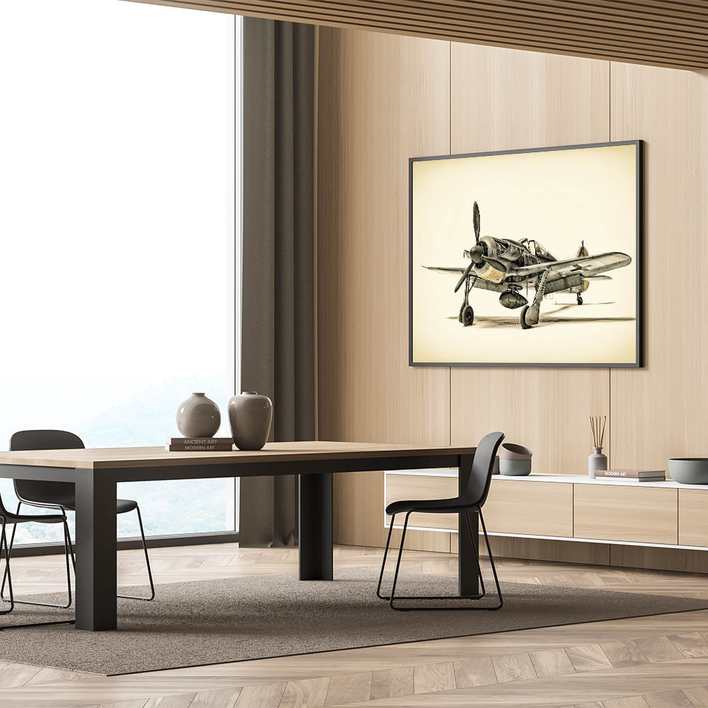 Bring the spirit of WWII aviation into your home with this evocative piece, celebrating the design and history of a legendary fighter plane.