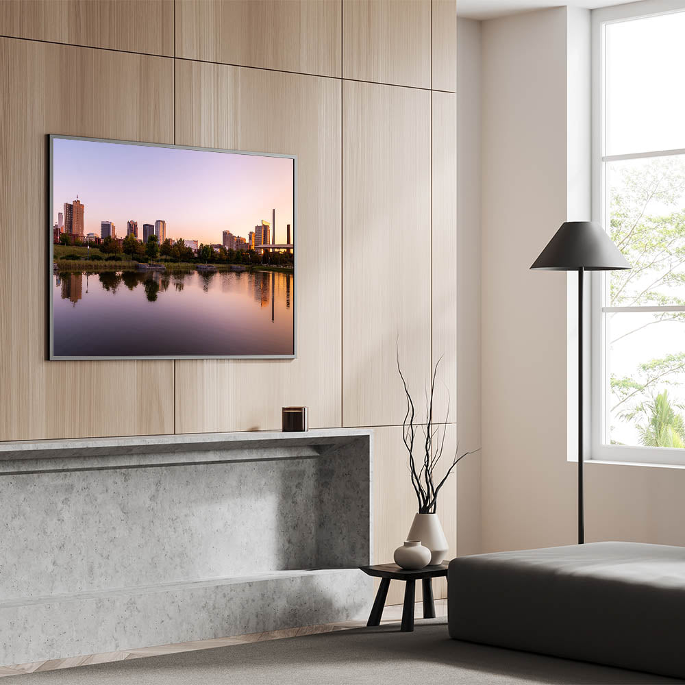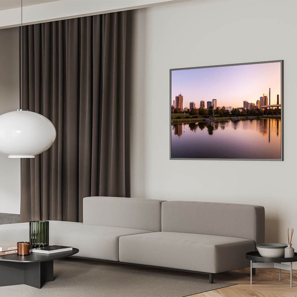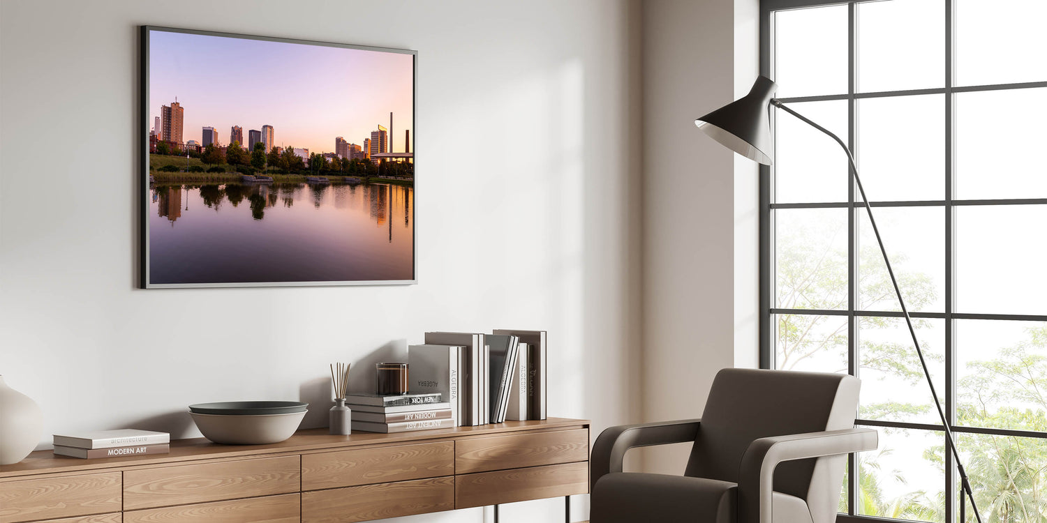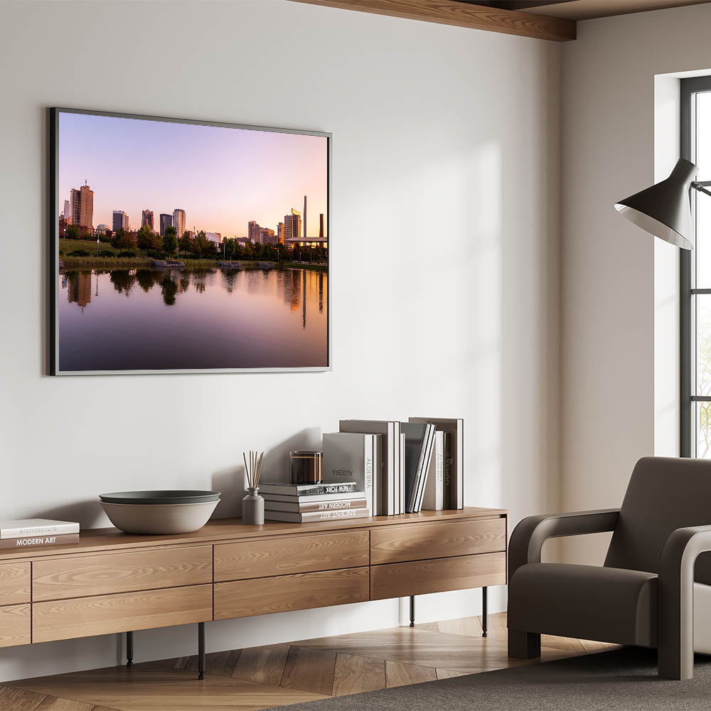 - High-Quality Photography: This Alabama cityscape print is crafted with precision to capture the fine details of Birmingham’s skyline and its reflection in the water, offering a striking view of the city at dusk.