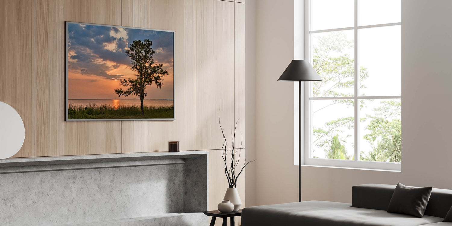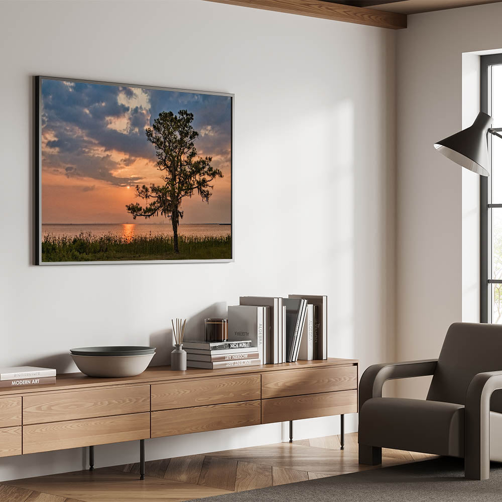 Experience the calm and tranquility of Alabama’s stunning landscapes with this beautiful Alabama wall art. The artwork captures a peaceful sunset over a serene lake, with a single tree standing tall in the foreground, bathed in the soft, golden light of the setting sun. The rich colors of the sky and water make this a perfect representation of Alabama nature prints.