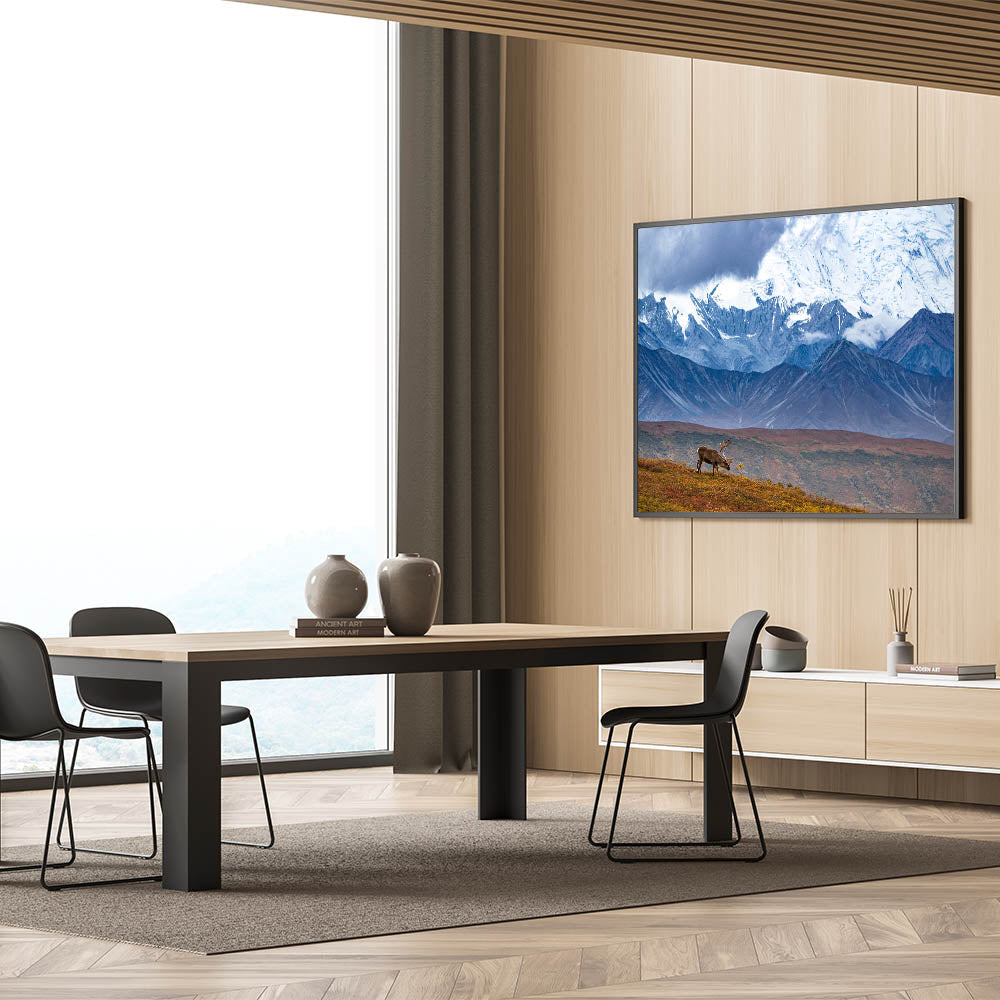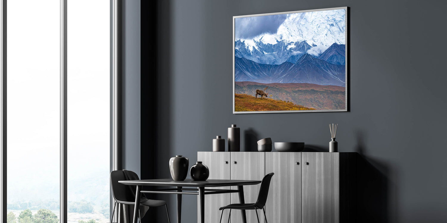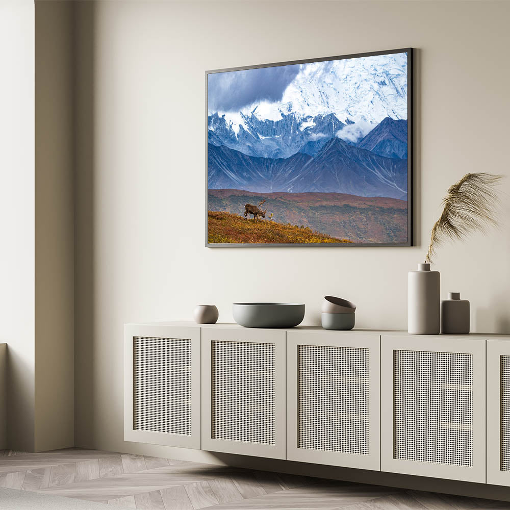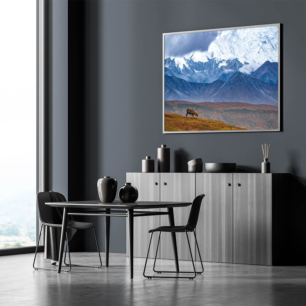 Bring the wild beauty of Alaska into your space with this stunning Alaska landscape art featuring a majestic caribou grazing in the vast wilderness of Denali National Park. The impressive snow-covered peaks serve as a striking backdrop, highlighting the rugged beauty of the Alaskan frontier. This Alaskan nature photography captures the grandeur of the landscape and the solitude of one of Alaska’s most iconic creatures.