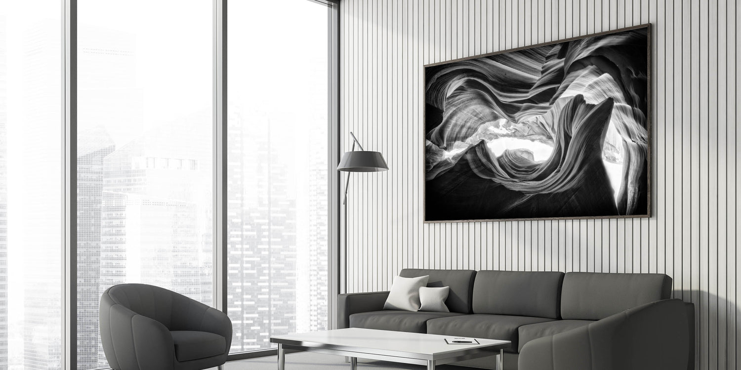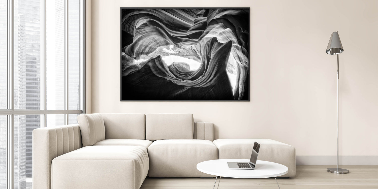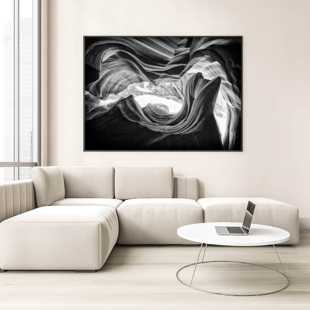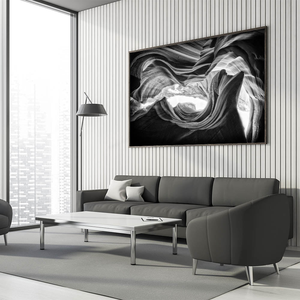 This black and white Antelope Canyon wall art brings the stunning textures and flowing shapes of Arizona’s red rock formations into sharp, dramatic focus. The absence of color highlights the intricate curves of the canyon, offering a timeless and elegant feel to your space. This unique piece captures the breathtaking beauty of nature's artistry in a monochrome palette, perfect for adding a modern yet natural aesthetic to your home.