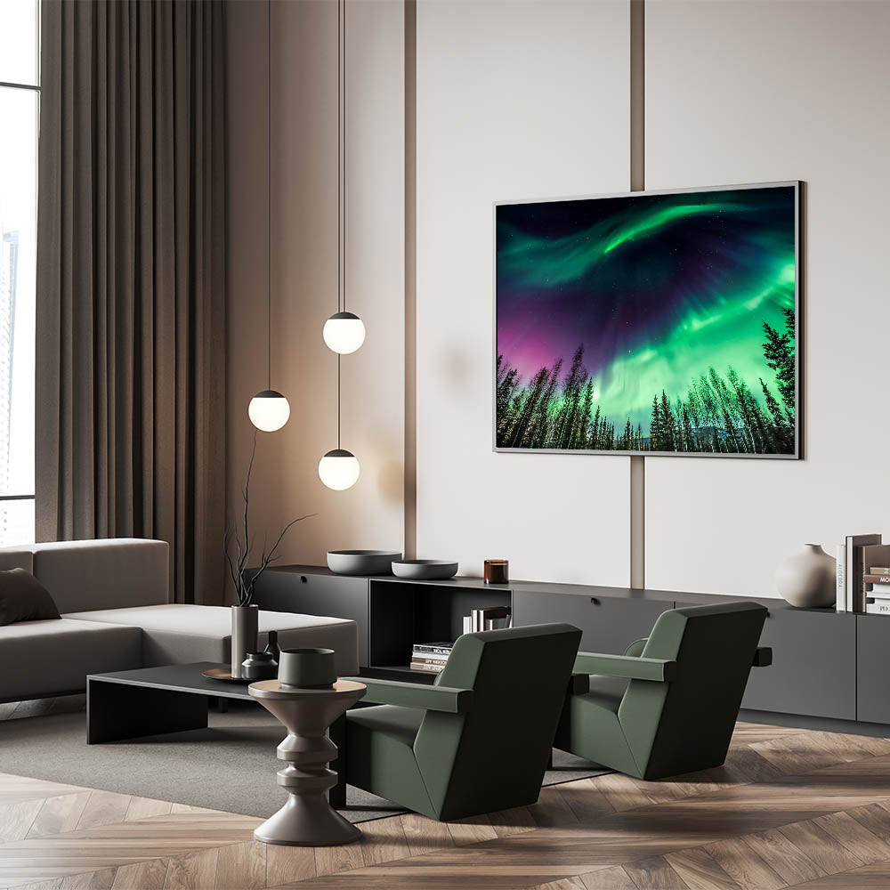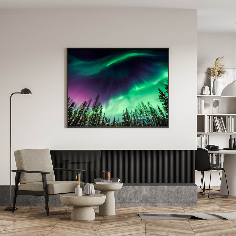 Capture the magic of Alaska’s skies with this breathtaking wall art featuring the Aurora Borealis. This stunning photograph showcases the vibrant green and purple hues of the Northern Lights, set against a backdrop of towering trees and a starlit sky. The dramatic contrast between the night sky and the glowing aurora creates a mesmerizing scene, making it a perfect addition to any room in your home or office.