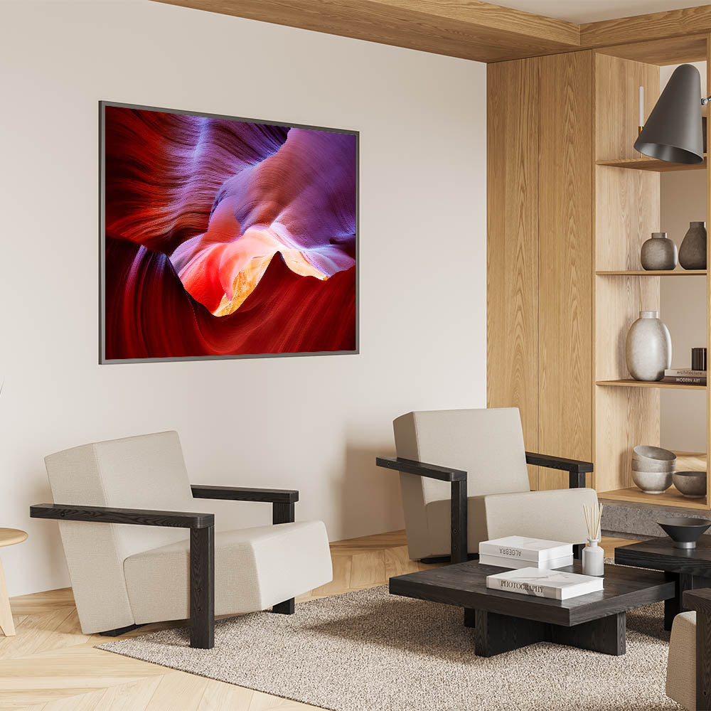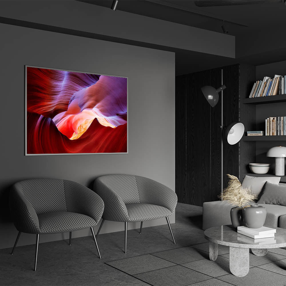 This colorful Antelope Canyon wall art brings the swirling beauty of Arizona’s red rock formations to life with vibrant hues of purple, red, and soft yellows. The striking contrast of colors and flowing curves of the canyon make this artwork a stunning addition to any room. The natural elegance of this stunning Antelope Canyon photography will draw attention and create a serene yet bold atmosphere in your space.