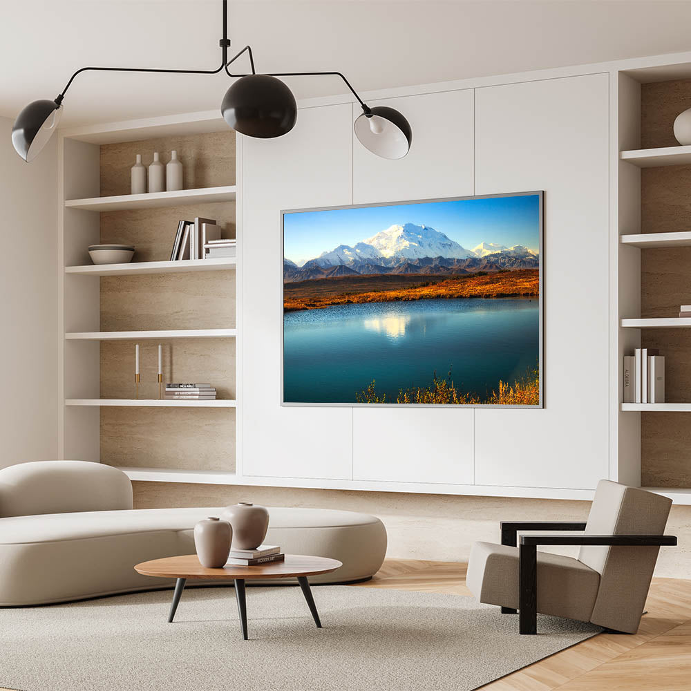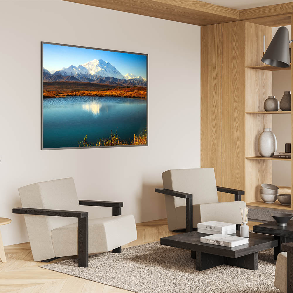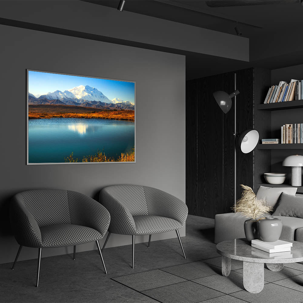 Experience the grandeur of Denali, Alaska’s tallest mountain, with this stunning wall art featuring the iconic snow-capped peaks reflected in a tranquil lake. The rich autumnal tones of the surrounding wilderness add a warm glow to this breathtaking landscape, making it a perfect addition to any home or office decor. This piece captures the essence of Alaska’s untouched beauty, combining the serenity of water with the majesty of towering mountains.