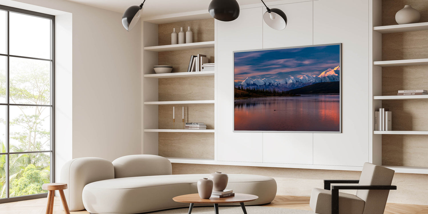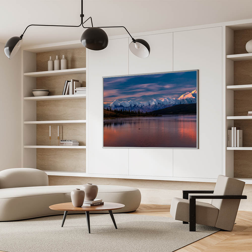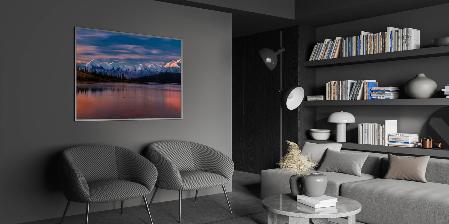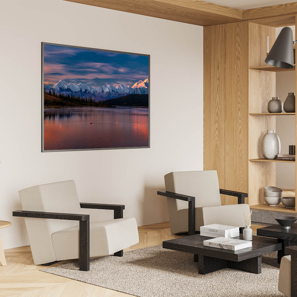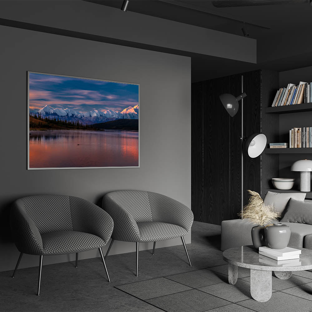 - Vivid Colors: This print features a stunning mix of sunset hues, from deep reds to soft pinks, set against the backdrop of Denali’s iconic peaks.