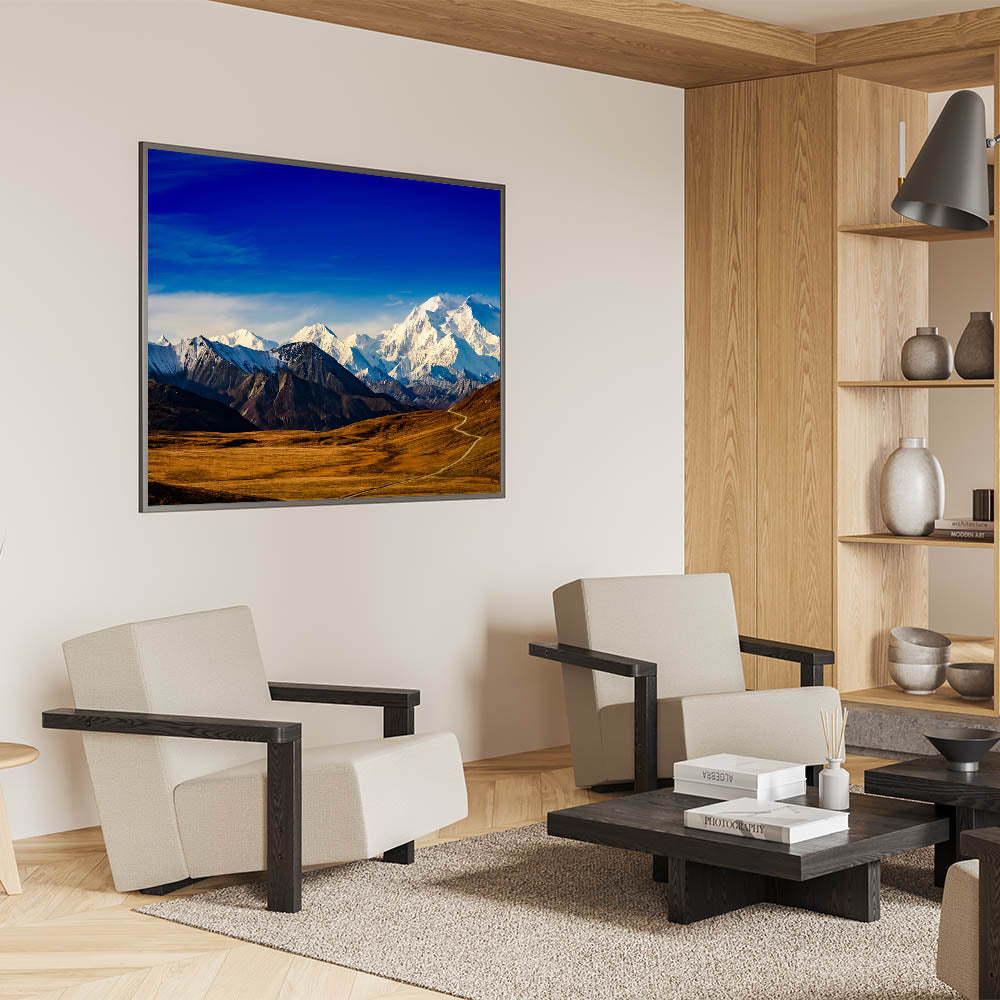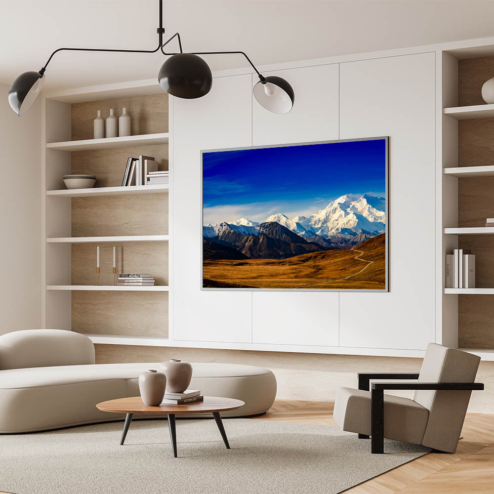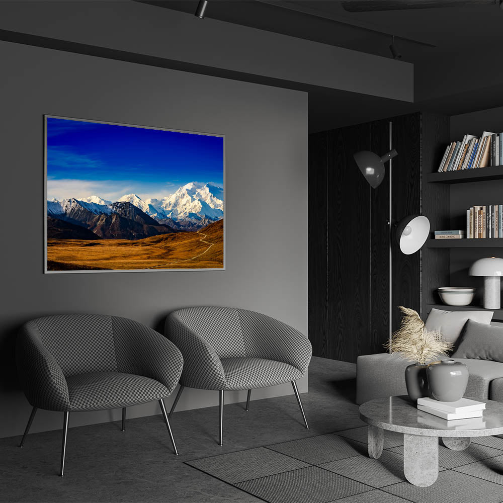 - Vivid Detail: This print features the striking contrast of Mount Denali’s snow-capped peaks against the vivid blue sky, perfect for nature lovers.