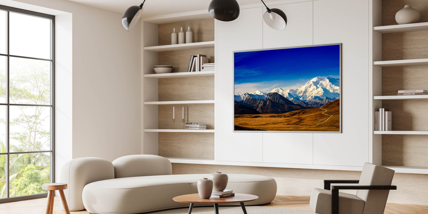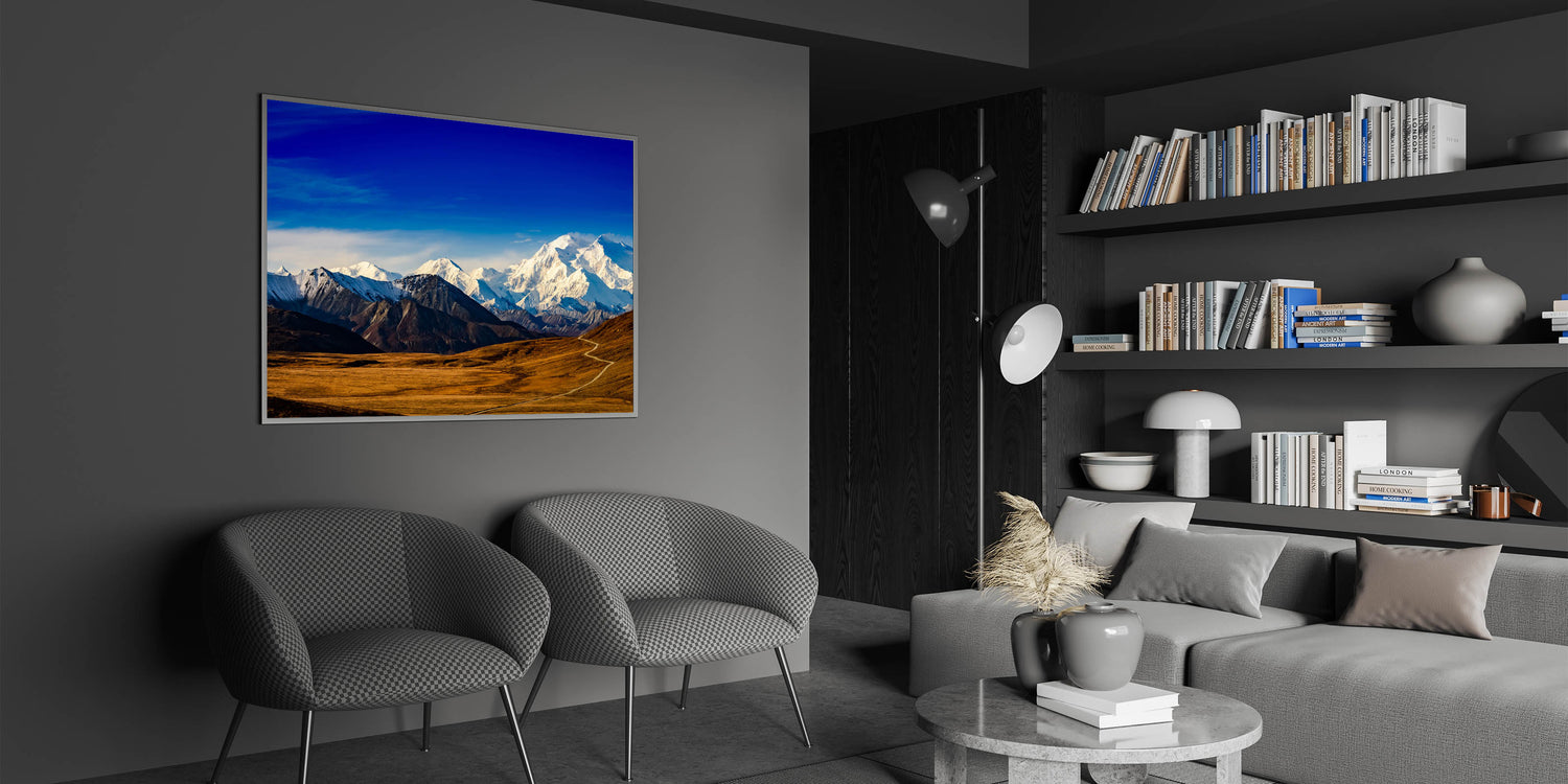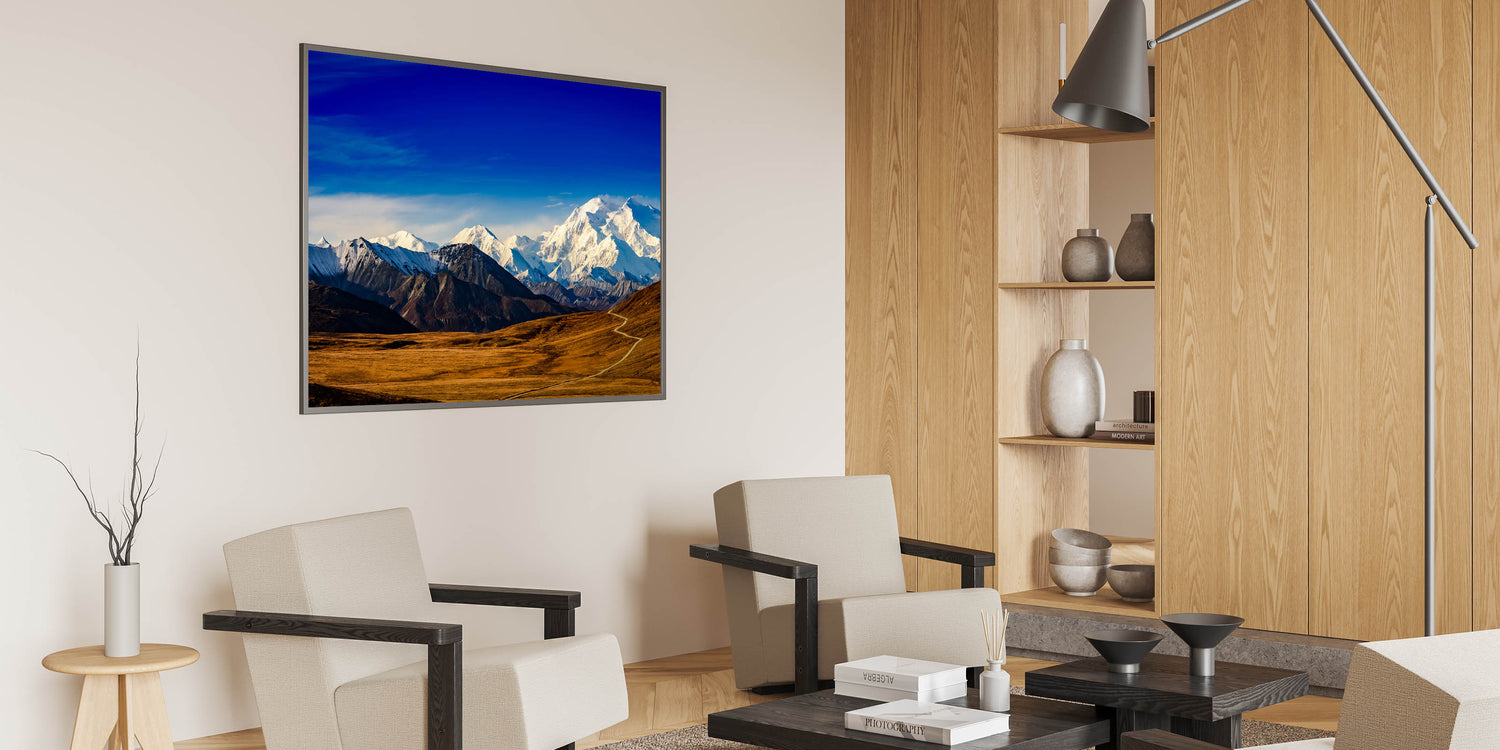 - Vivid Detail: This print features the striking contrast of Mount Denali’s snow-capped peaks against the vivid blue sky, perfect for nature lovers.