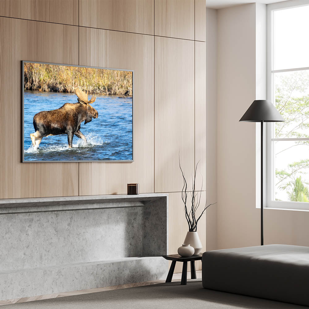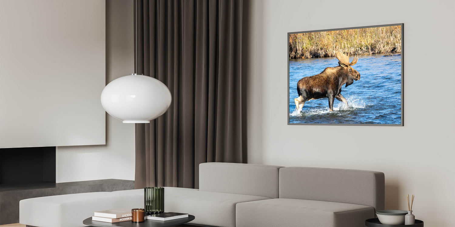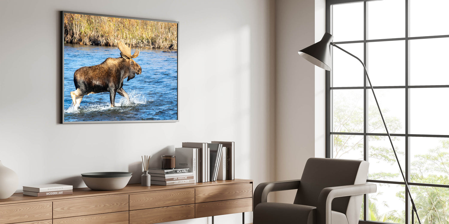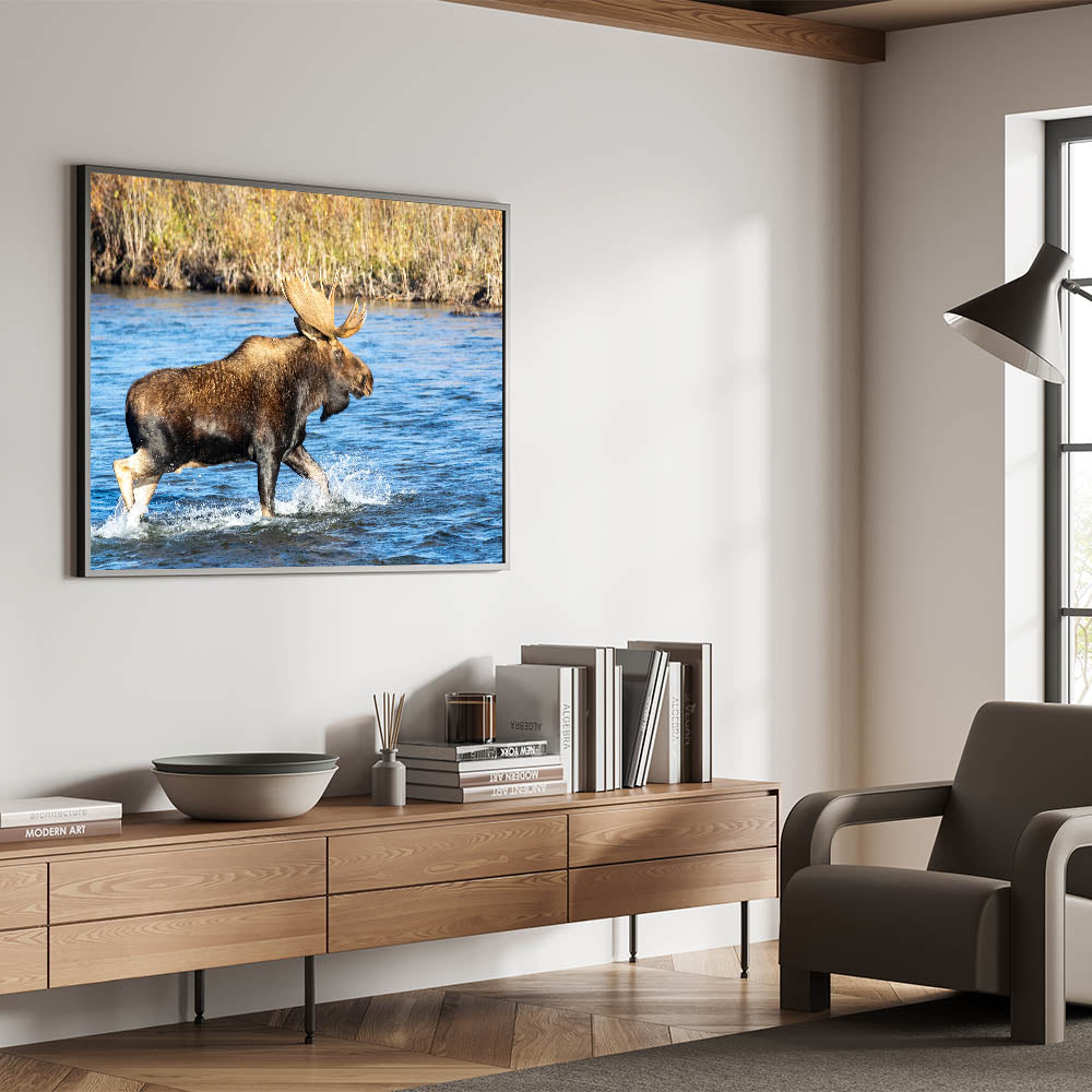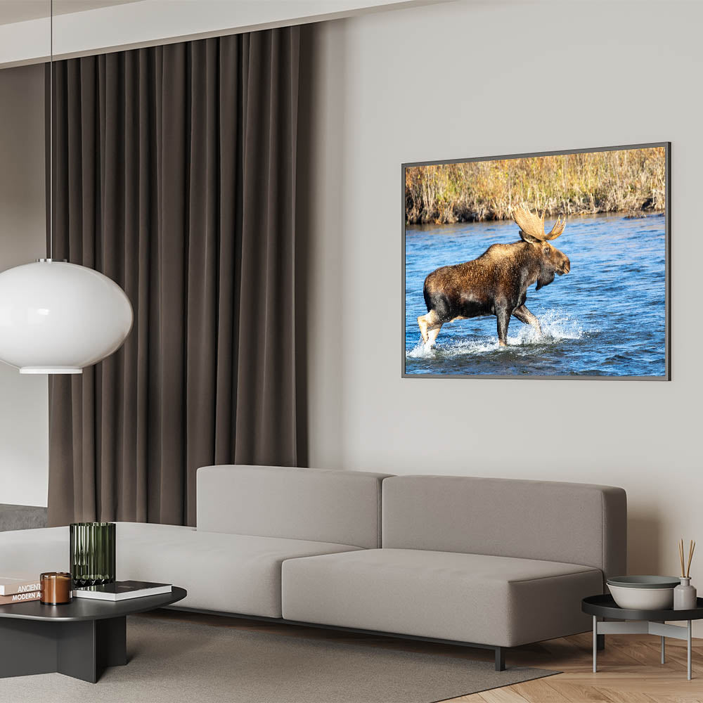 Celebrate the wild beauty of Alaska with this stunning Denali wildlife art, showcasing a majestic moose wading through an Alaskan river. The crisp water splashes as the moose strides confidently through the wilderness, embodying the rugged spirit of Denali National Park. The rich details of the moose's fur and the surrounding natural elements make this artwork a perfect tribute to Alaska’s diverse wildlife.