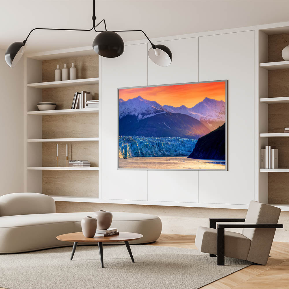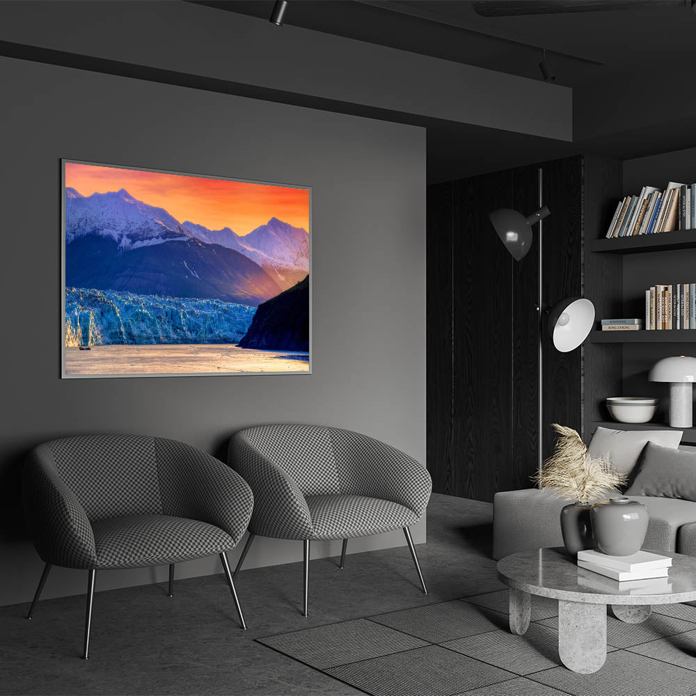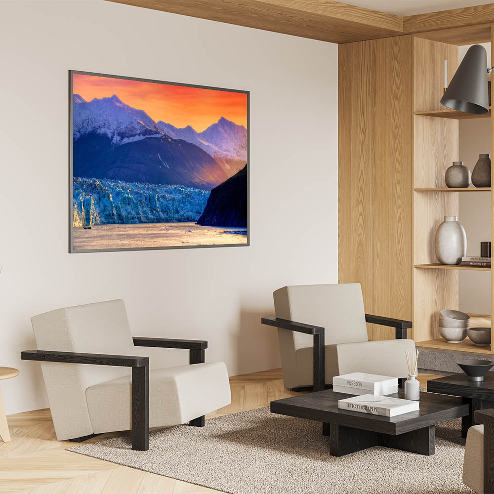 Bring the mesmerizing beauty of Alaska into your home with this stunning wall art, showcasing a glacier glowing beneath the warm hues of an Alaskan sunset. The serene landscape of snow-capped mountains, glaciers, and vibrant skies is the perfect embodiment of Alaska’s breathtaking wilderness. This beautiful Alaska scenery will transform any space with its unique charm.
