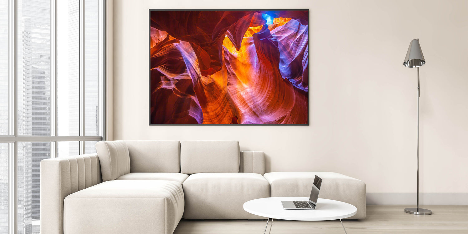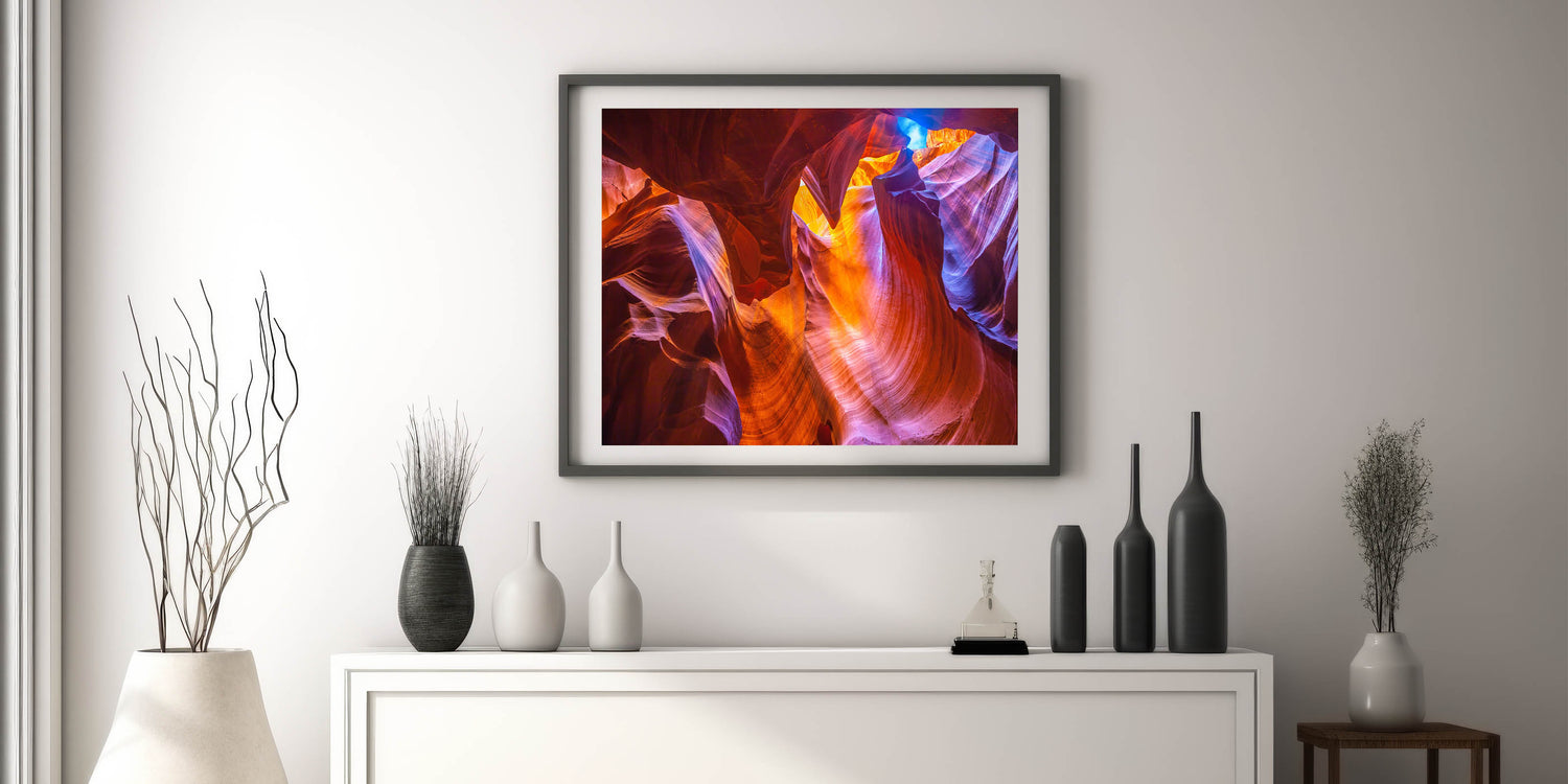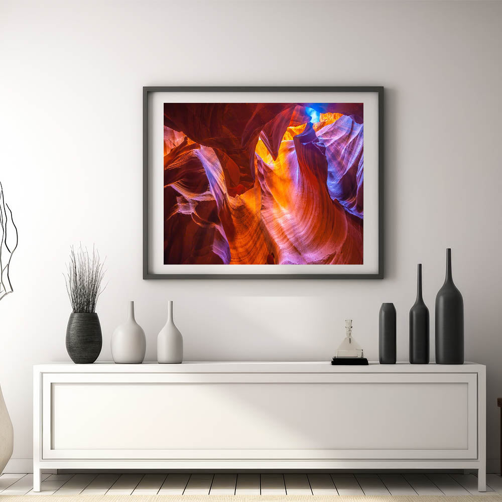 This vibrant Antelope Canyon wall art captures the dramatic beauty of Arizona’s red rock formations. With its rich oranges, purples, and reds, this striking piece brings the colorful majesty of the canyon to life, making it the perfect focal point for any room. The dynamic interplay of natural light and shadow highlights the canyon’s swirling sandstone formations, adding depth and movement to this stunning Antelope Canyon photography.