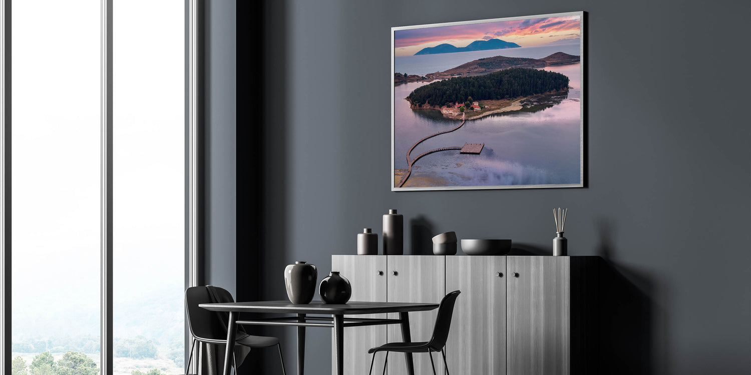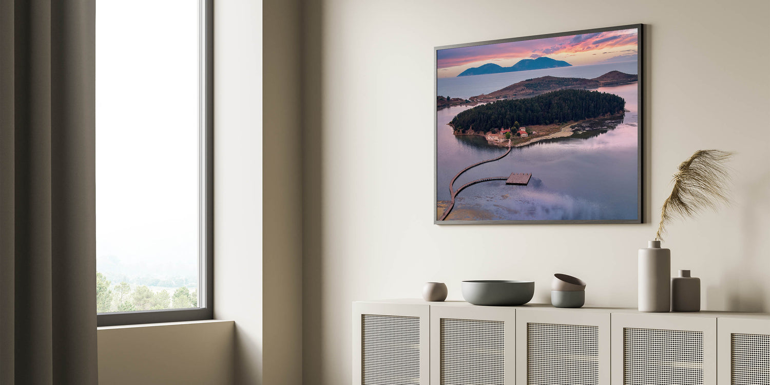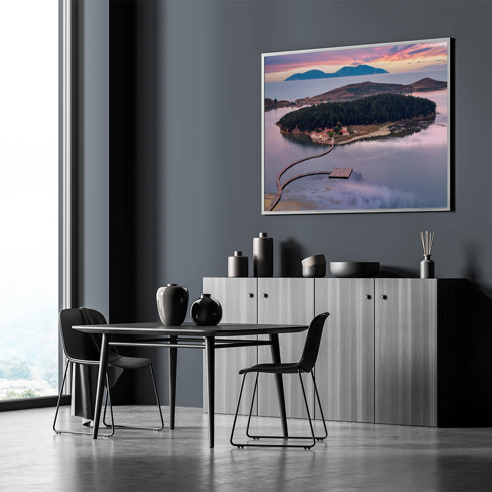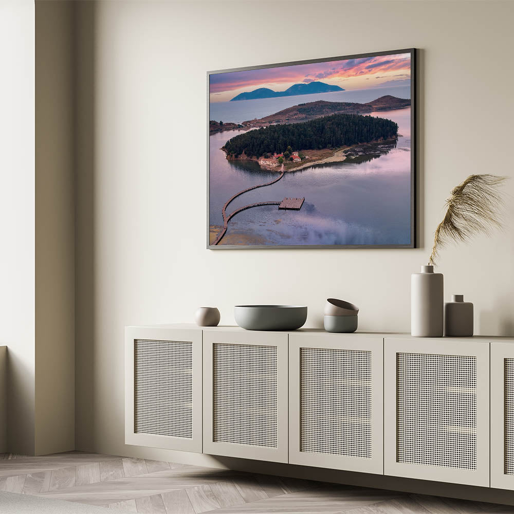 Bring the tranquil beauty of Albania into your home with this exquisite Albania wall art. This stunning Albanian landscape print showcases a serene island surrounded by calm waters, connected by a unique curved walkway, with lush greenery and a peaceful sunset sky. This Albania photography art is the perfect way to highlight the natural beauty of Albania's scenery and culture in your living space.