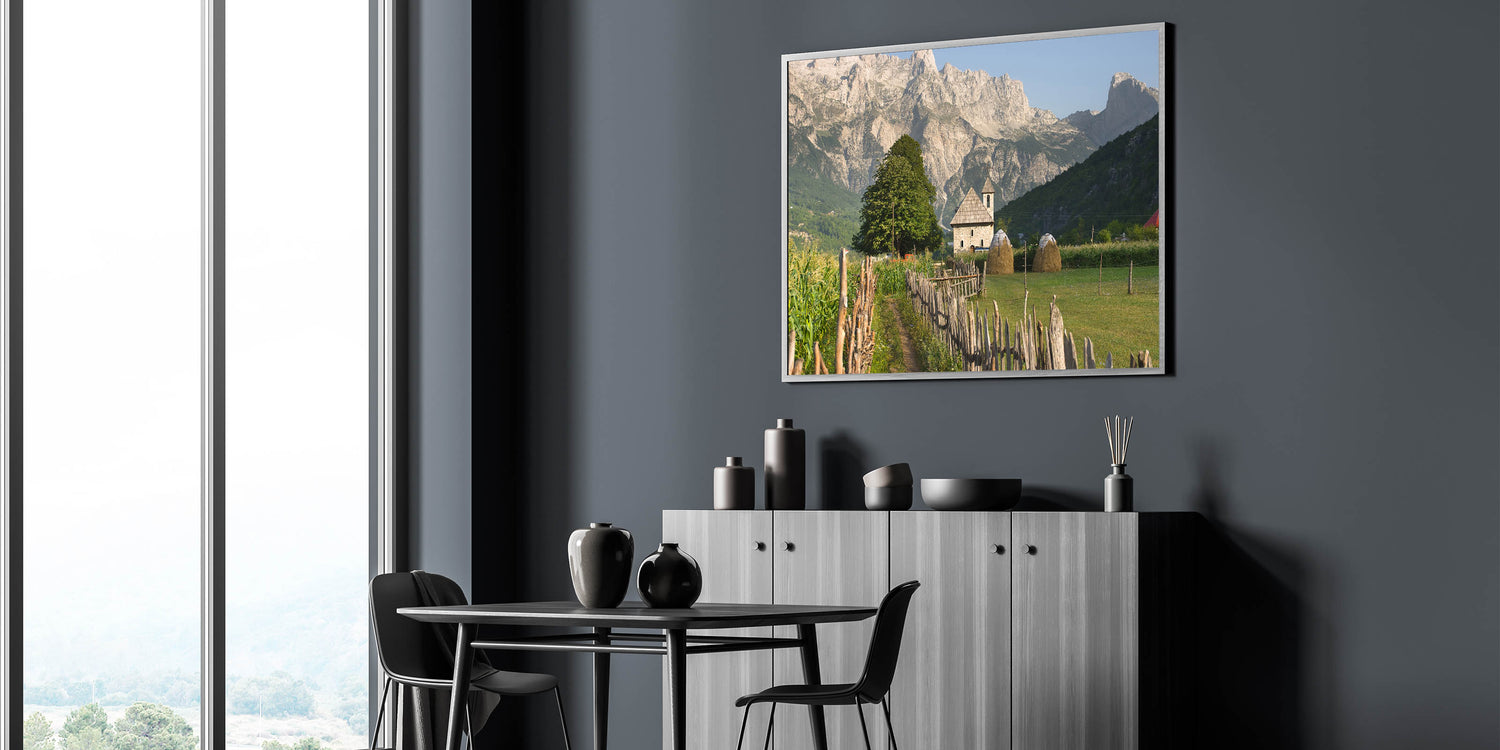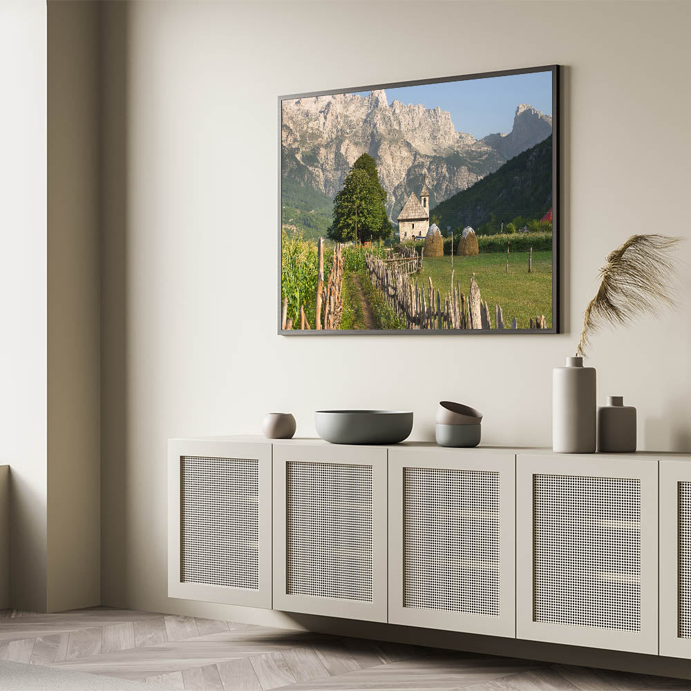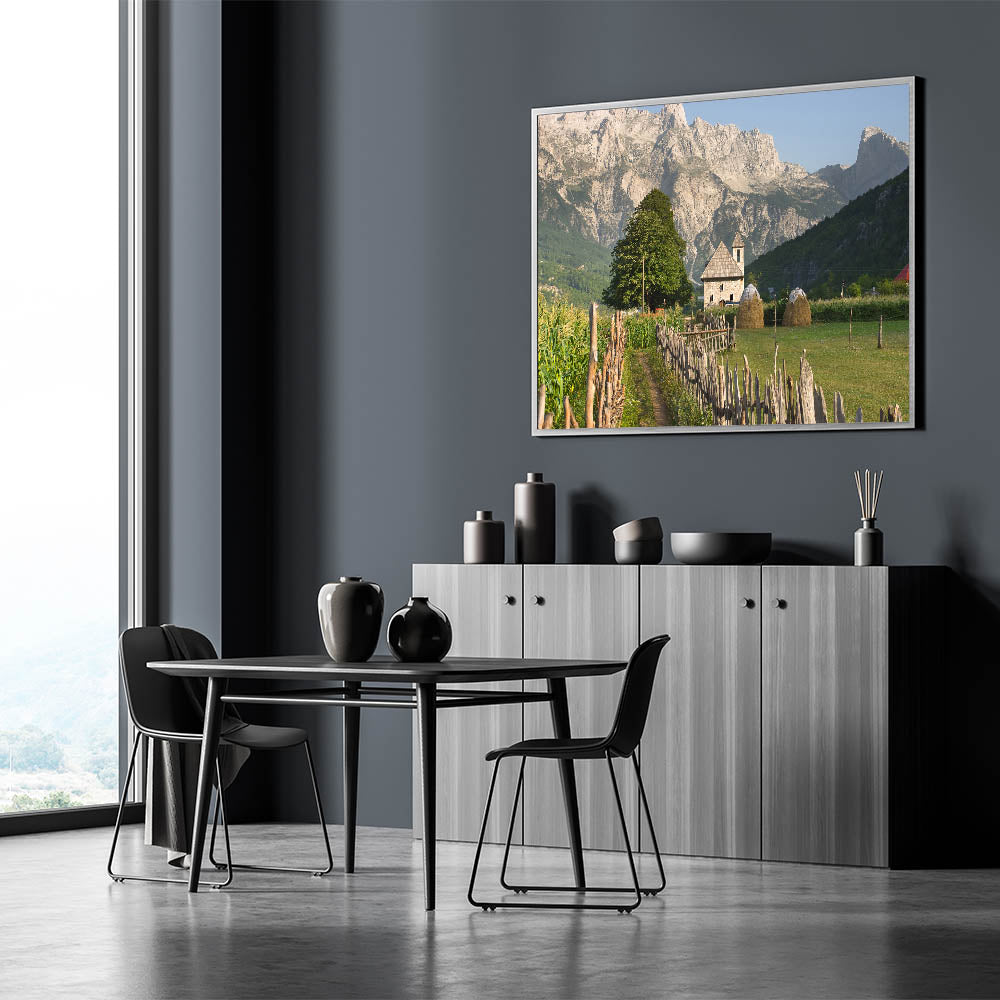 Bring the breathtaking beauty of Albania’s Theth Village into your home with this stunning Albania wall decor. Nestled in the Albanian Alps, Theth offers a serene glimpse into the country’s untouched landscapes and rich cultural heritage. This Albania Canvas Art captures the charm of the village's historic church, surrounded by towering mountains and lush greenery, making it a perfect addition to your home or office space.