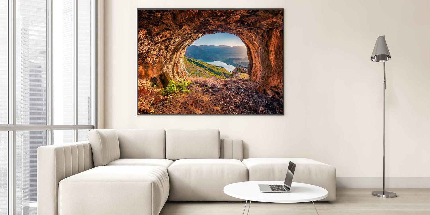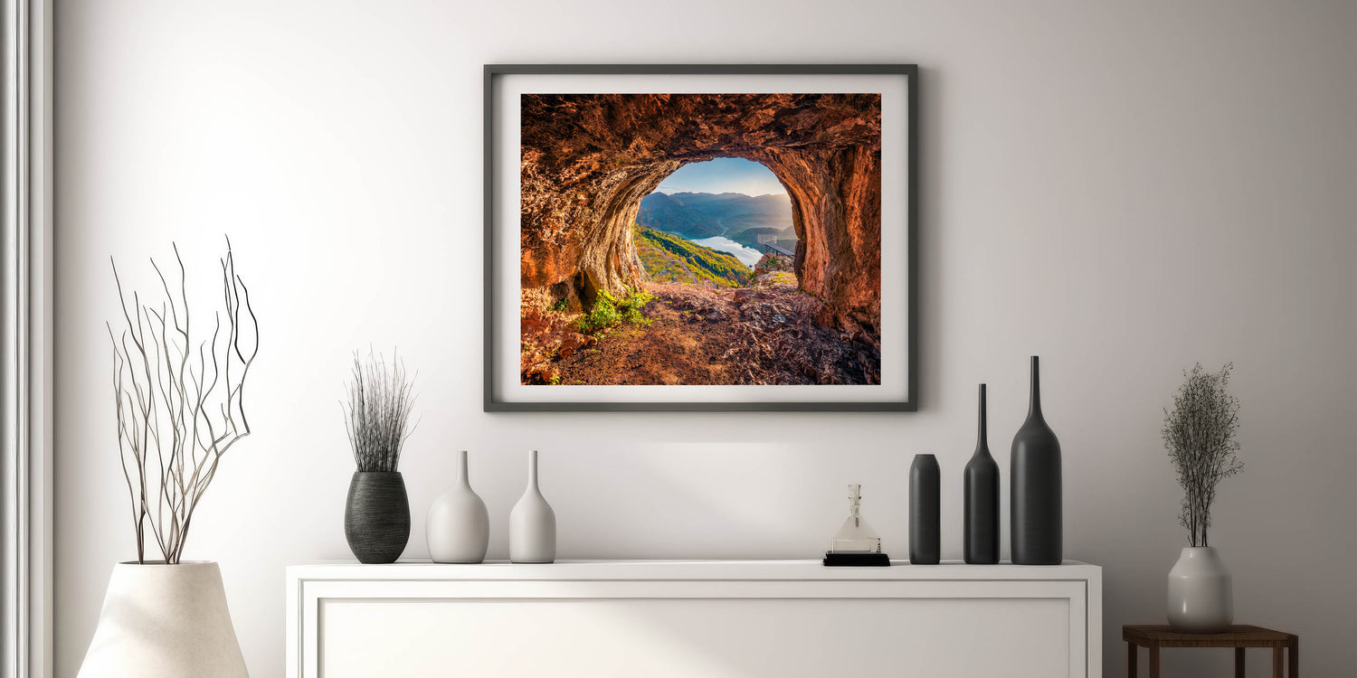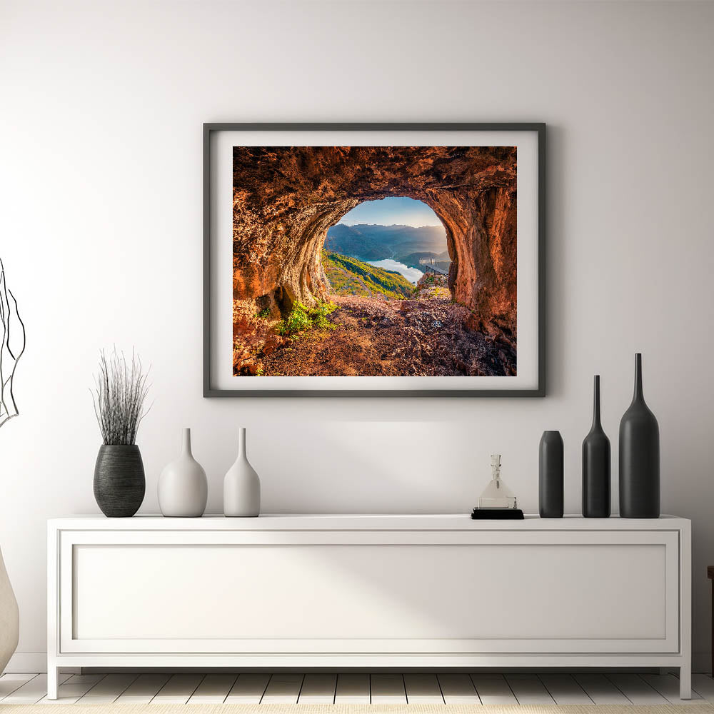 Transform your space with this breathtaking Albania wall art, capturing a stunning view of Albania’s natural beauty. The artwork features an awe-inspiring perspective from a cave, overlooking a peaceful lake and rolling mountains bathed in soft light. Perfect for any room, this Albanian landscape print brings the charm of Albania’s untouched scenery to your walls.