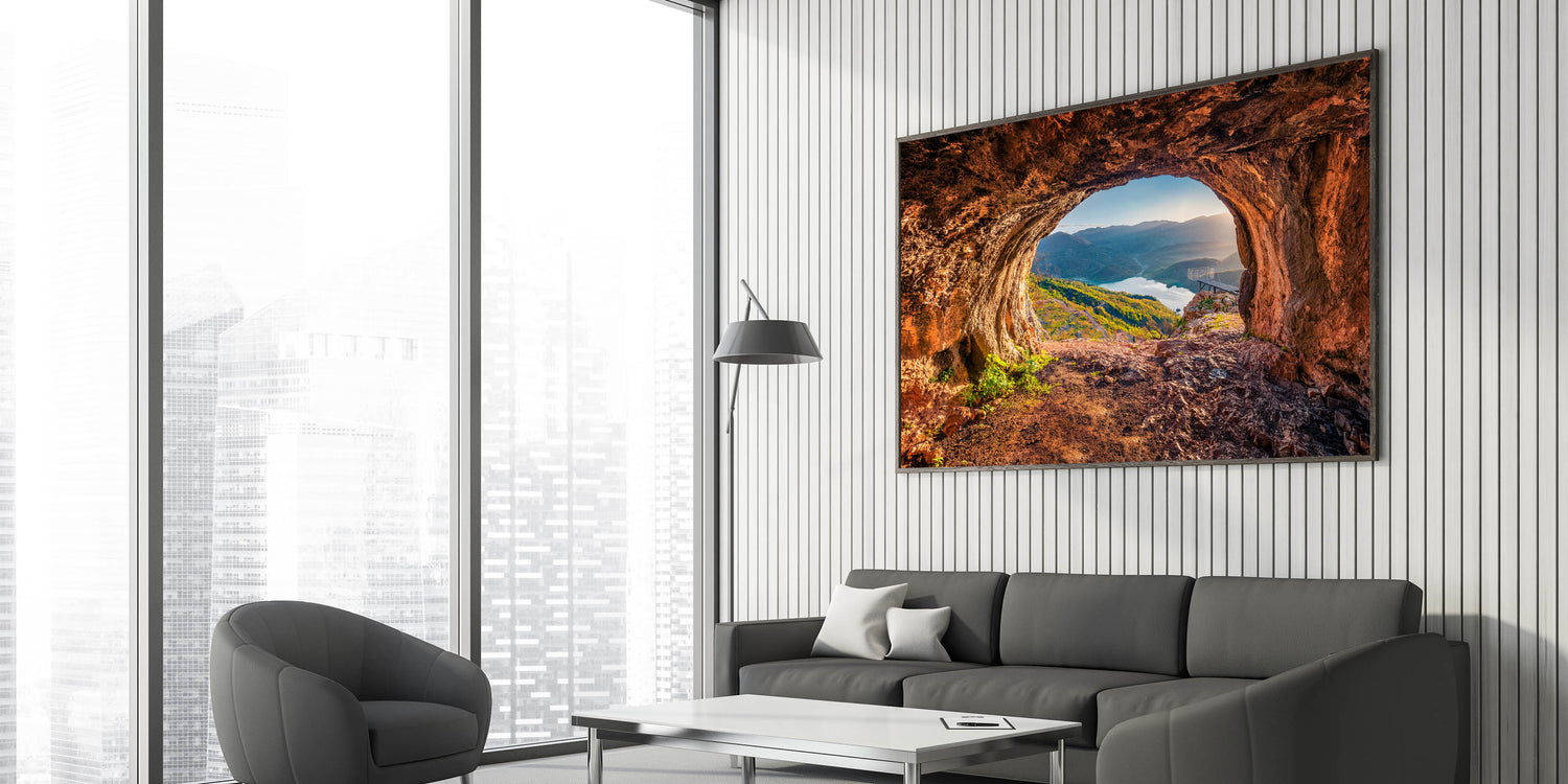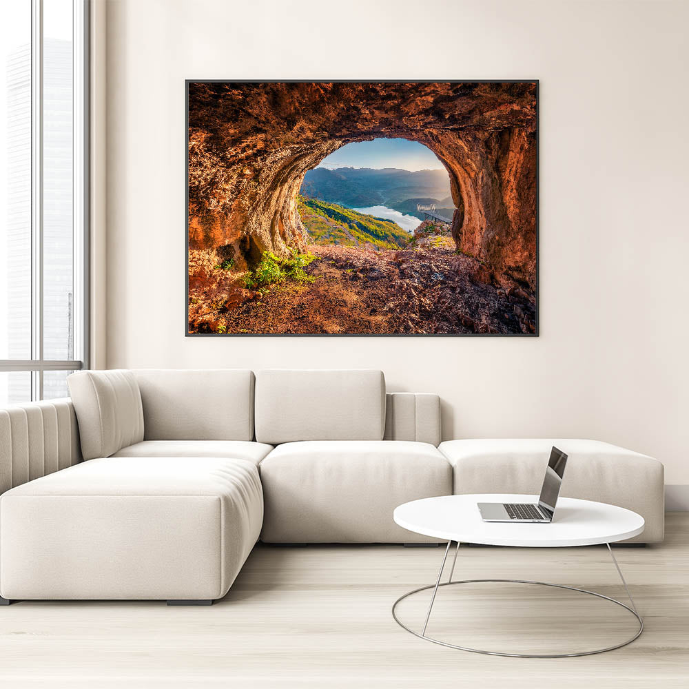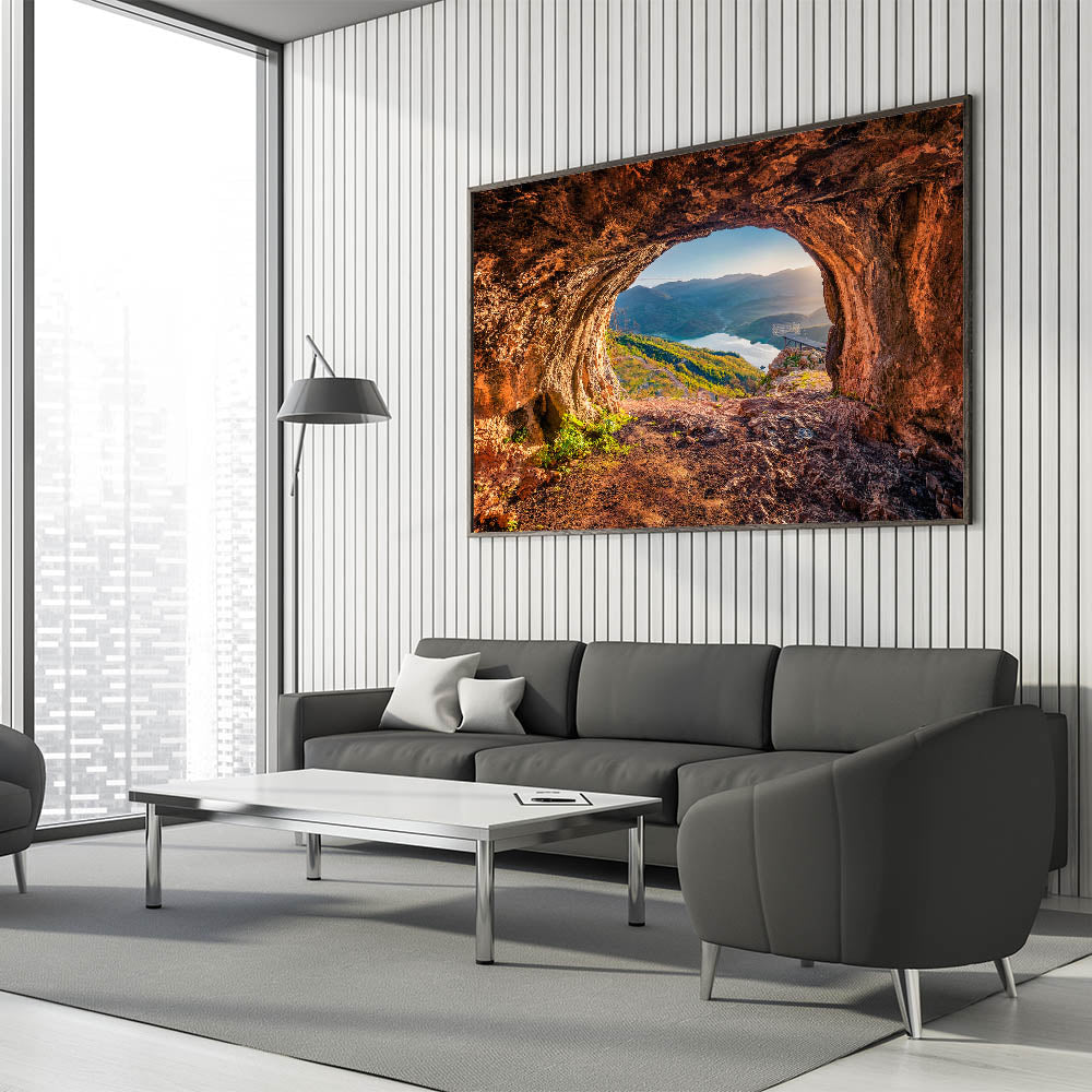 Transform your space with this breathtaking Albania wall art, capturing a stunning view of Albania’s natural beauty. The artwork features an awe-inspiring perspective from a cave, overlooking a peaceful lake and rolling mountains bathed in soft light. Perfect for any room, this Albanian landscape print brings the charm of Albania’s untouched scenery to your walls.