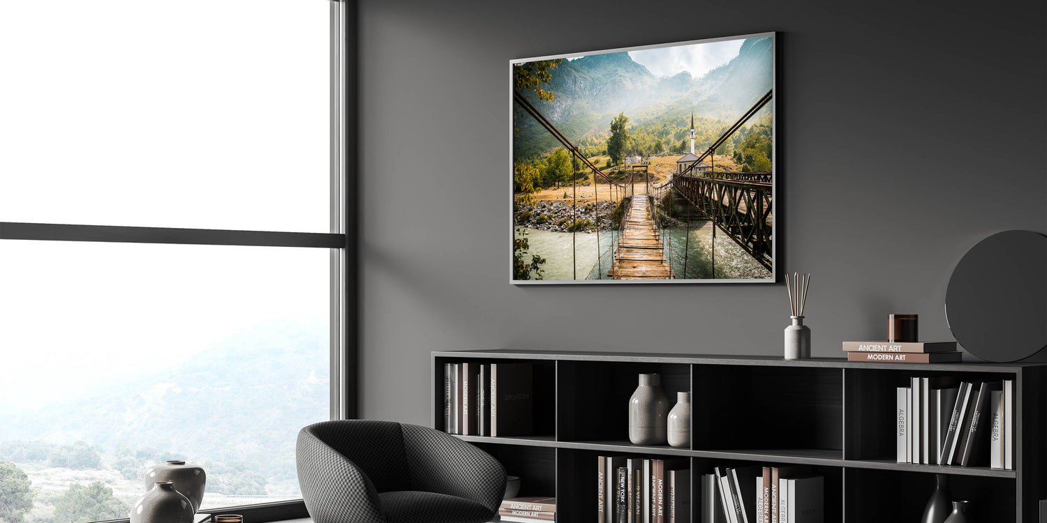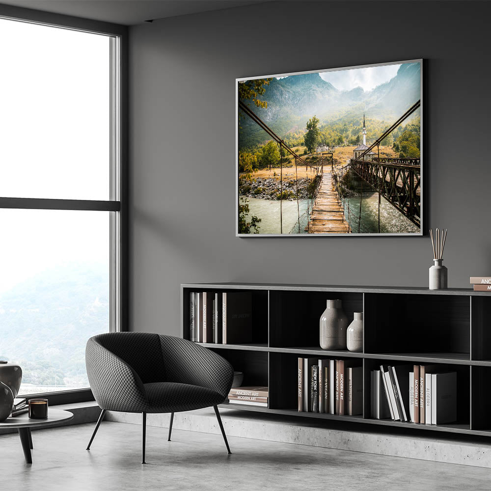 Bring the charm of rural Albania into your home with this stunning Albania wall art, featuring a rustic wooden bridge that leads into a picturesque mountain village. This Albanian landscape print showcases the natural beauty of Albania’s countryside, with a peaceful church, rocky riverbanks, and lush greenery framed by towering mountains. The serene atmosphere and warm tones make this piece perfect for anyone looking to add a rustic, peaceful feel to their space.