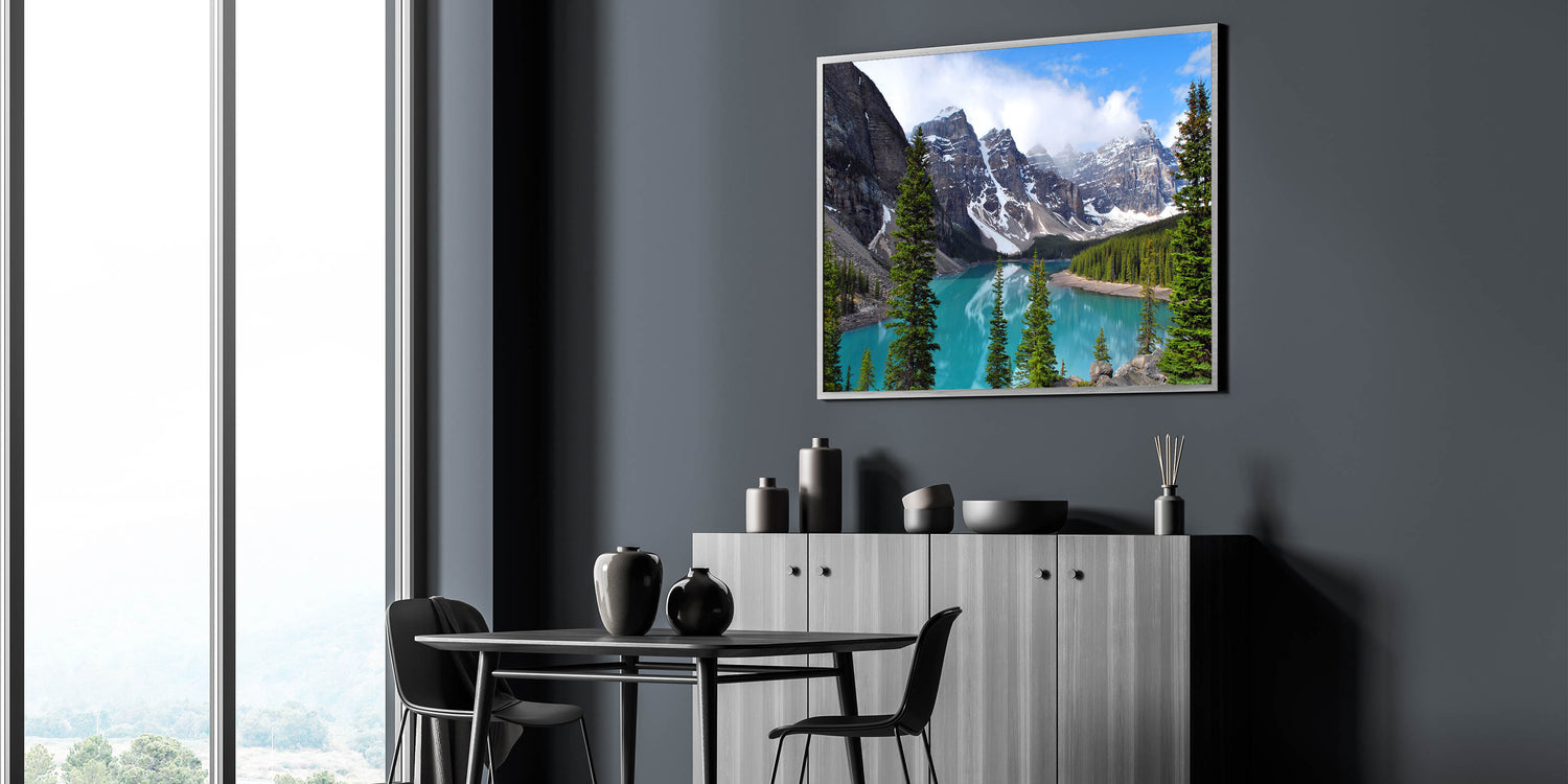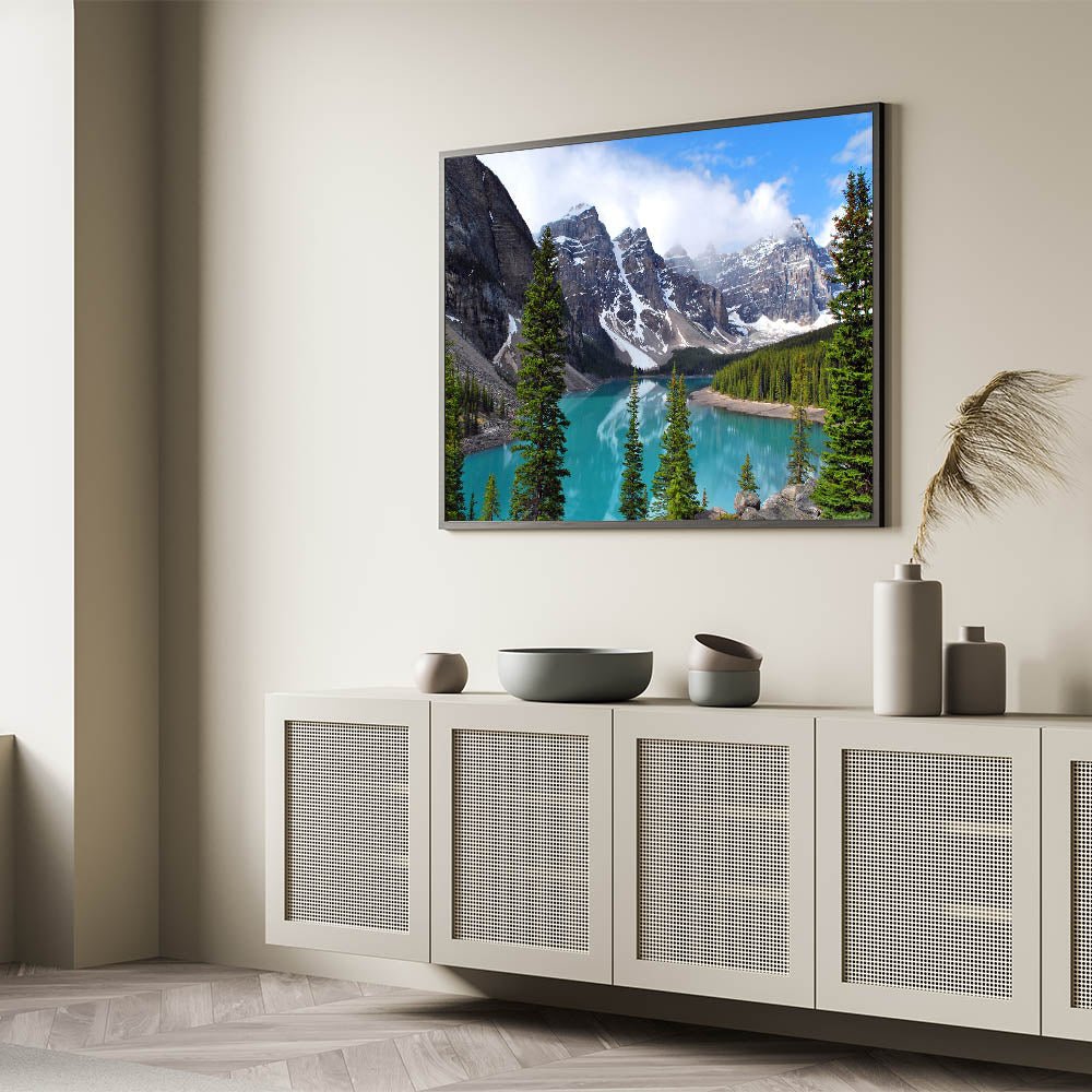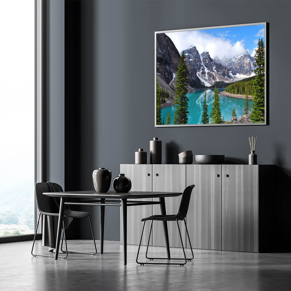 Experience the awe-inspiring grandeur of Alberta's Moraine Lake with this stunning wall art, capturing the pristine turquoise waters framed by the towering peaks of the Canadian Rockies. This Alberta Landscape Canvas highlights the rugged beauty of nature, with snow-capped mountains, lush evergreen forests, and the serene reflection of the landscape on the lake's surface. Perfect for those who appreciate the tranquility and majesty of the great outdoors, this artwork brings the essence of the Canadian wilderness into your living space.