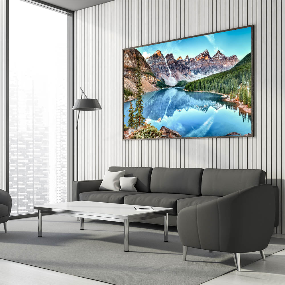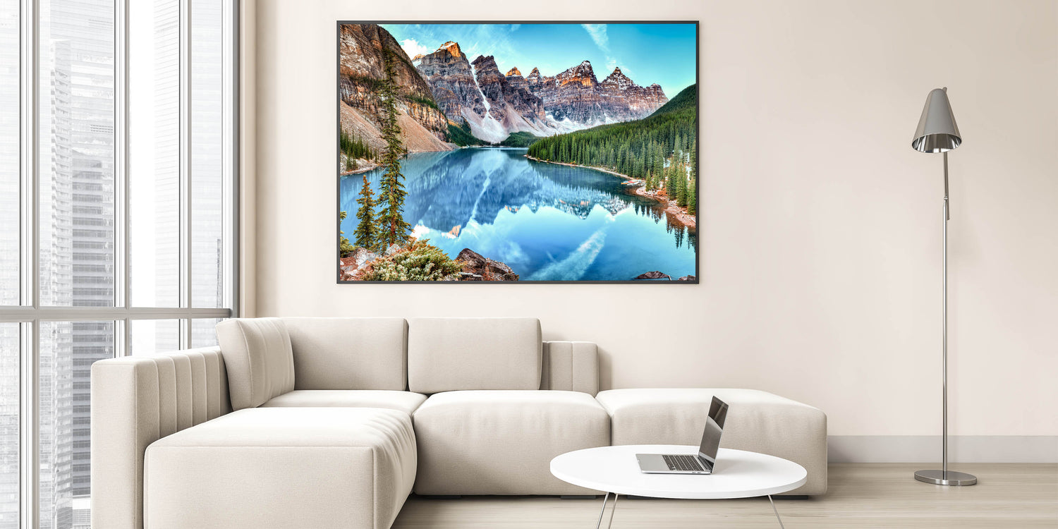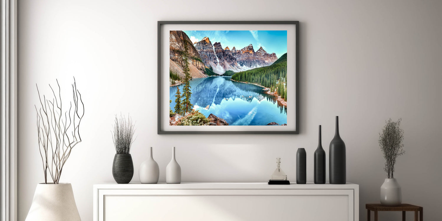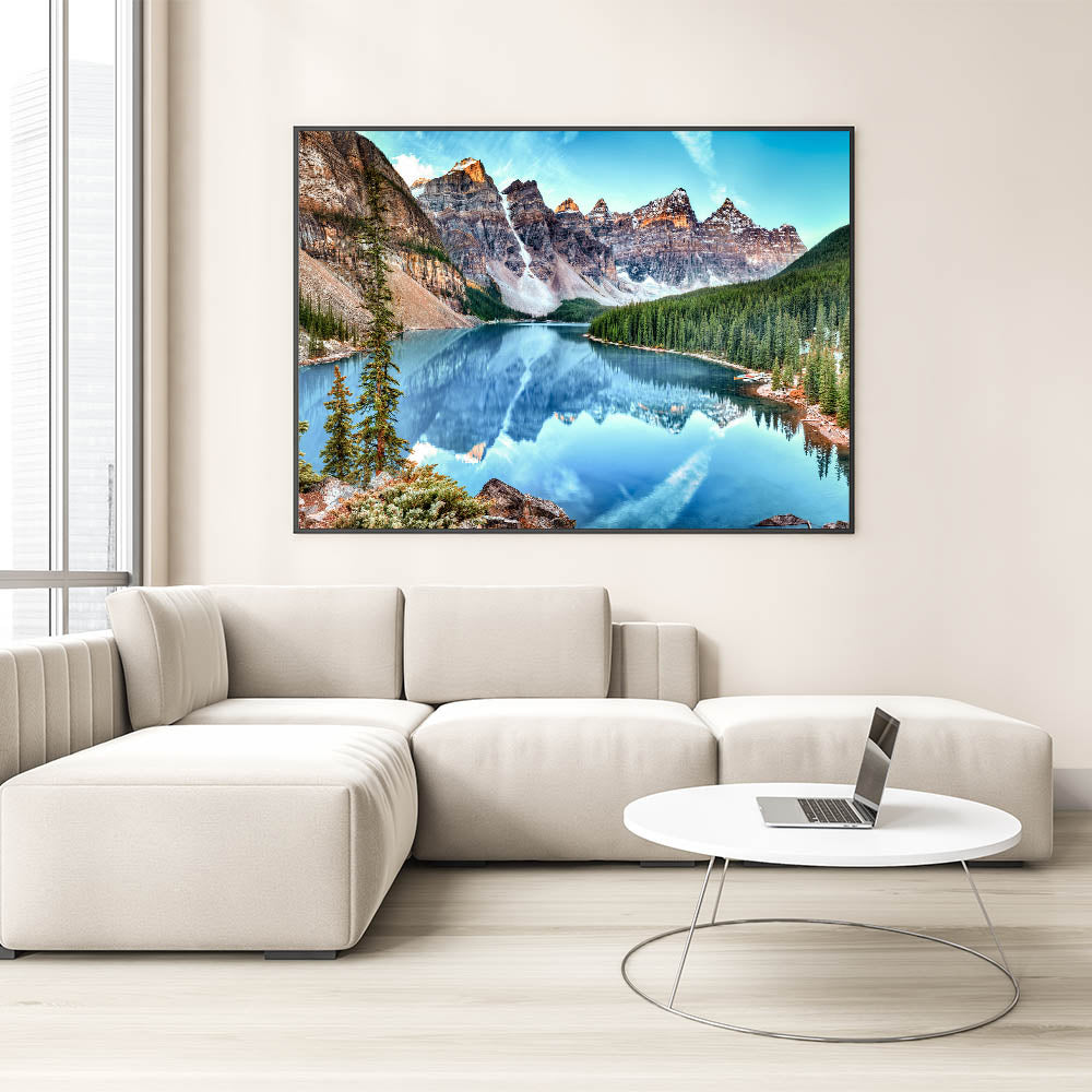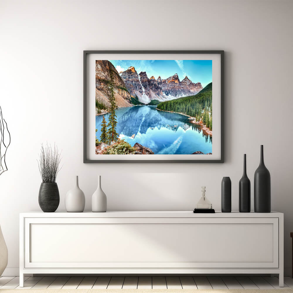 Experience the breathtaking panoramic beauty of Alberta's Moraine Lake with this stunning wall art, capturing the serene waters and majestic Canadian Rockies. This Alberta Nature Print showcases the pristine landscape, with the crystal-clear lake reflecting the towering, snow-capped peaks and lush evergreen forests that surround it. The wide-angle view enhances the sense of space and depth, making this piece perfect for anyone who loves the grandeur of nature.