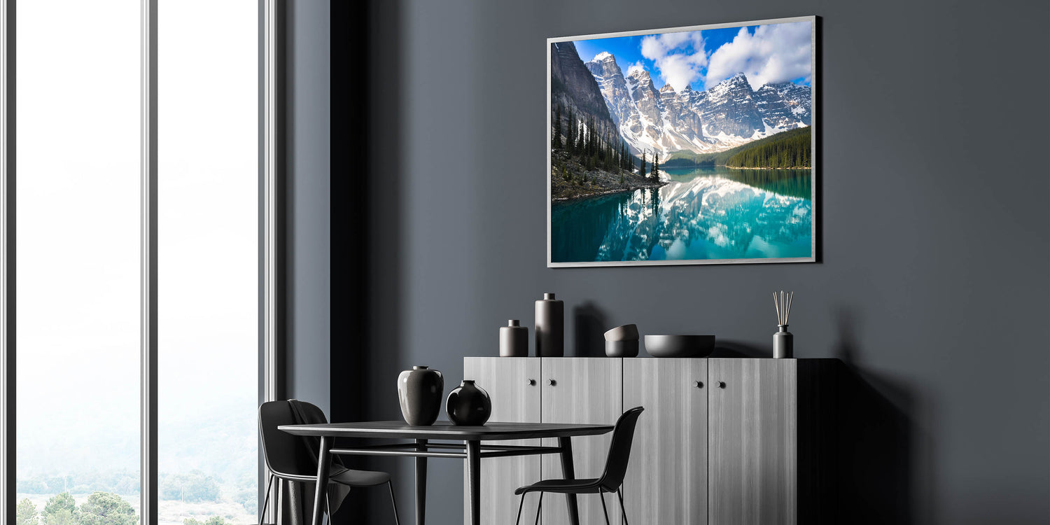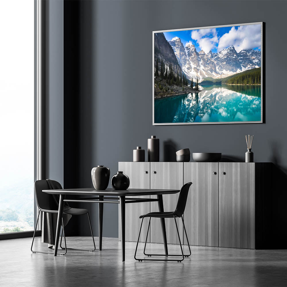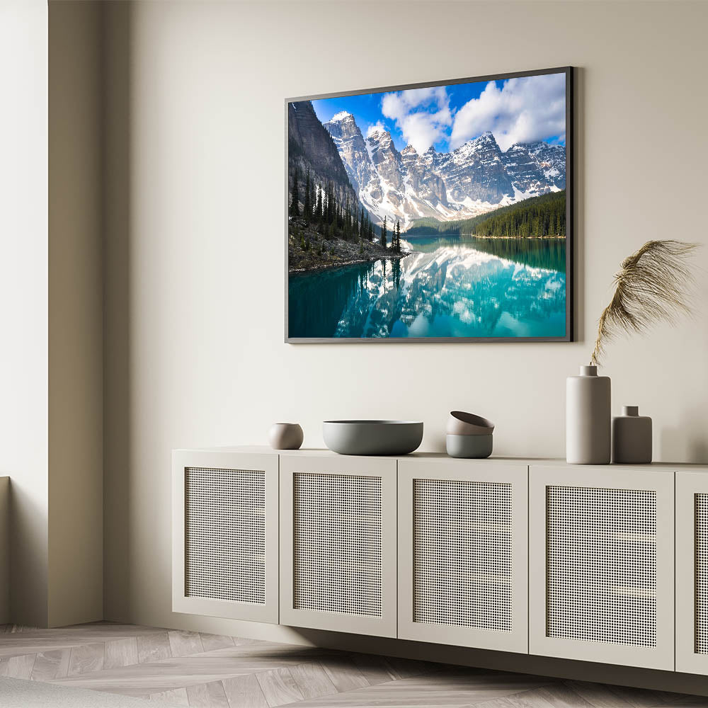Experience the serene beauty of Alberta's Moraine Lake with this breathtaking wall art, showcasing the lake's crystal-clear waters and the majestic Rocky Mountains. This Alberta Photography Wall Art captures the stunning reflection of the snow-capped peaks in the tranquil waters, offering a perfect blend of nature’s most awe-inspiring elements. The vibrant greens of the surrounding pine trees and the crisp blues of the sky create a mesmerizing composition that brings a touch of the Canadian wilderness into your home.