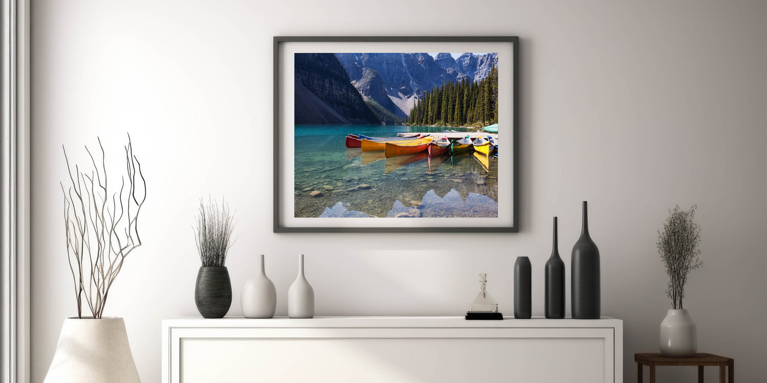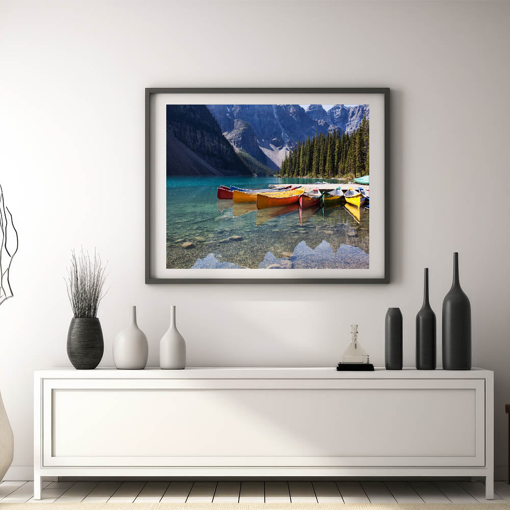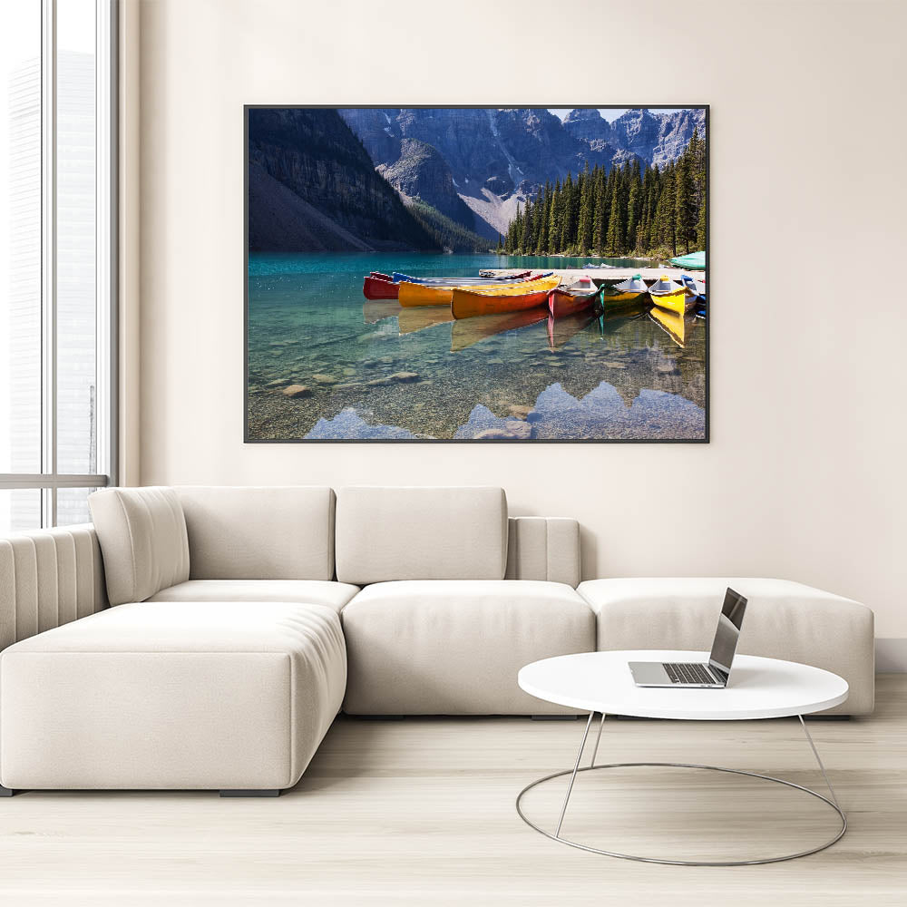 Alberta Scenic Wall Art - Vibrant Canoes on Moraine Lake Canvas Print