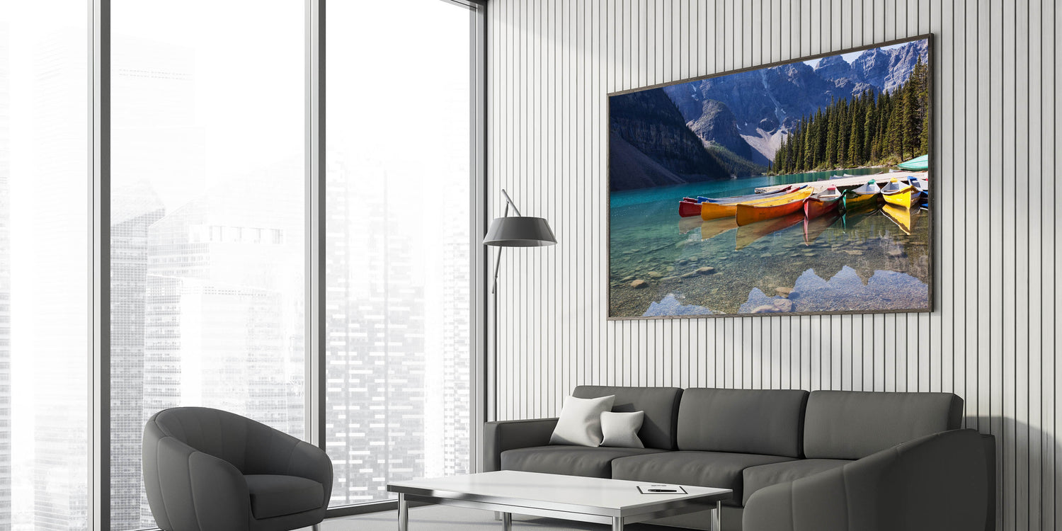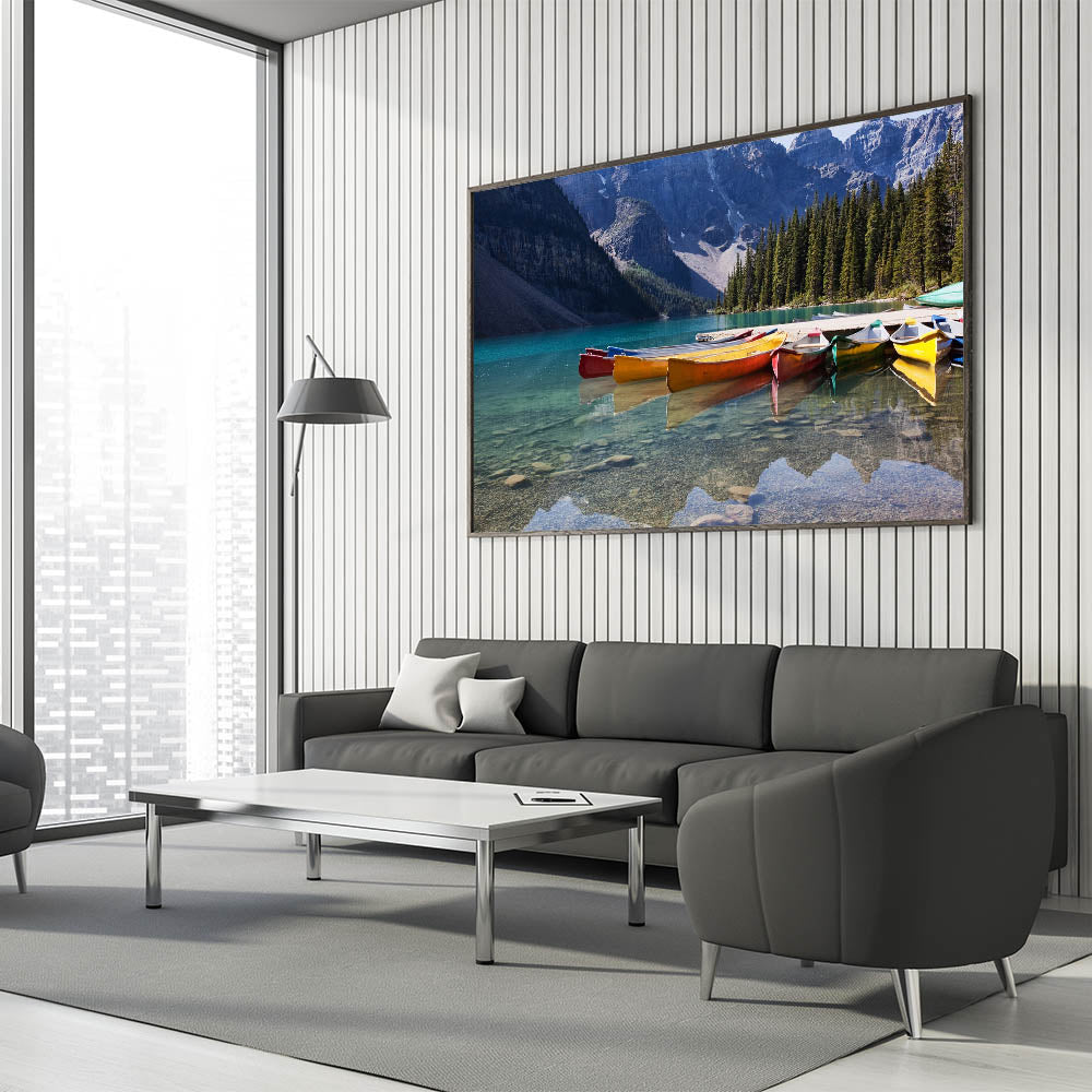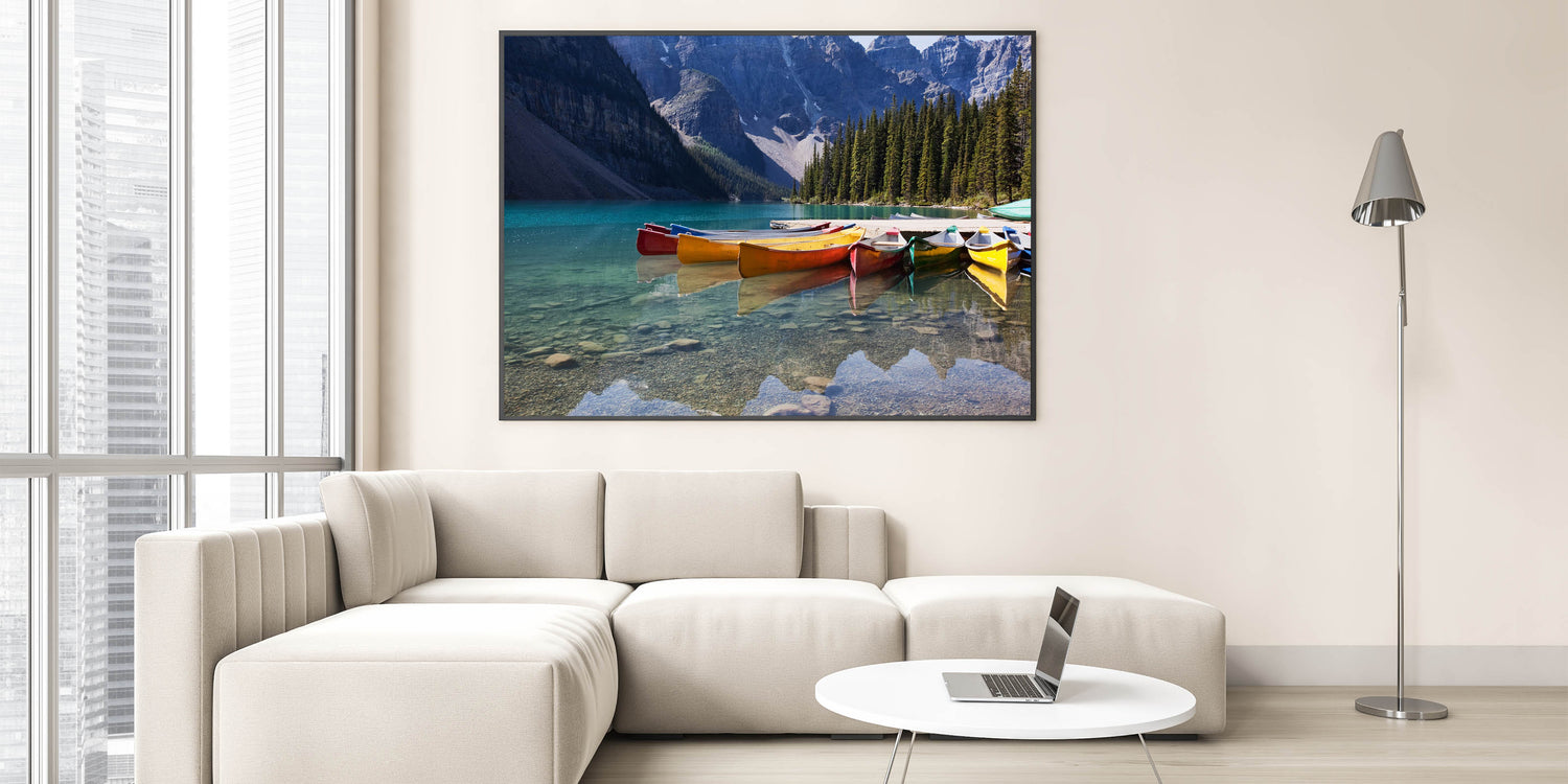 Alberta Scenic Wall Art - Vibrant Canoes on Moraine Lake Canvas Print