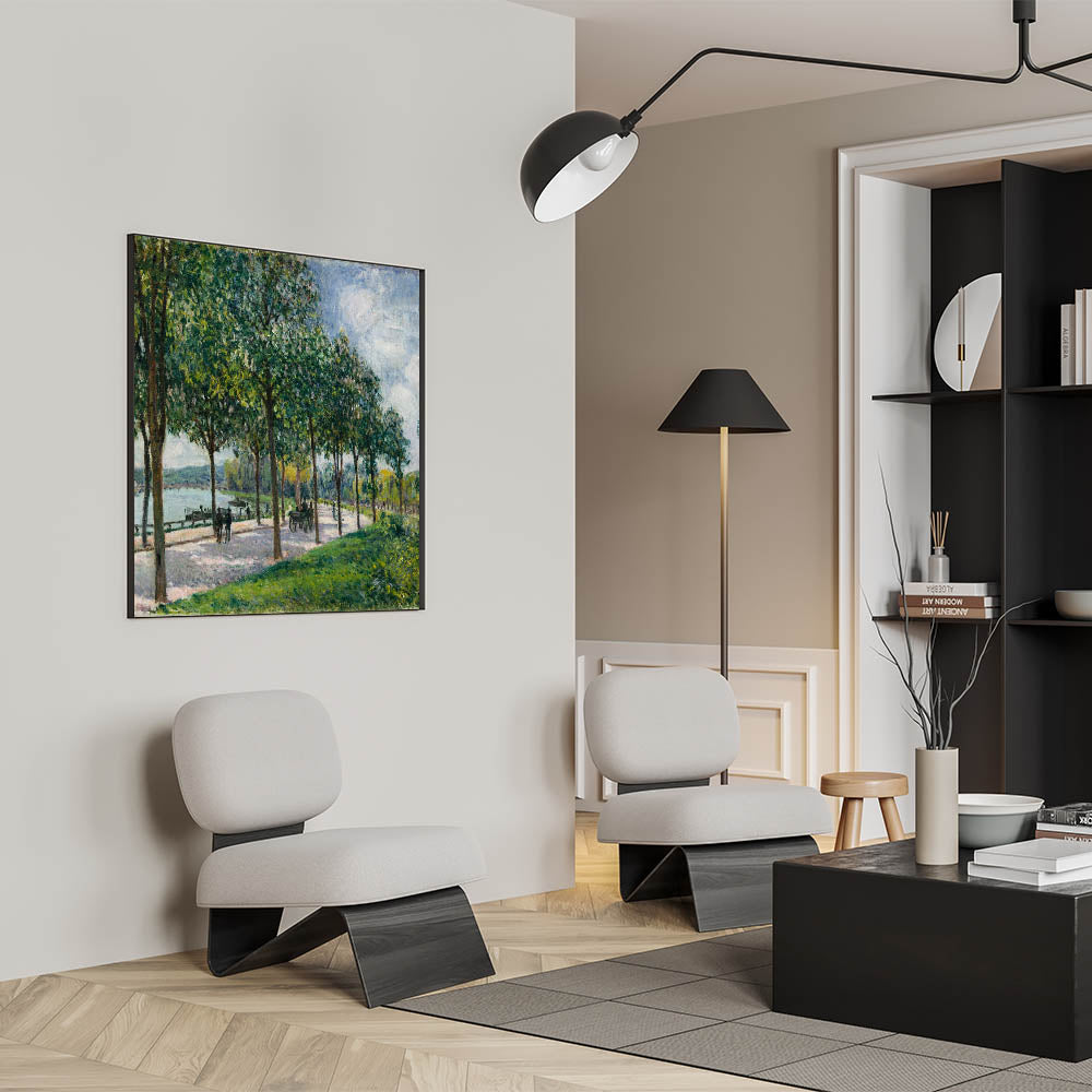 This beautiful landscape by Alfred Sisley captures the serene beauty of a tree-lined river path, inviting viewers into the peaceful countryside of France. Known for his mastery of Impressionist landscapes, Sisley expertly uses light and shadow to create a calming, dappled sunlight effect on the path. The lush green trees stand tall, leading toward a tranquil river where boats quietly rest along the bank. This artwork is a perfect example of Sisley’s ability to harmoniously blend natural elements into a cohesive, inviting scene.