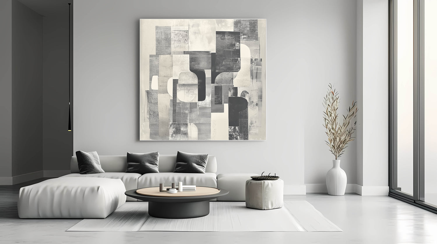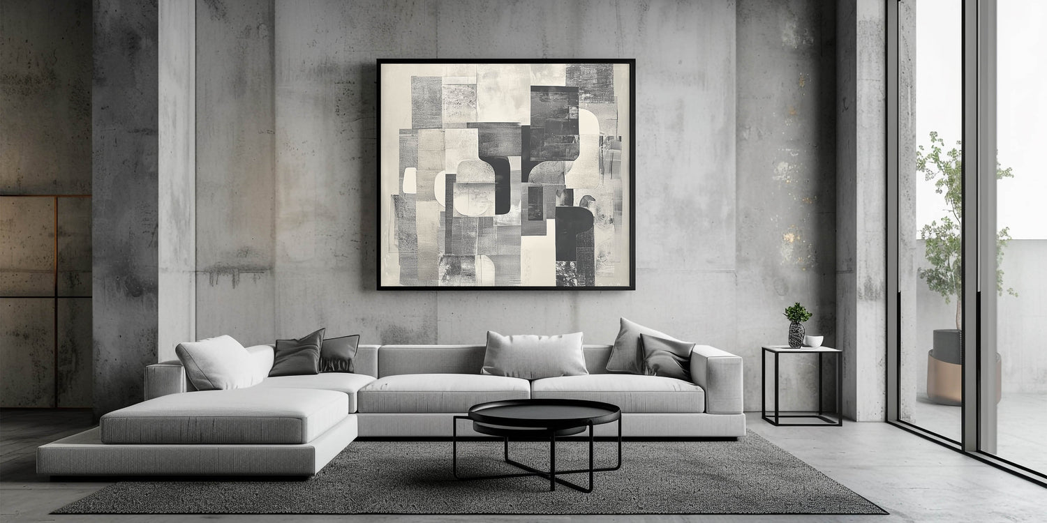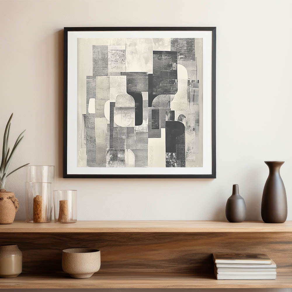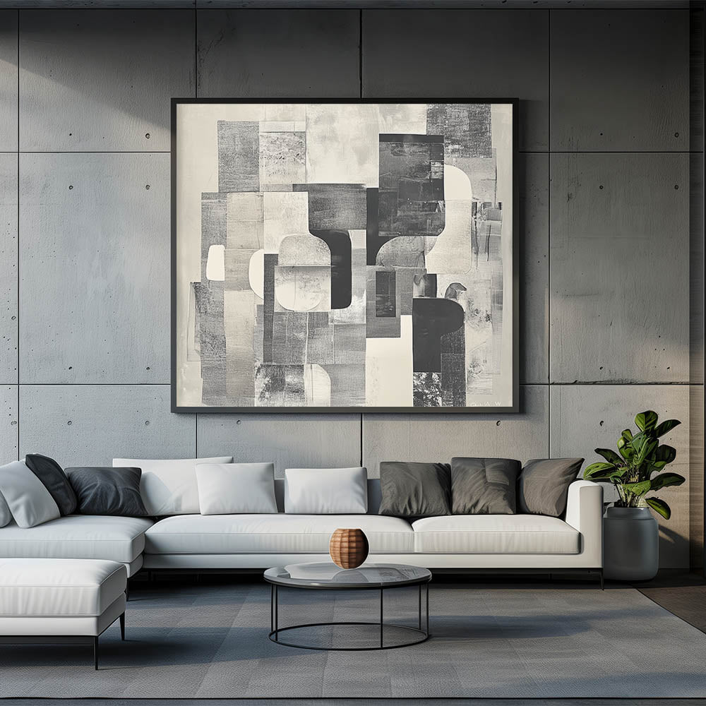 Discover the raw sophistication of abstract art prints with this monochrome masterpiece. Composed of overlapping rectangular and curved blocks in black, gray, and white tones, this artwork presents a rhythmic balance of form and texture. Its collage-like finish and grayscale palette make it a bold yet versatile piece for modern and minimalist interiors.
