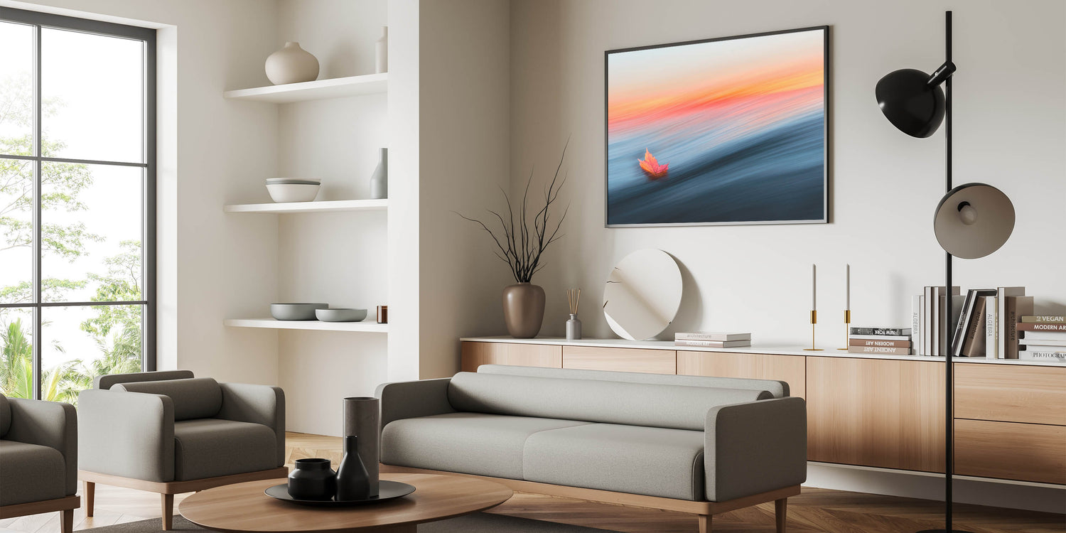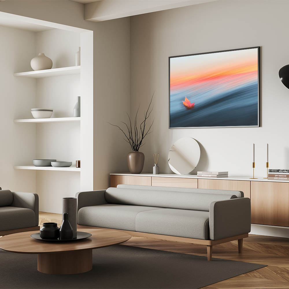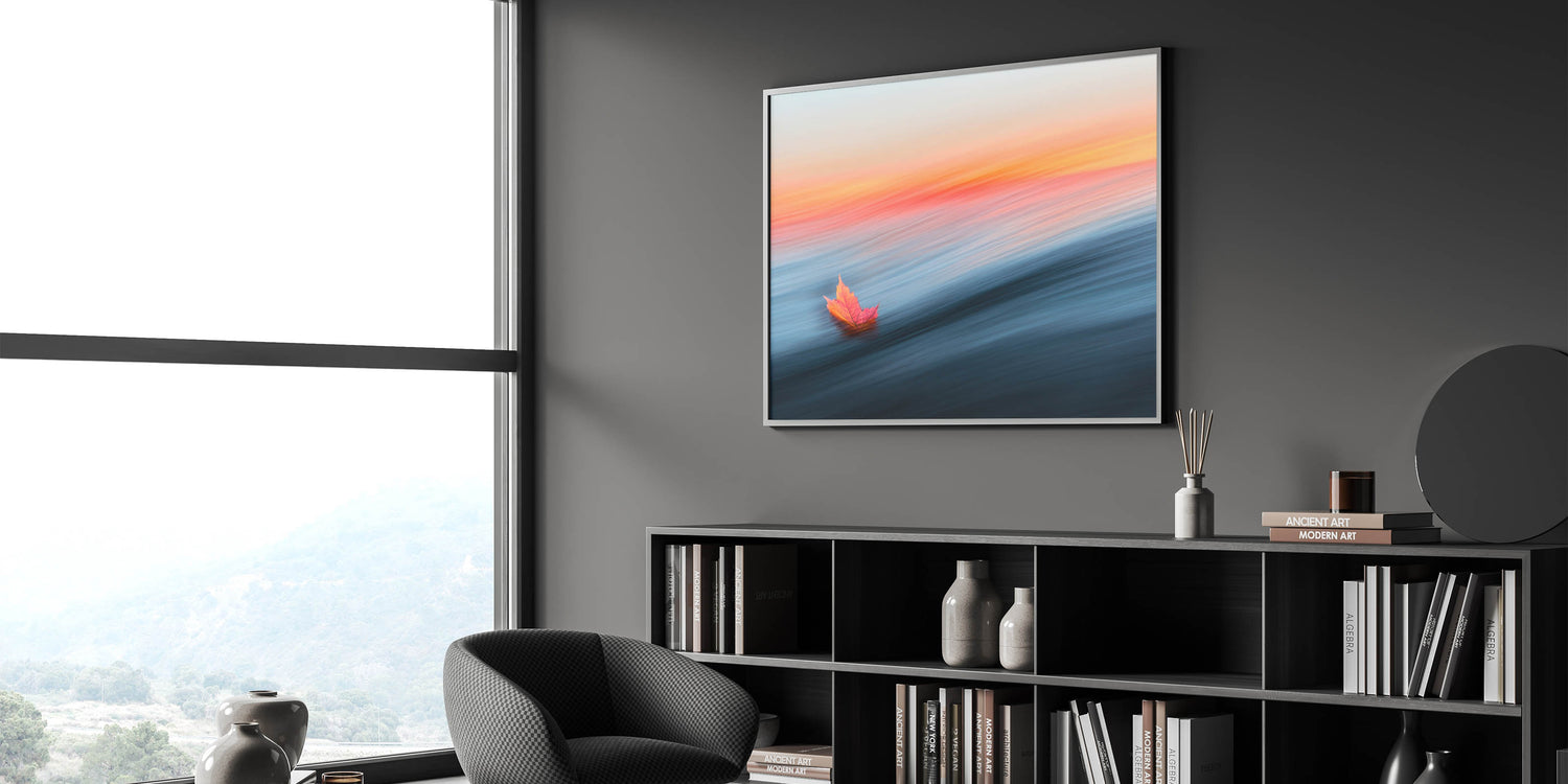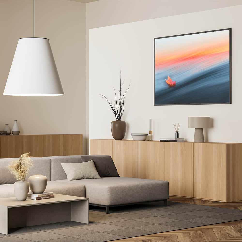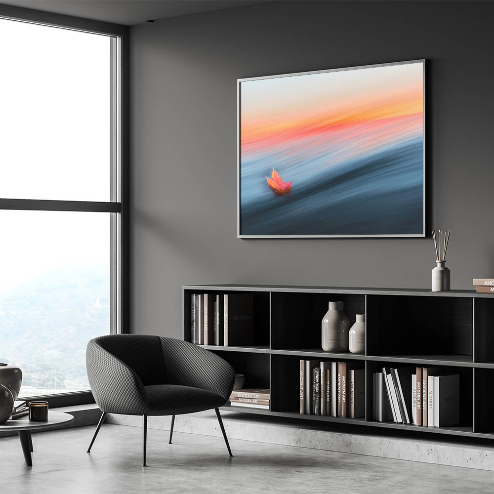 Celebrate the delicate balance between motion and stillness with this breathtaking wall art from the Dynamic Motion Photography collection. A single autumn leaf floats gracefully across a fluid canvas of sunset hues and oceanic waves, evoking a poetic sense of serenity and transformation.