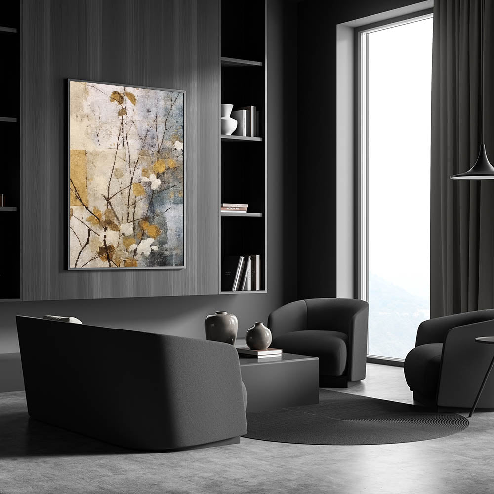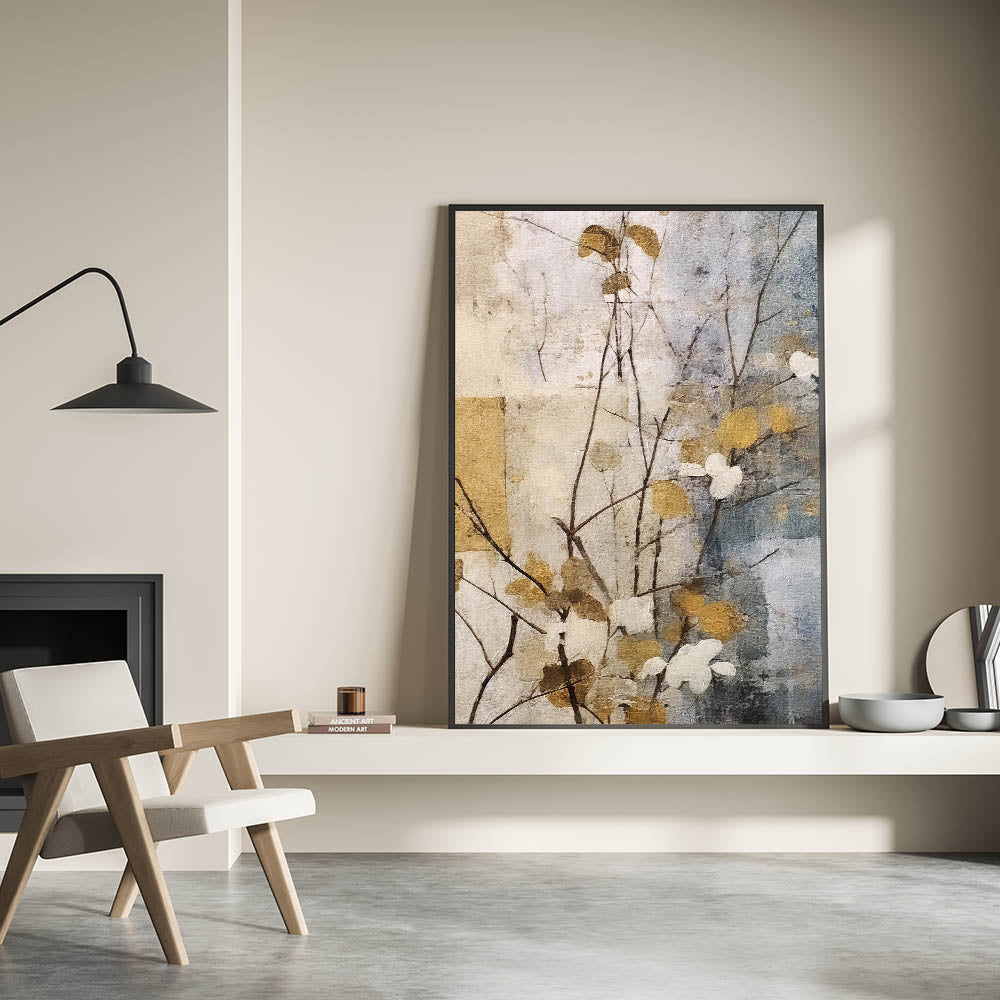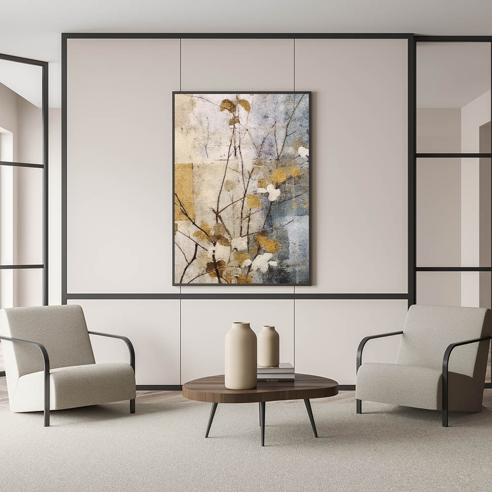 Bring a touch of elegance and serenity to your space with this Living Room Wall Art, featuring a delicate gold and gray botanical composition. The soft, textured background enhances the organic beauty of the subtle floral elements, creating a sense of balance and sophistication. This piece is ideal for Modern Living Room Decor, blending seamlessly with both contemporary and traditional interiors.