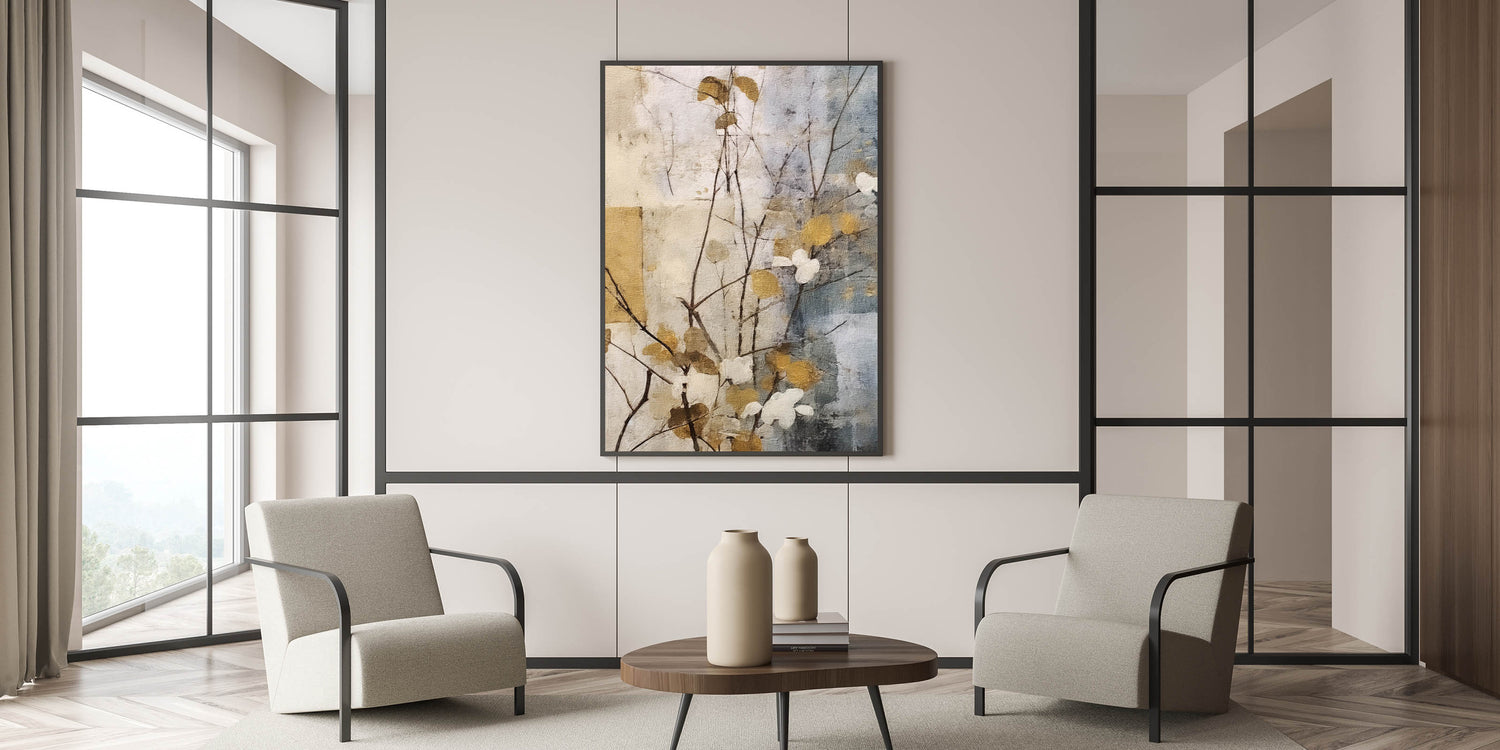 This Abstract Art Piece embodies timeless beauty with its golden accents, neutral hues, and delicate botanical details. Whether placed in a living room, bedroom, or office, it brings warmth and sophistication to any setting. Add this Large Wall Art Piece to your collection and elevate your interior decor effortlessly.