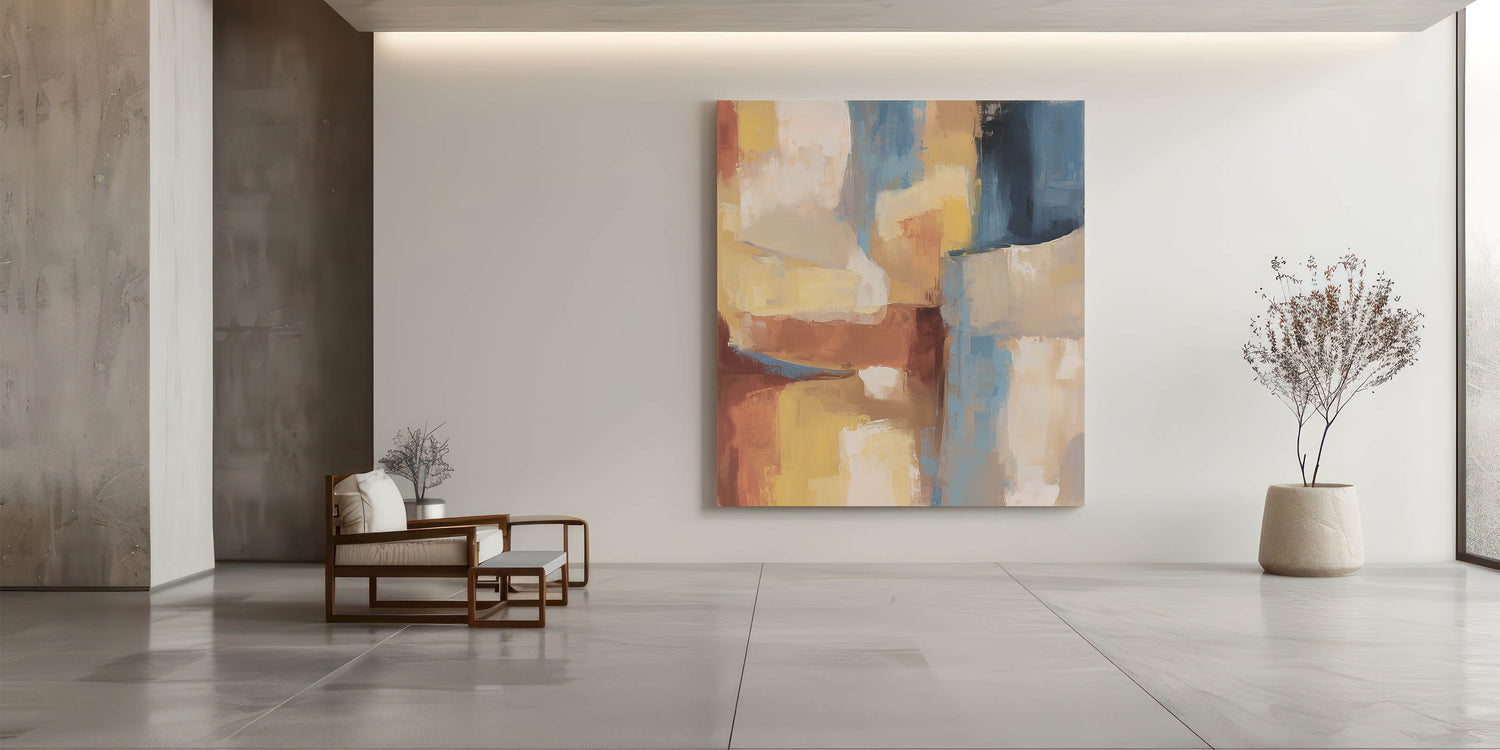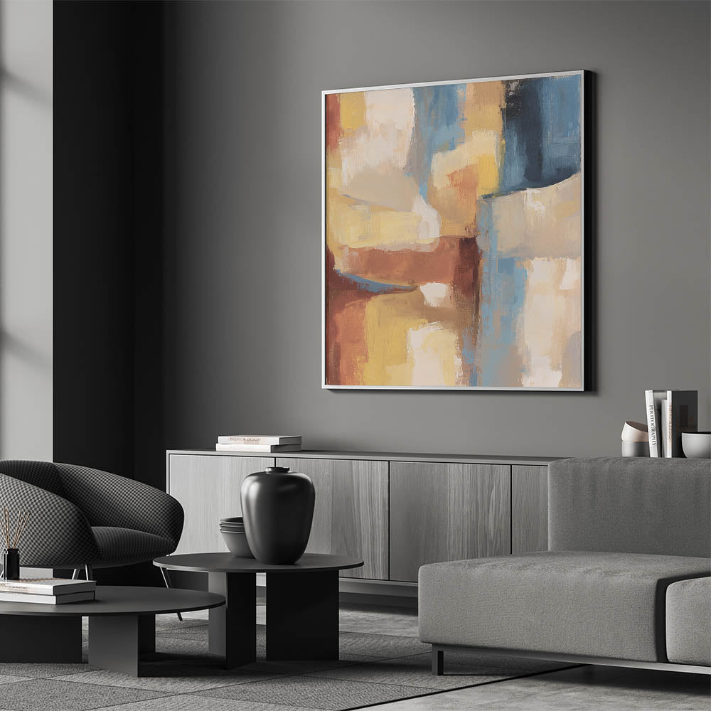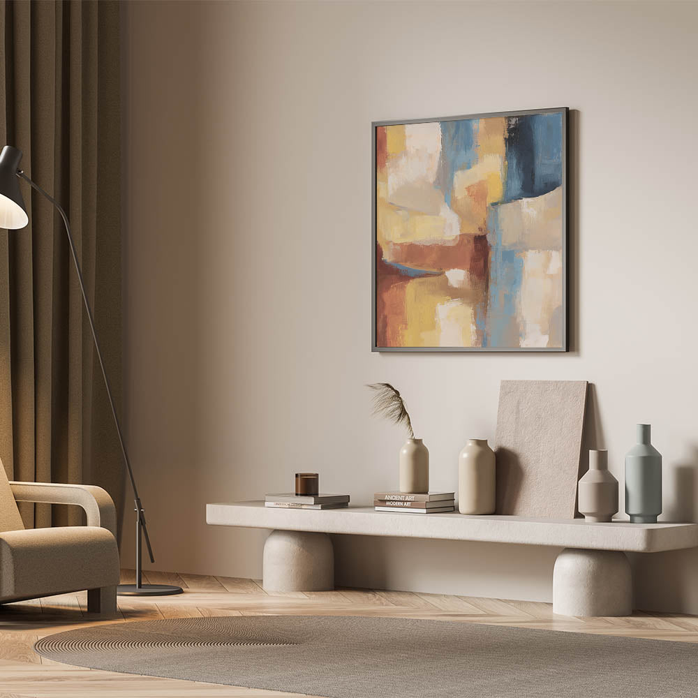 Bring balance and warmth into your space with this elegant piece of geometric abstract wall decor. Composed of layered blocks in earthy hues like terracotta, mustard yellow, beige, and pale blue, this design feels both modern and timeless. The soft transitions and thoughtful composition create a sense of harmony that’s perfect for calming, sophisticated interiors.