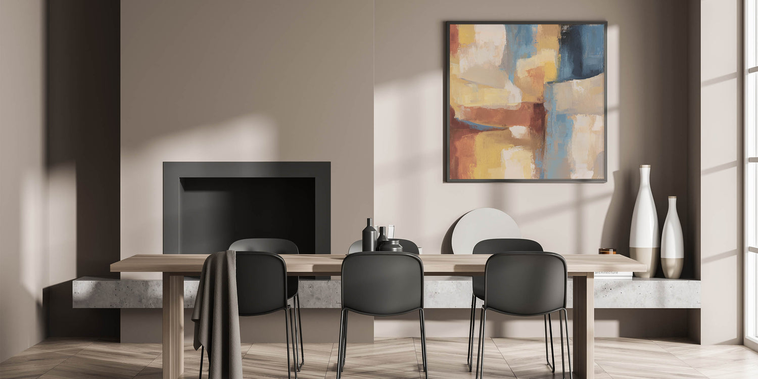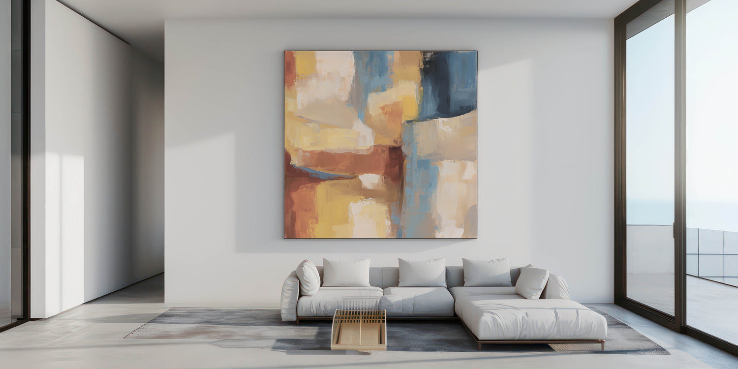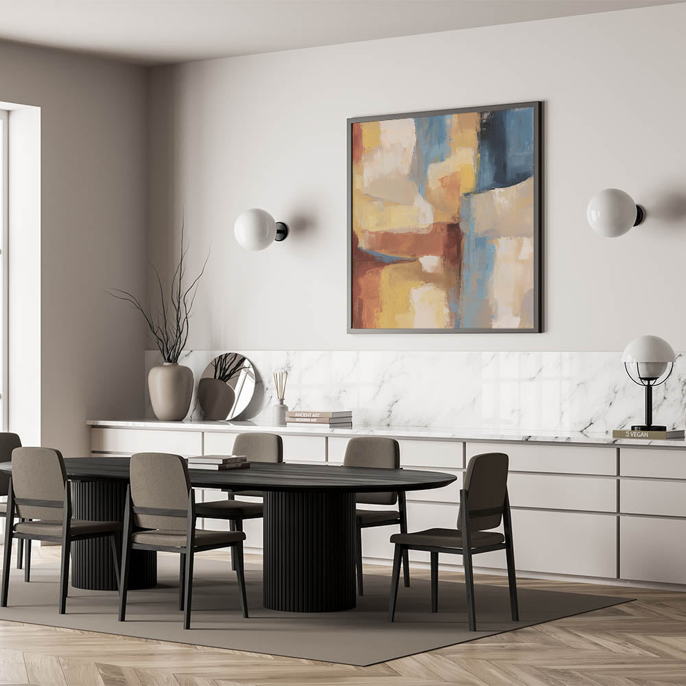 Bring balance and warmth into your space with this elegant piece of geometric abstract wall decor. Composed of layered blocks in earthy hues like terracotta, mustard yellow, beige, and pale blue, this design feels both modern and timeless. The soft transitions and thoughtful composition create a sense of harmony that’s perfect for calming, sophisticated interiors.