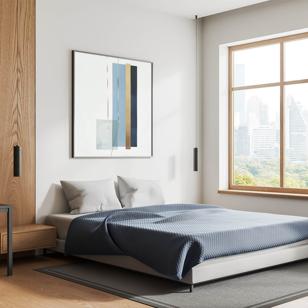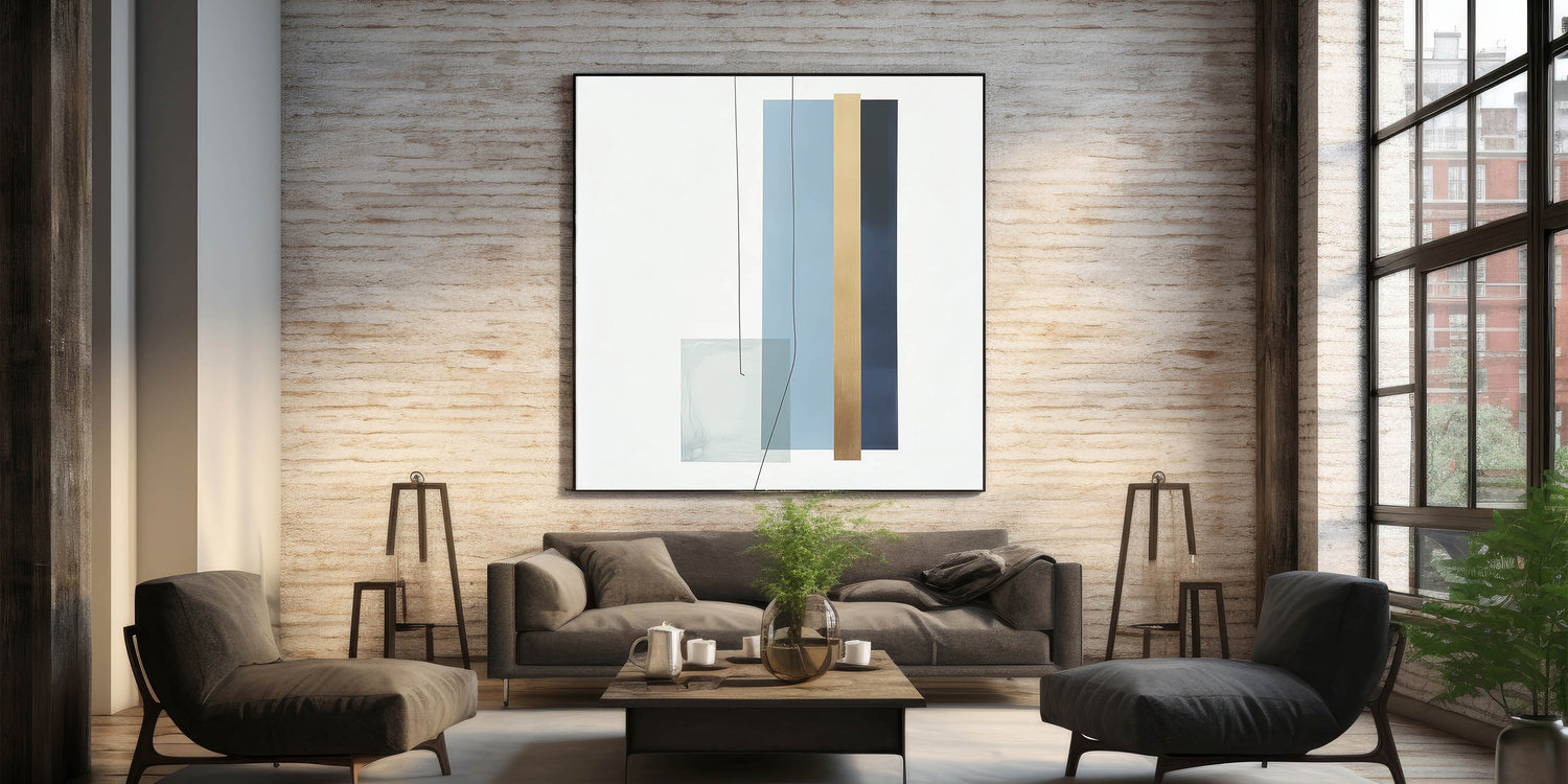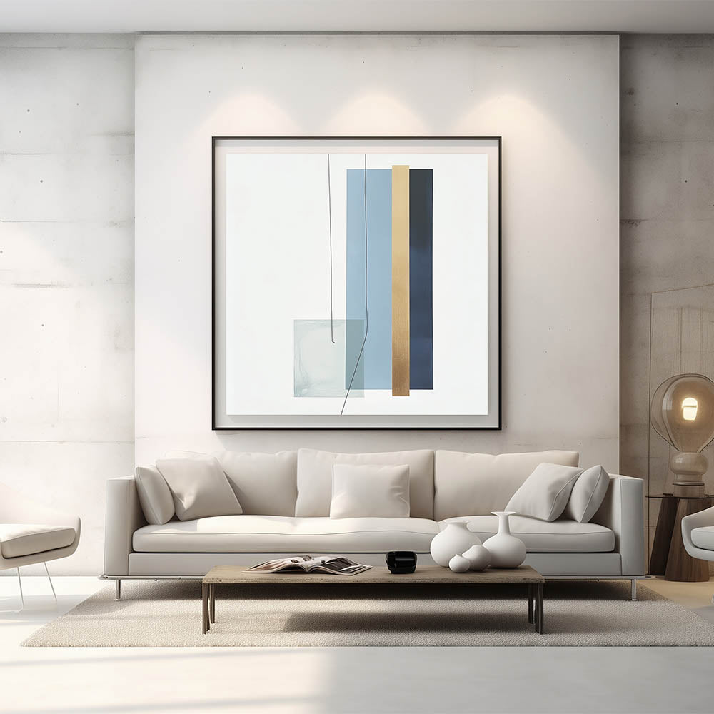 Introduce refined balance and structure to your space with this geometric abstract wall decor. Part of our Modern Abstract collection, this piece features clean vertical lines and layered shapes in soothing tones of light blue, navy, gold, and muted teal. The minimalist arrangement delivers a calm yet impactful presence, ideal for modern homes and workspaces.
