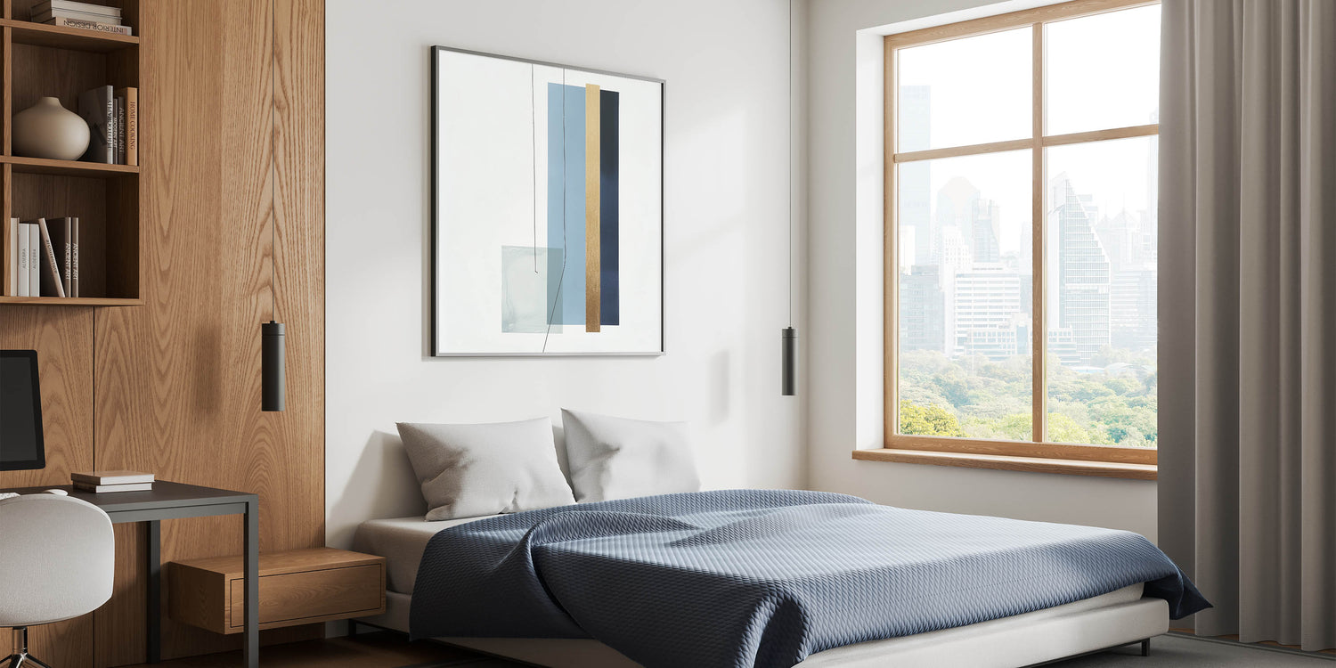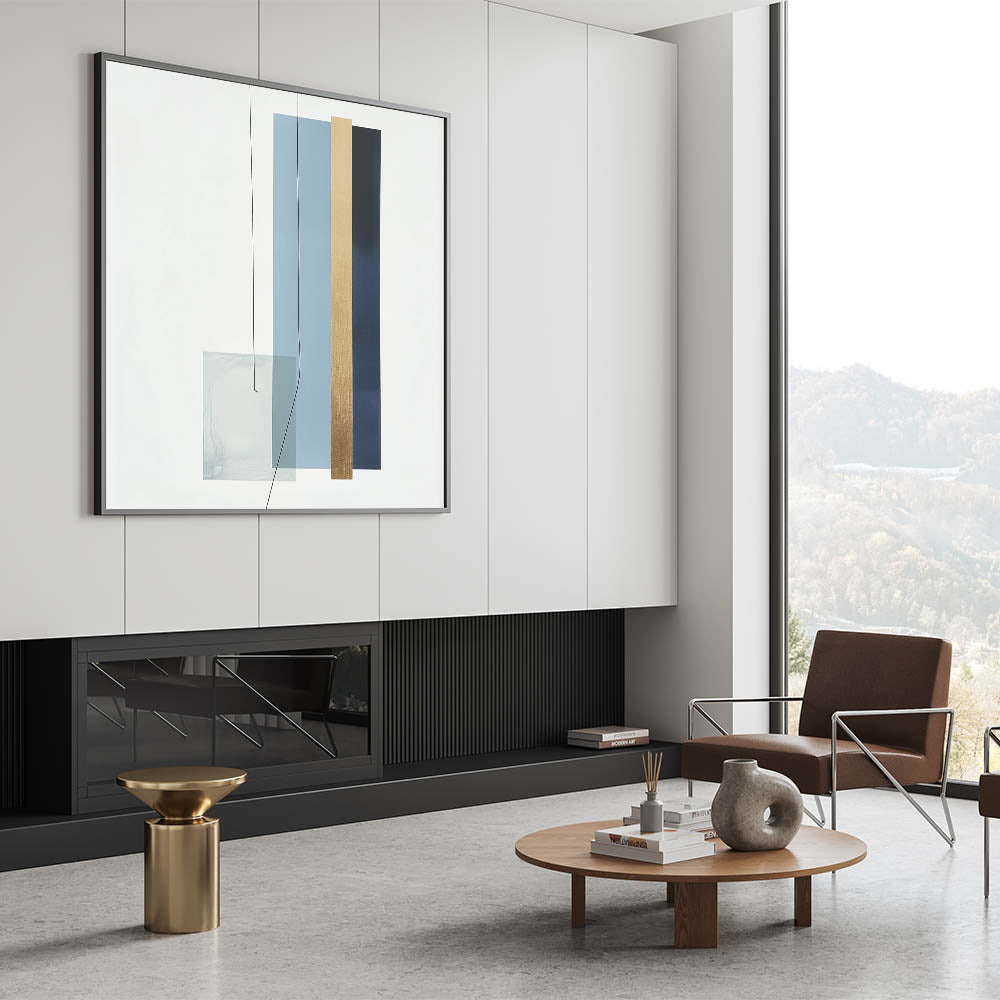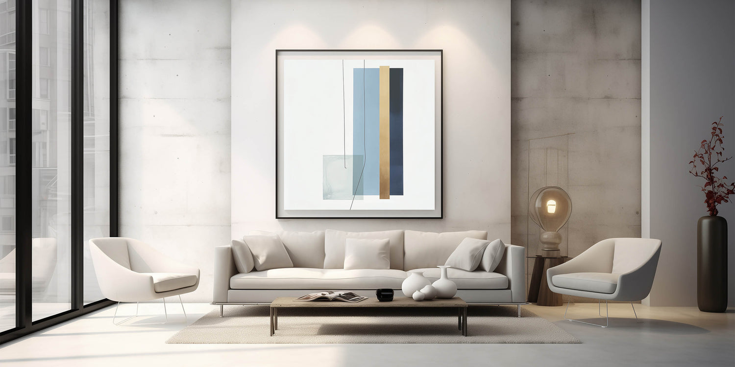 Introduce refined balance and structure to your space with this geometric abstract wall decor. Part of our Modern Abstract collection, this piece features clean vertical lines and layered shapes in soothing tones of light blue, navy, gold, and muted teal. The minimalist arrangement delivers a calm yet impactful presence, ideal for modern homes and workspaces.