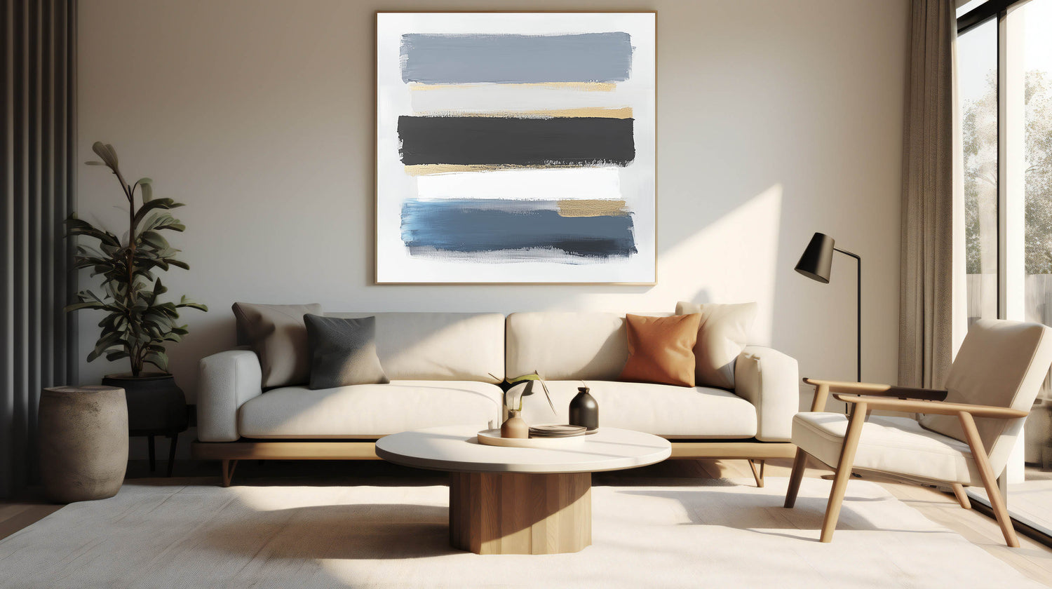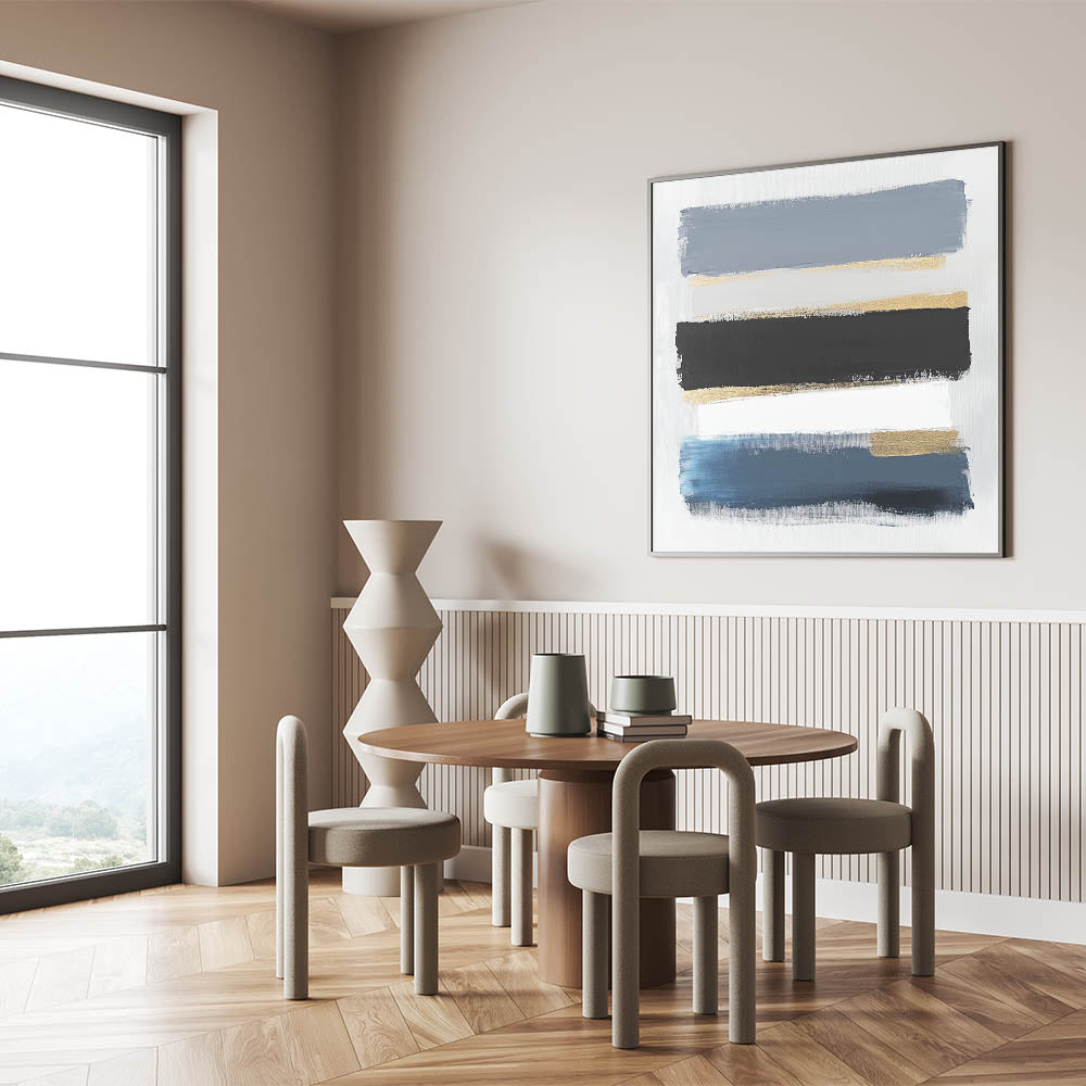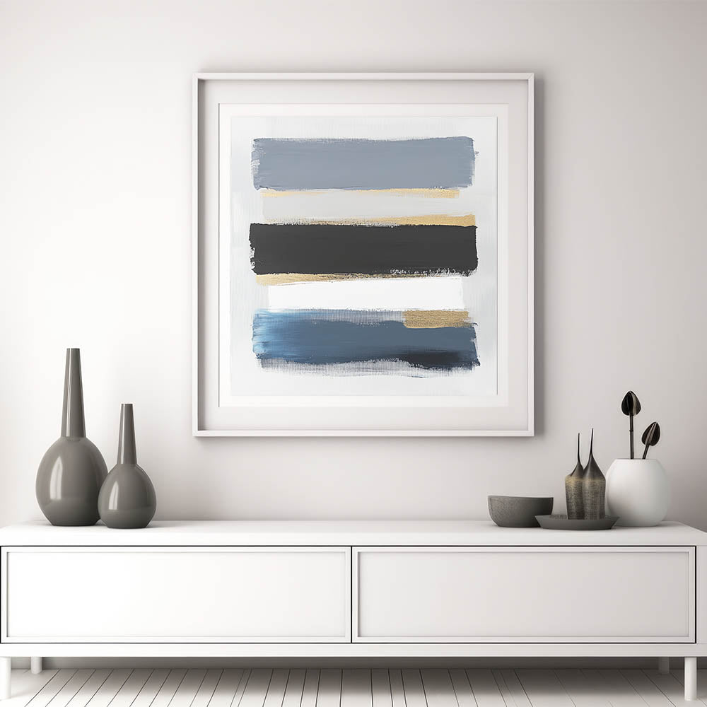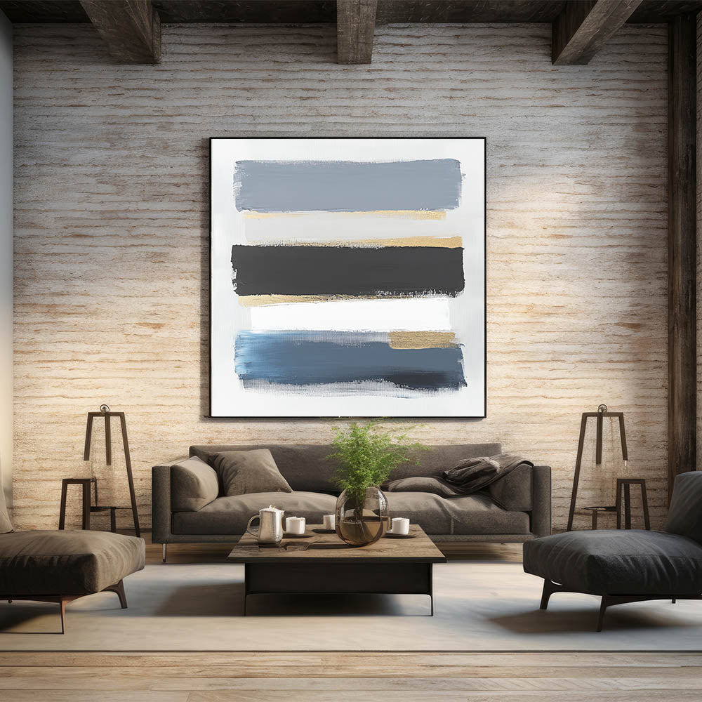 Add movement and modern edge to your space with this geometric abstract wall decor, featuring bold horizontal brushstrokes in rich navy blue, soft gray, black, and white—with radiant gold accents throughout. This expressive modern abstract wall art blends texture with structure, delivering a clean yet powerful composition.