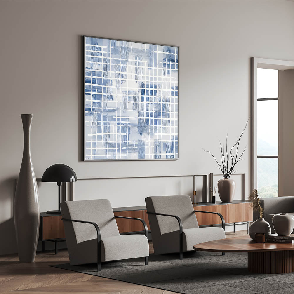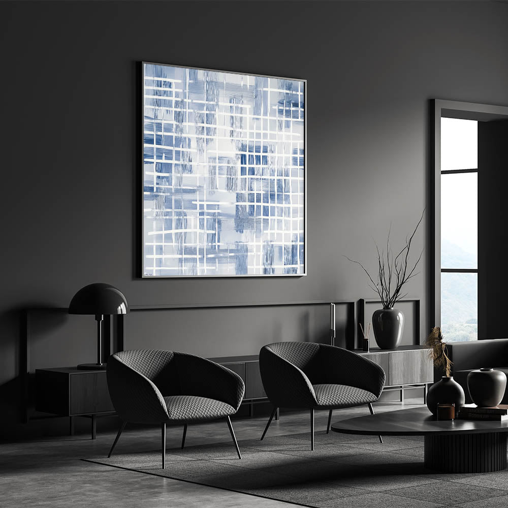 Make a striking visual impact with this piece of large abstract wall art, crafted for those who appreciate bold structure and serene tones. Part of our Modern Abstract Collection, this design showcases a geometric grid overlaying textured brushstrokes in navy, gray-blue, muted blue, and white. The result is a captivating blend of order and motion that brings a sophisticated yet calming aesthetic to any room.