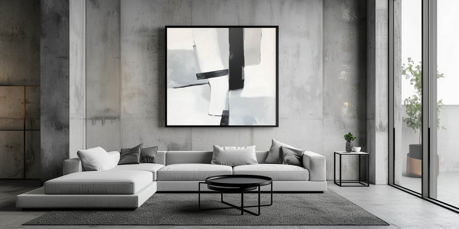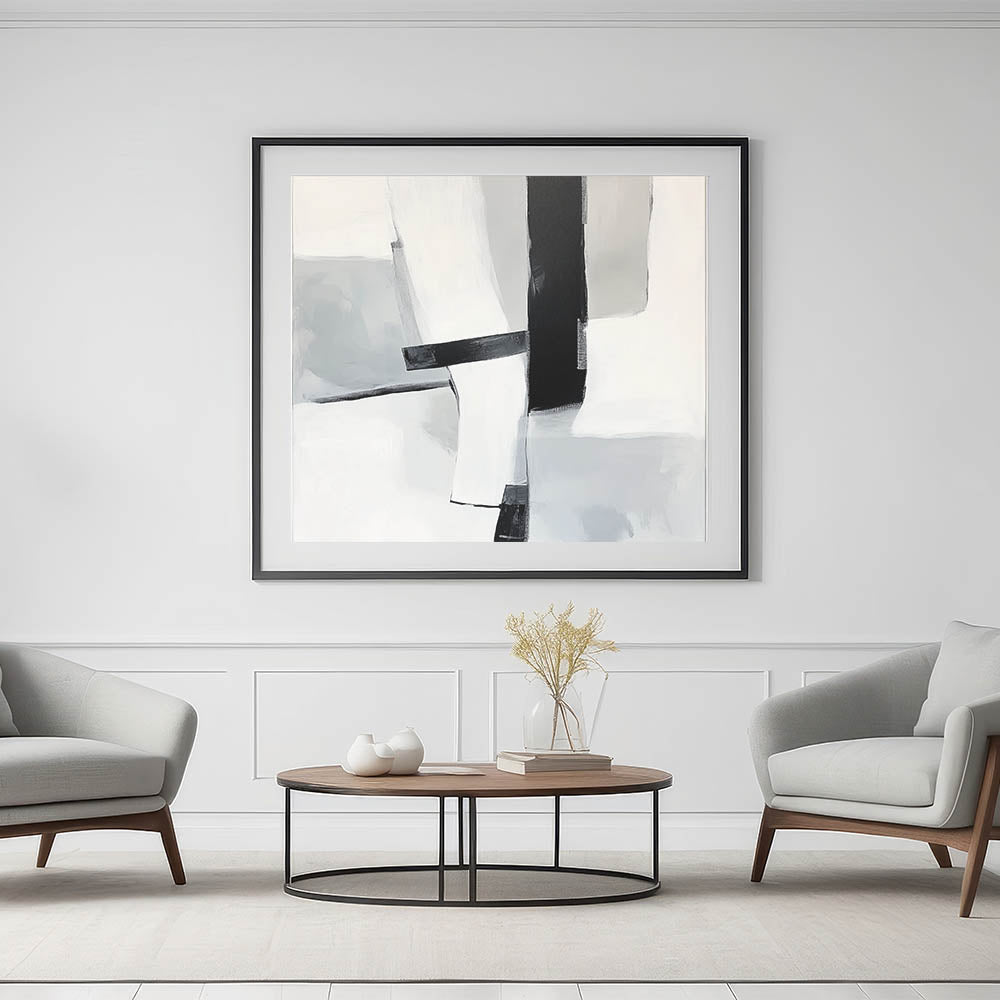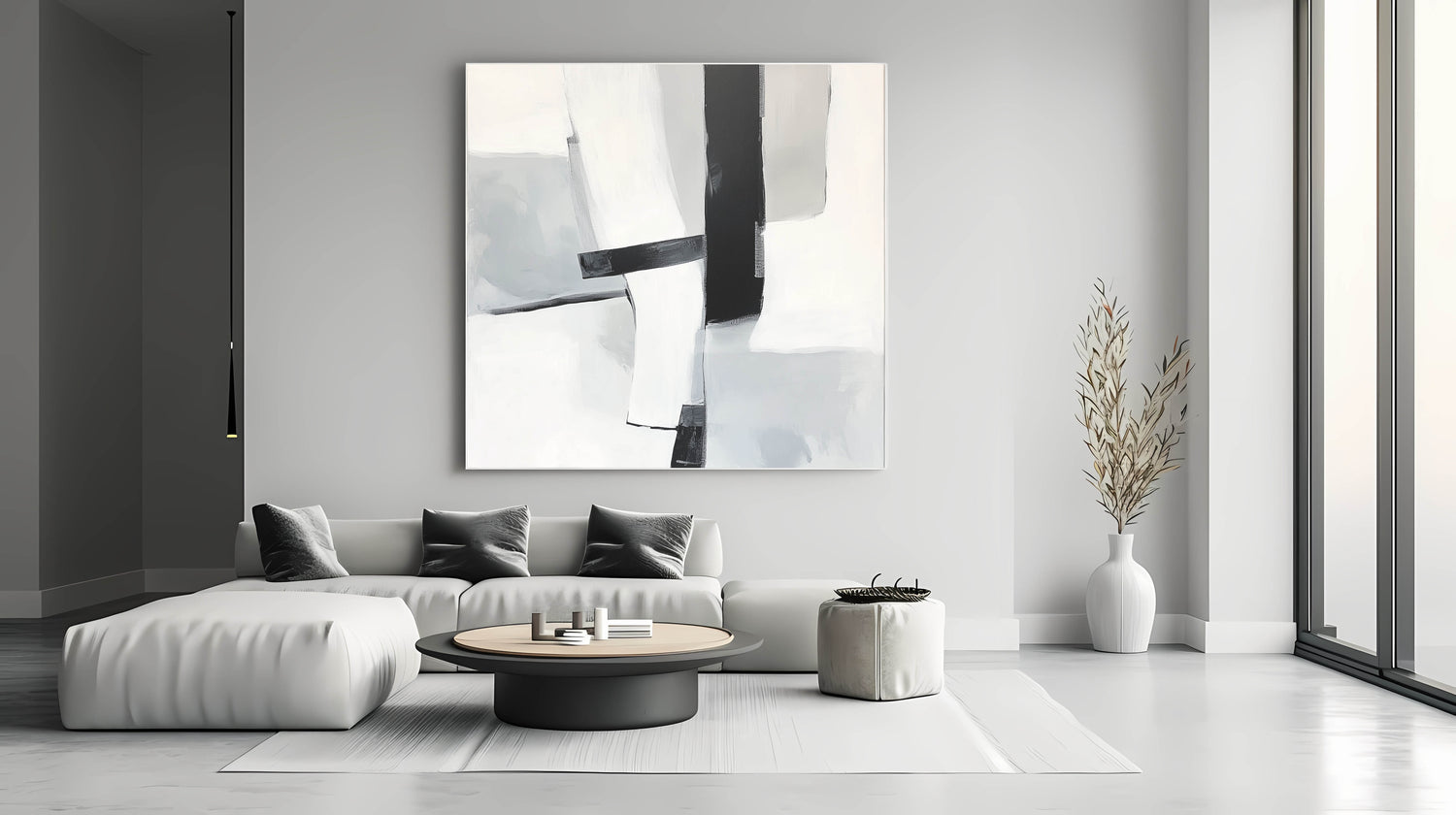 Create a commanding visual presence in your space with this large abstract wall art. Showcasing strong vertical and horizontal black lines over soft white and gray backgrounds, this piece from our Modern Abstract collection is designed to elevate contemporary interiors. Its minimalist layout and bold contrasts make it an impactful statement for any wall.