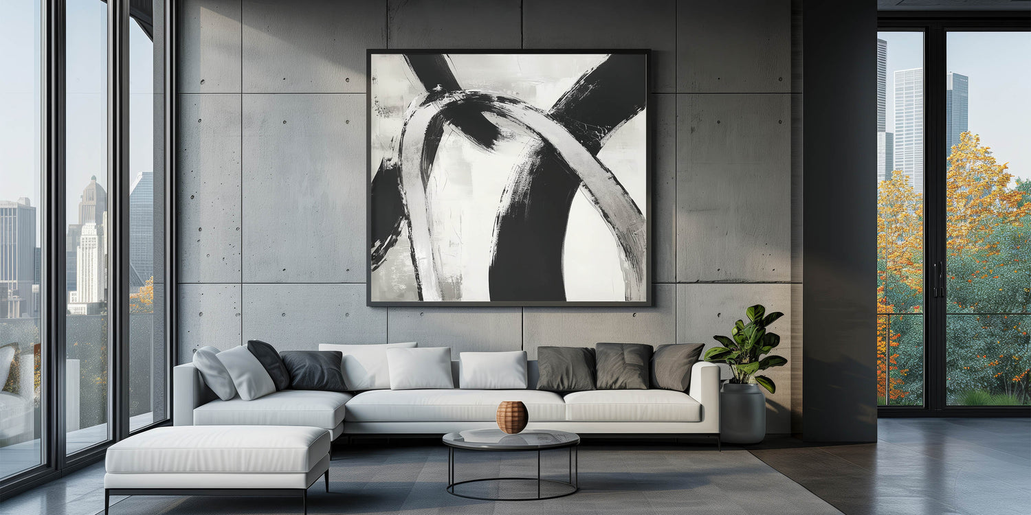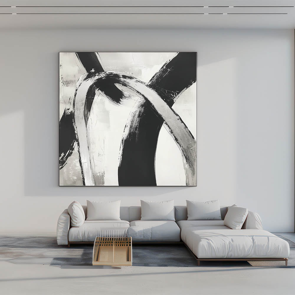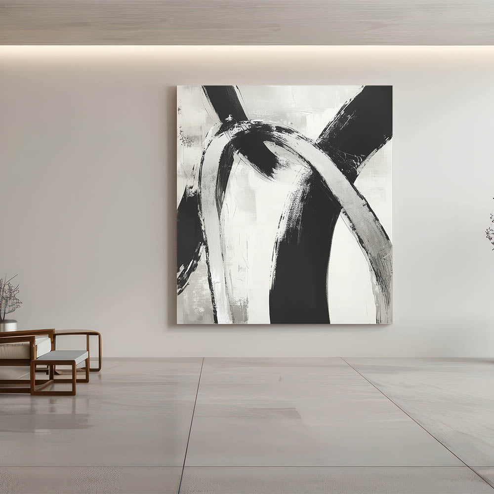 This large abstract wall art captures power and simplicity in bold strokes. Its black, white, and gray tones flow with intention, adding depth and structure. Designed for modern spaces, it complements minimalist and contemporary styles alike. A true statement piece that commands attention.