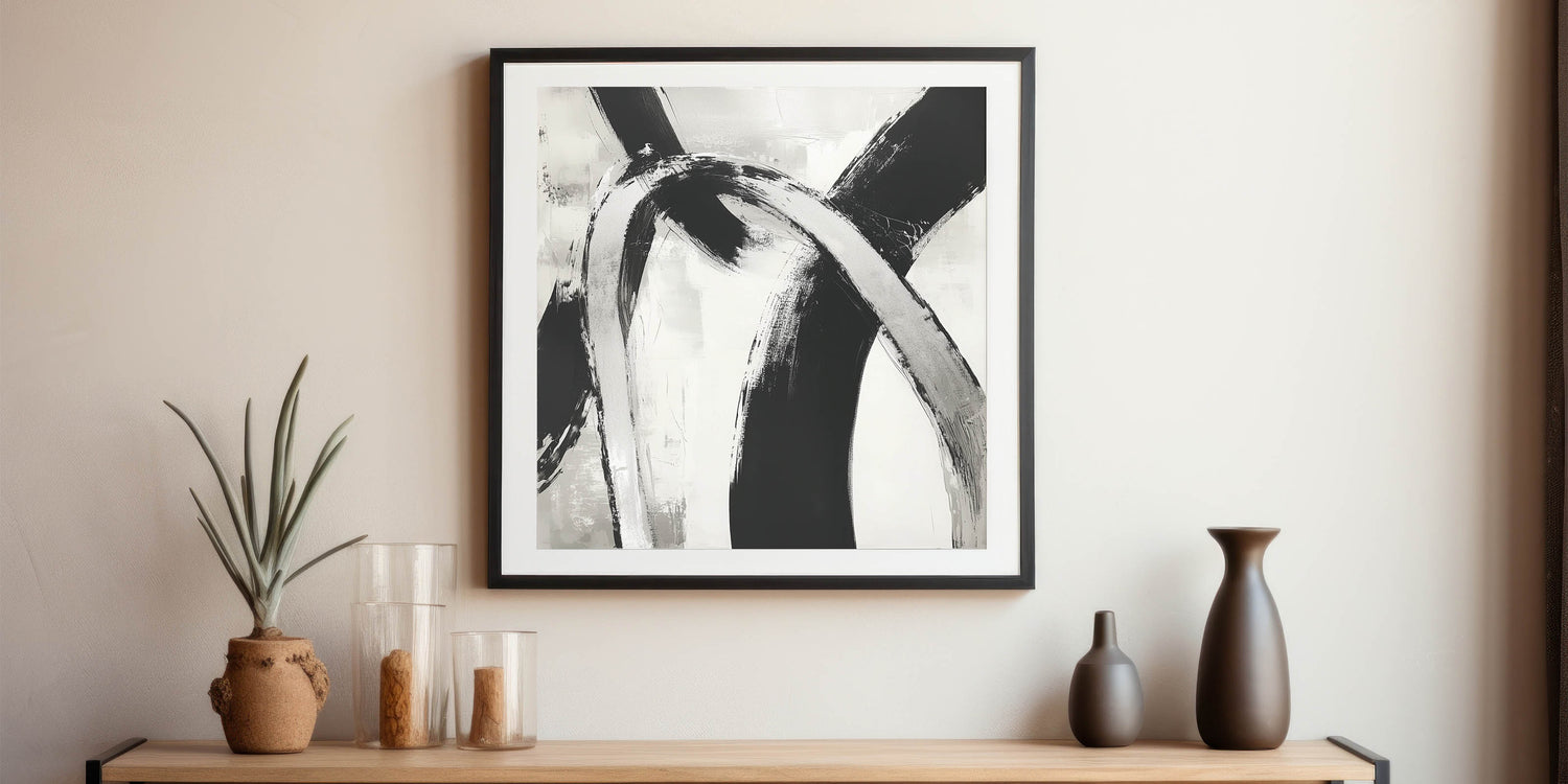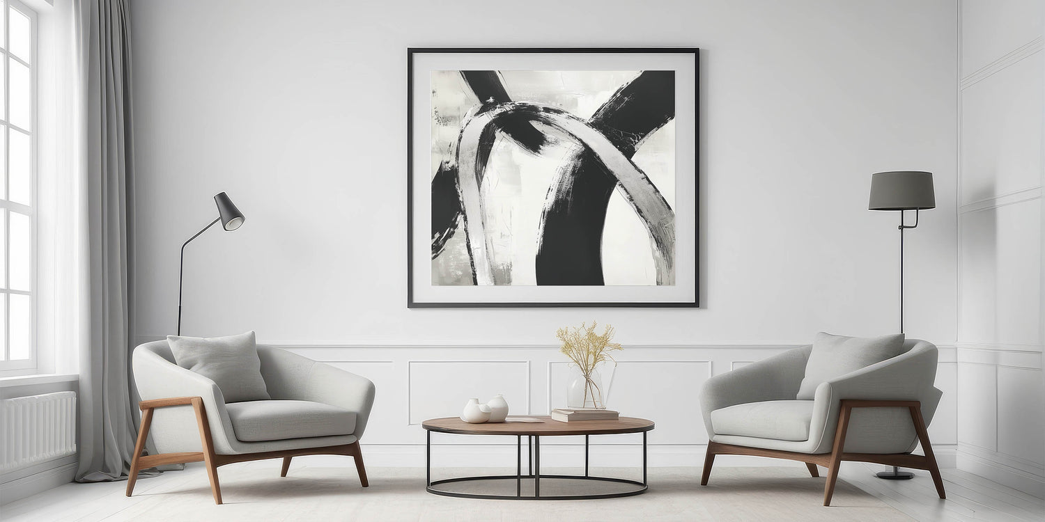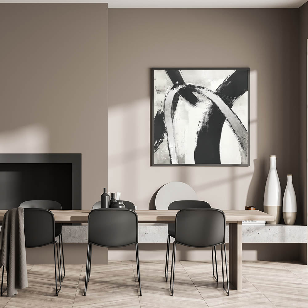 This large abstract wall art captures power and simplicity in bold strokes. Its black, white, and gray tones flow with intention, adding depth and structure. Designed for modern spaces, it complements minimalist and contemporary styles alike. A true statement piece that commands attention.