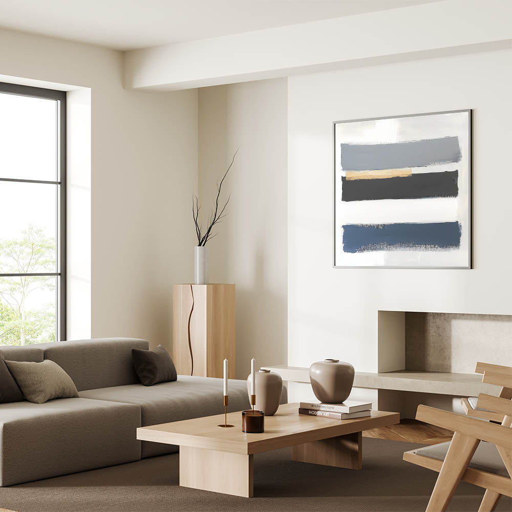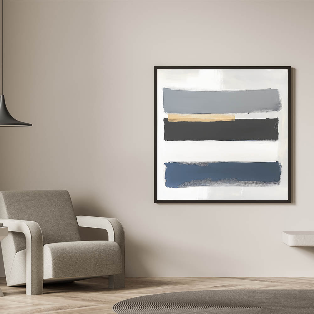 Elevate your space with the strong simplicity of this large abstract wall art, designed with layered brushstroke textures in navy blue, cool gray, deep black, and warm white—accented by a single bold stroke of gold. This piece from the Modern Abstract Collection delivers a perfect balance of movement, structure, and tonal contrast for sophisticated spaces.
