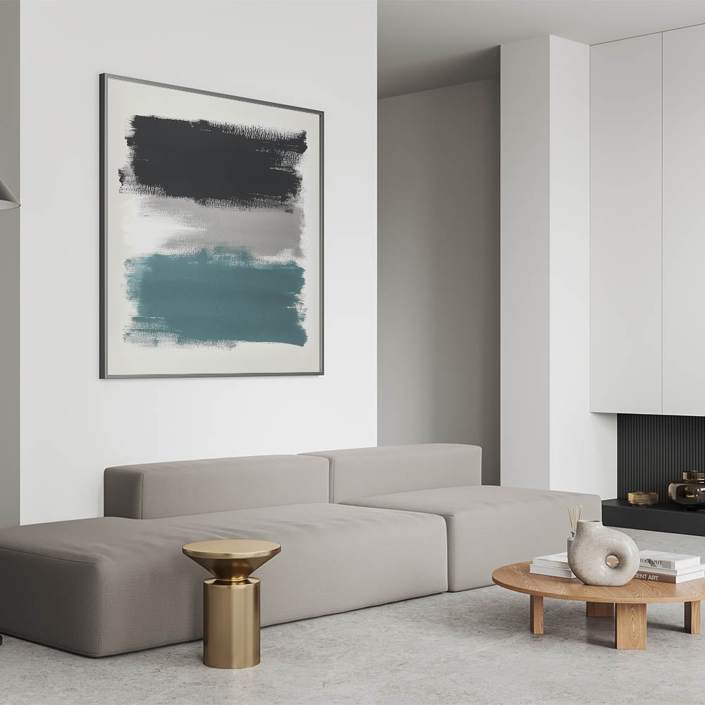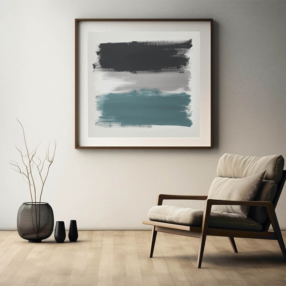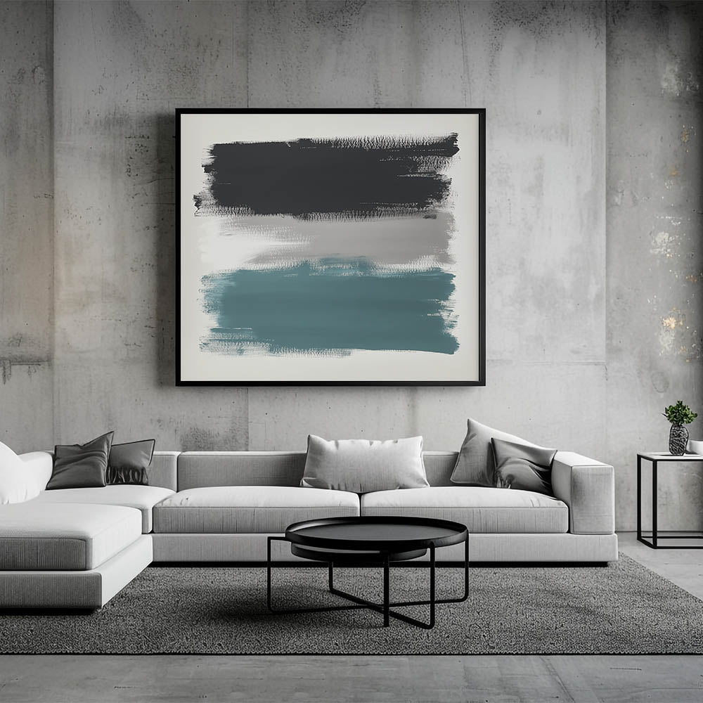 Make a bold visual statement with this large abstract wall art, featuring wide, textured brushstrokes in teal, charcoal black, and soft gray. This modern piece from the Modern Abstract Collection delivers striking contrast with a minimal composition—perfect for expansive walls and open-plan spaces.