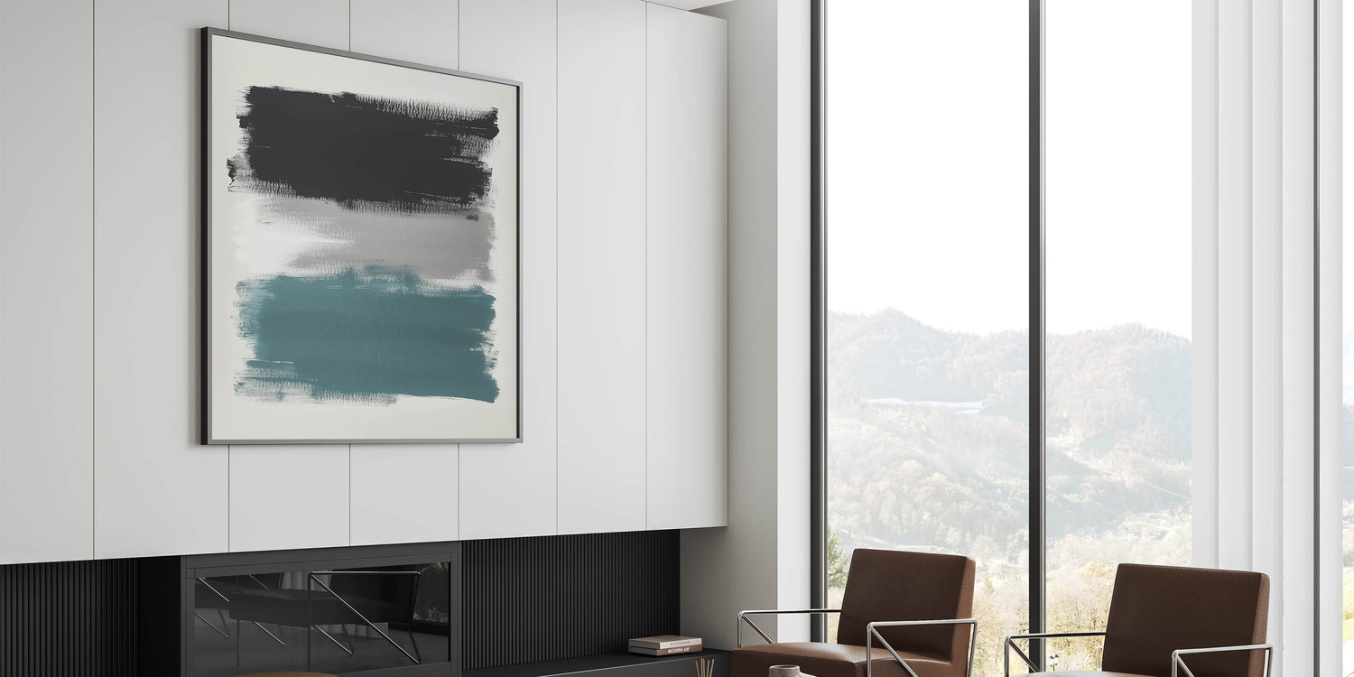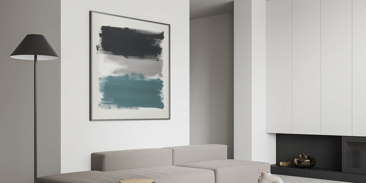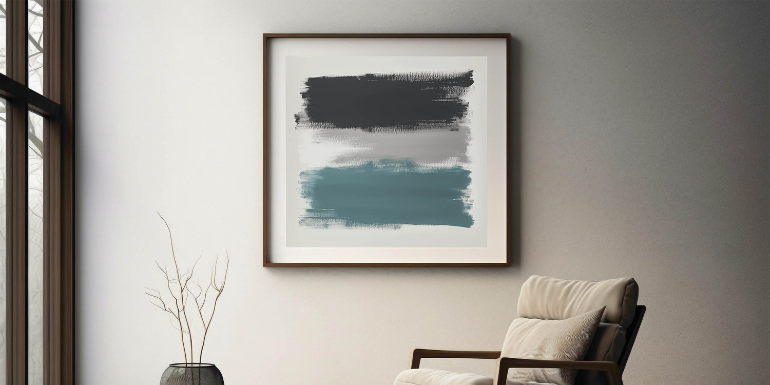 Make a bold visual statement with this large abstract wall art, featuring wide, textured brushstrokes in teal, charcoal black, and soft gray. This modern piece from the Modern Abstract Collection delivers striking contrast with a minimal composition—perfect for expansive walls and open-plan spaces.