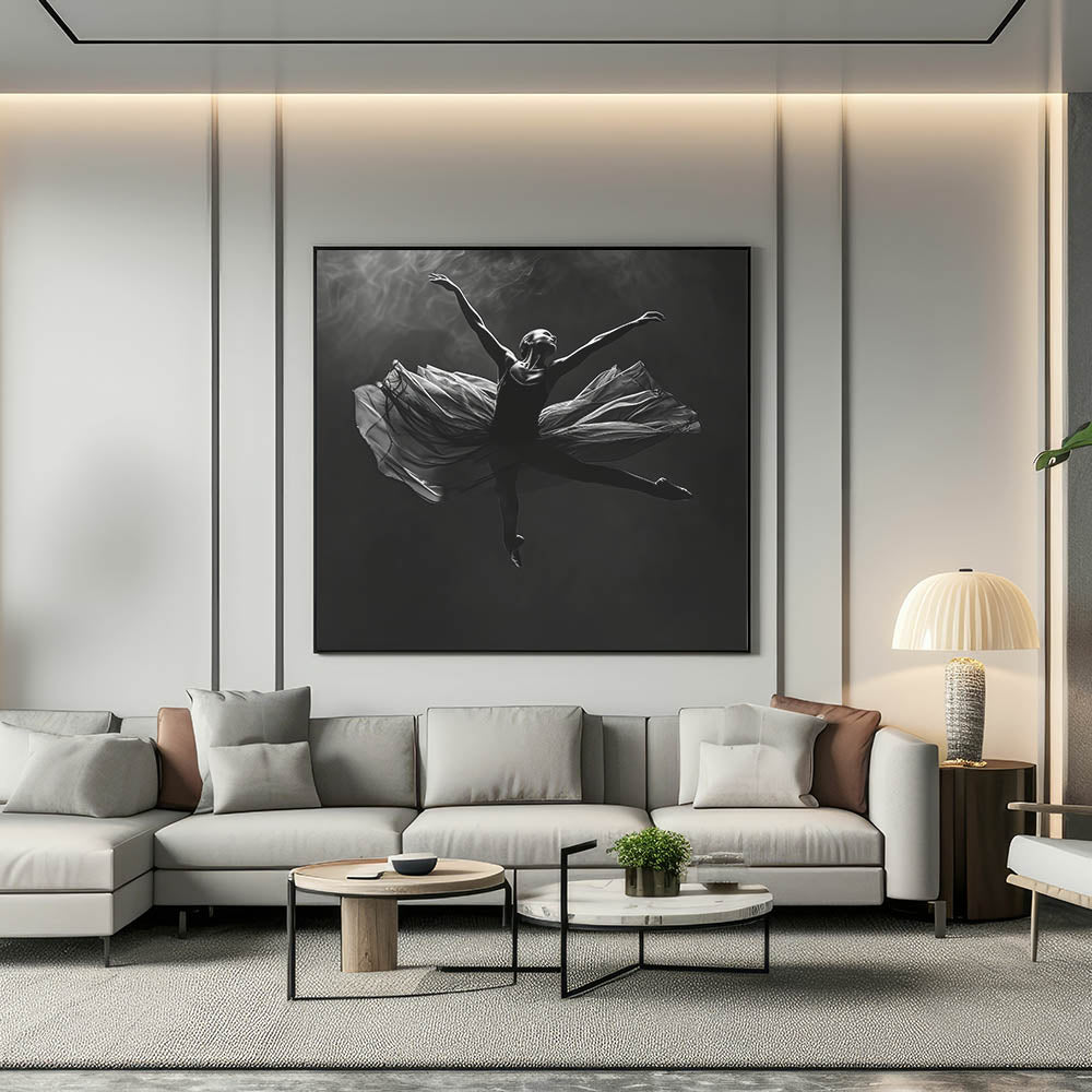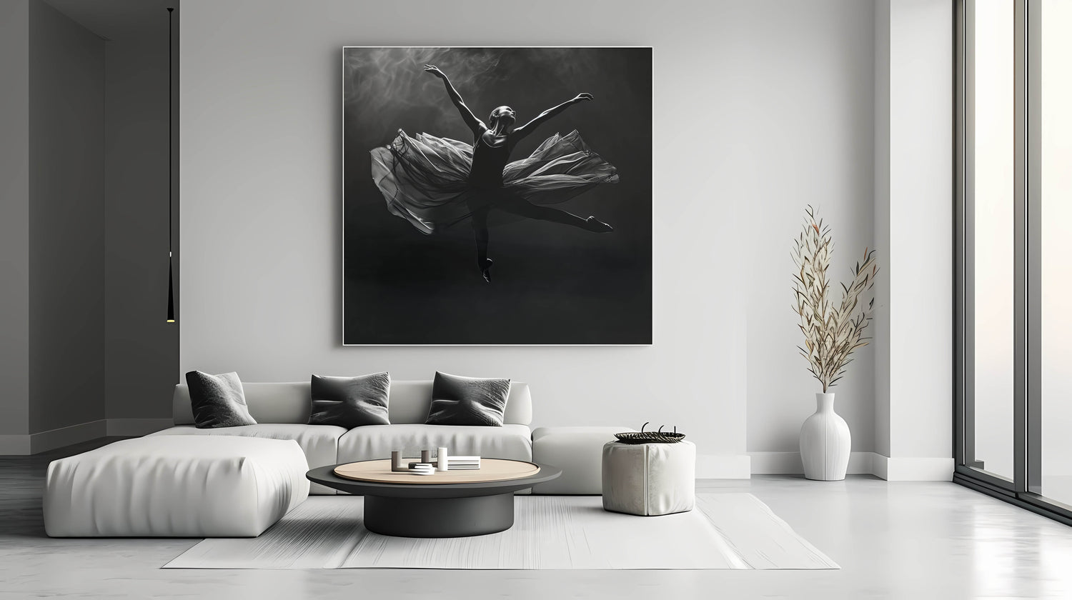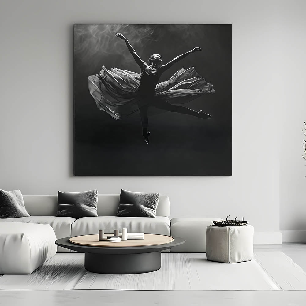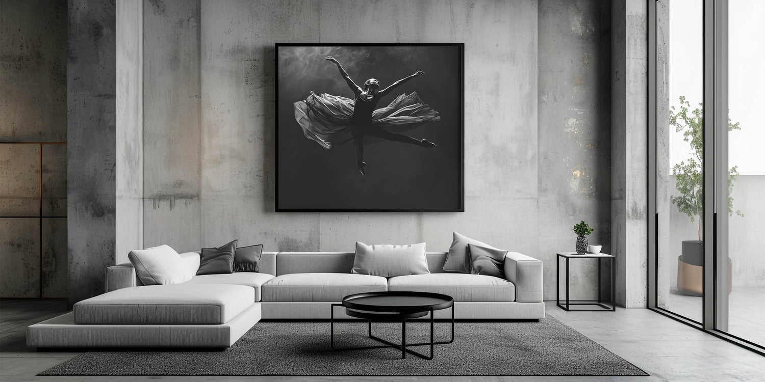 This breathtaking artwork captures a ballerina mid-leap, suspended in a moment of ethereal grace. The flow of the skirt and the crisp lighting highlight emotional strength and elegance. A stunning representation of emotive photography and fine art movement.