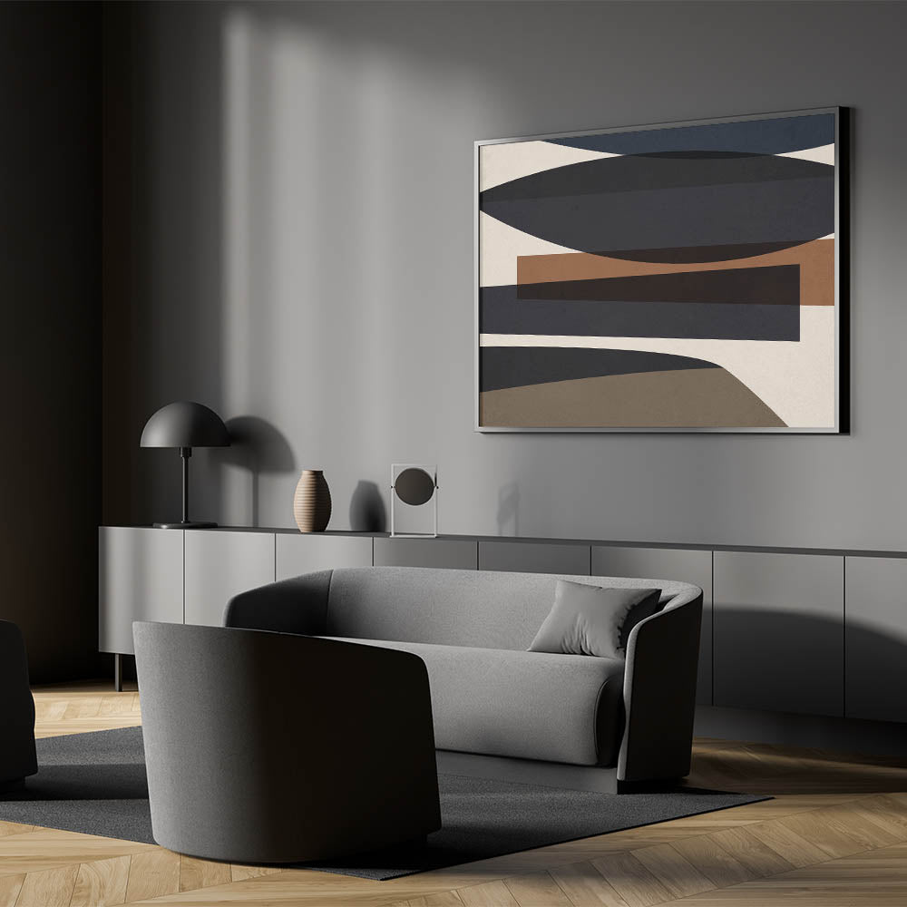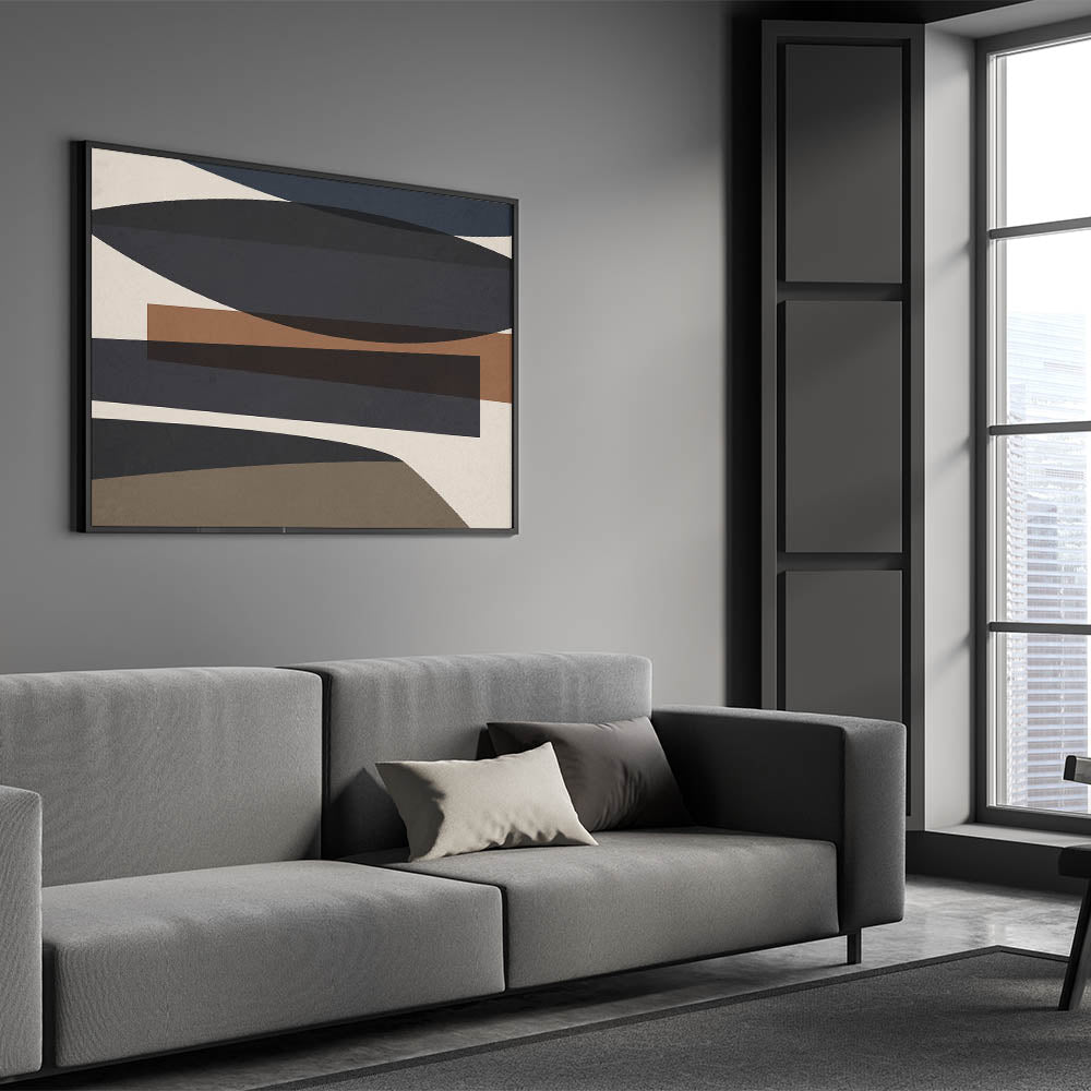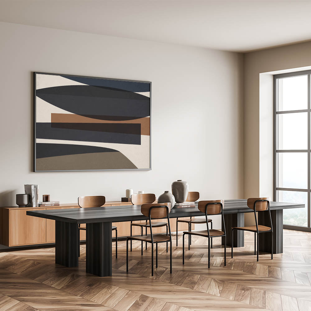 Linear Motion is a sleek and structured design from the Earthen Harmony Abstracts collection. This piece of minimalist wall decor showcases smooth, layered shapes in a bold palette of black, navy blue, taupe, and cream. The curved and rectangular forms evoke a sense of motion and balance, making it ideal for modern interiors with a minimalist or contemporary edge.